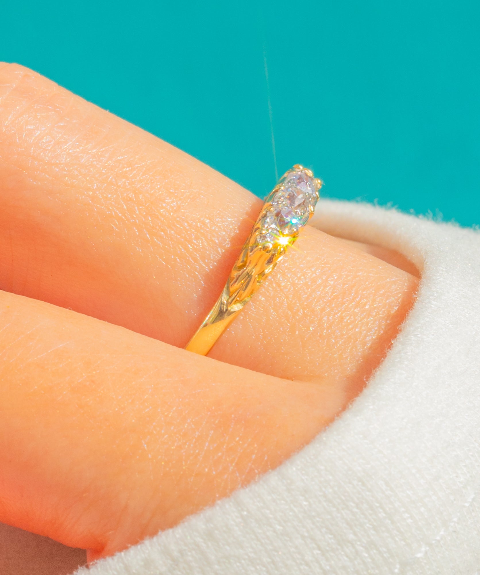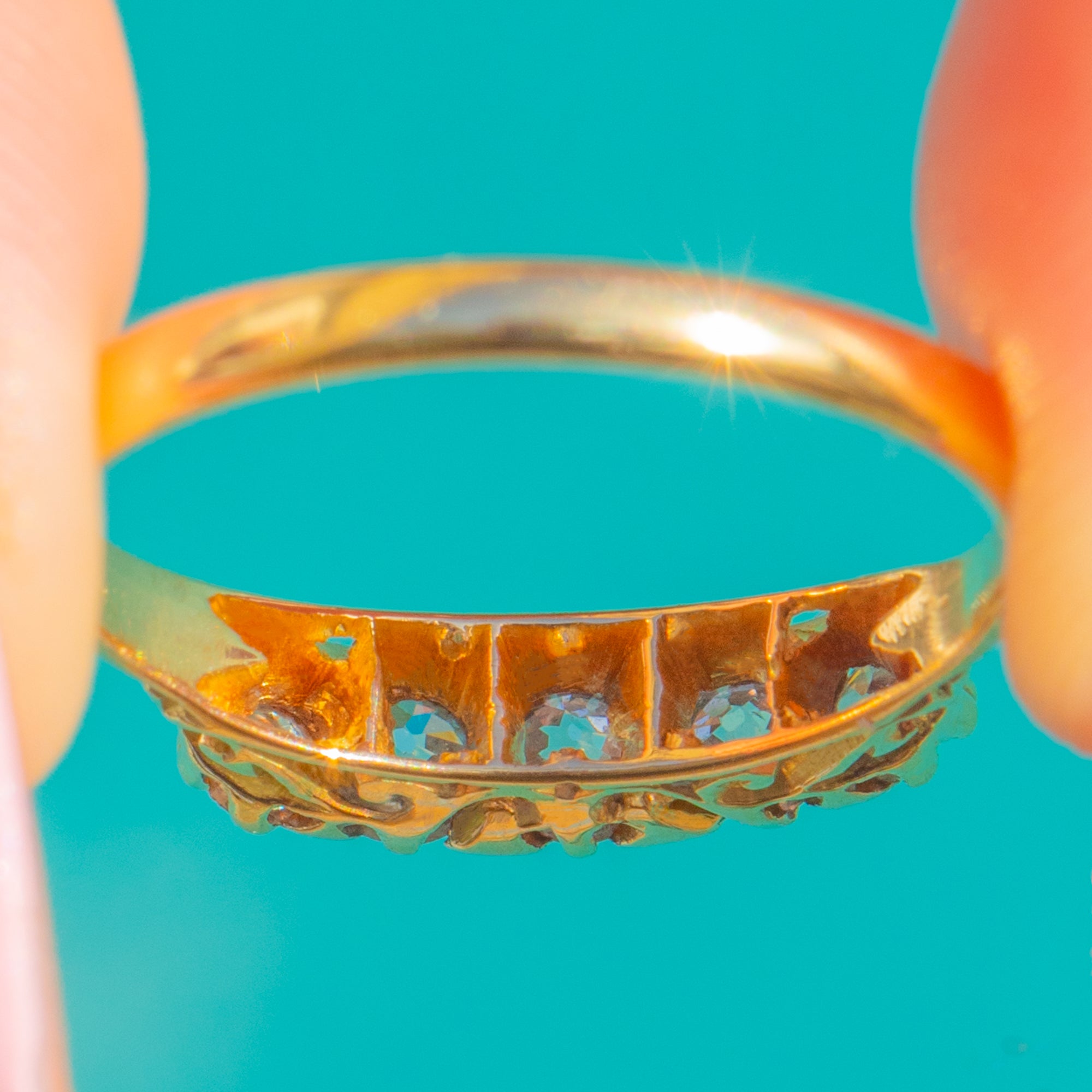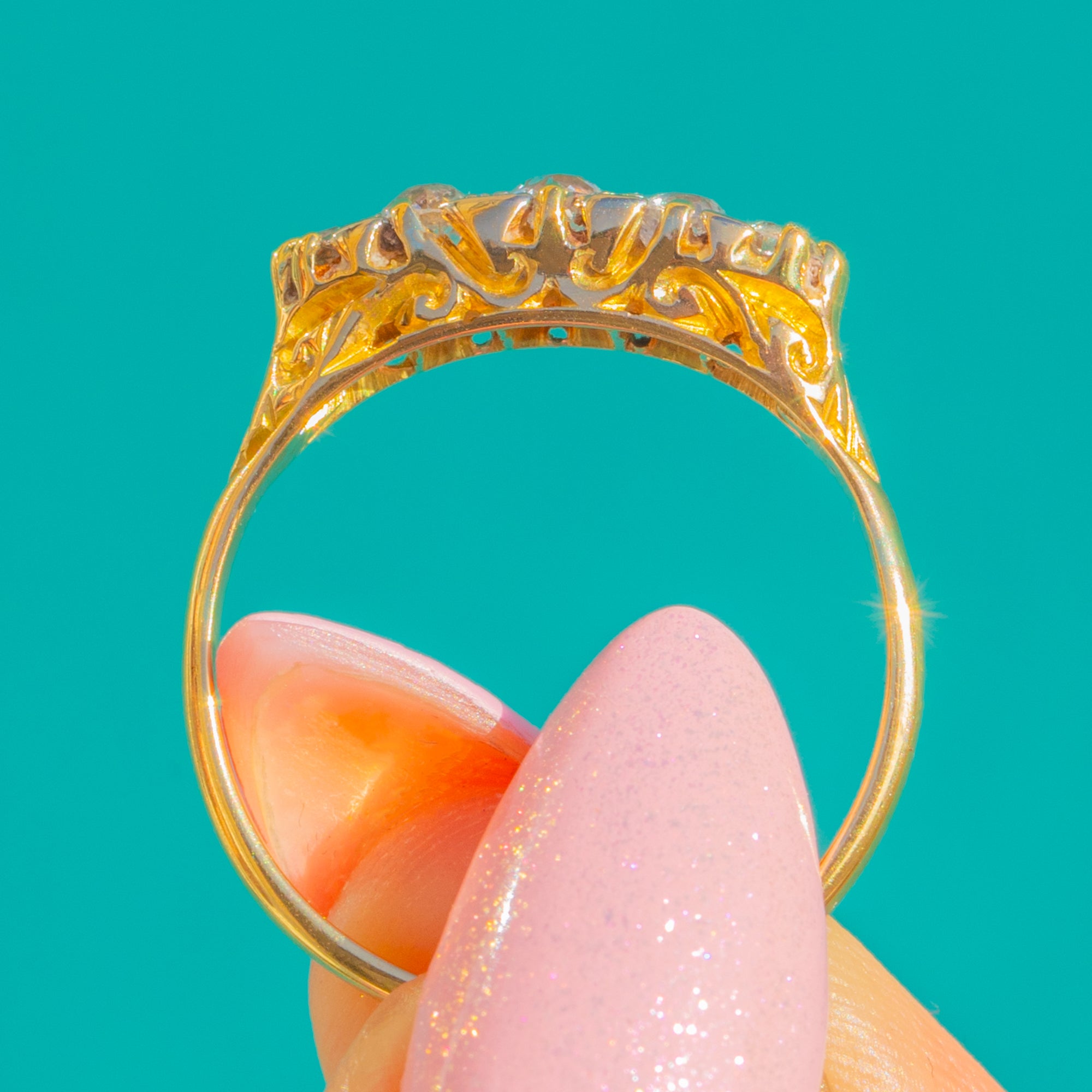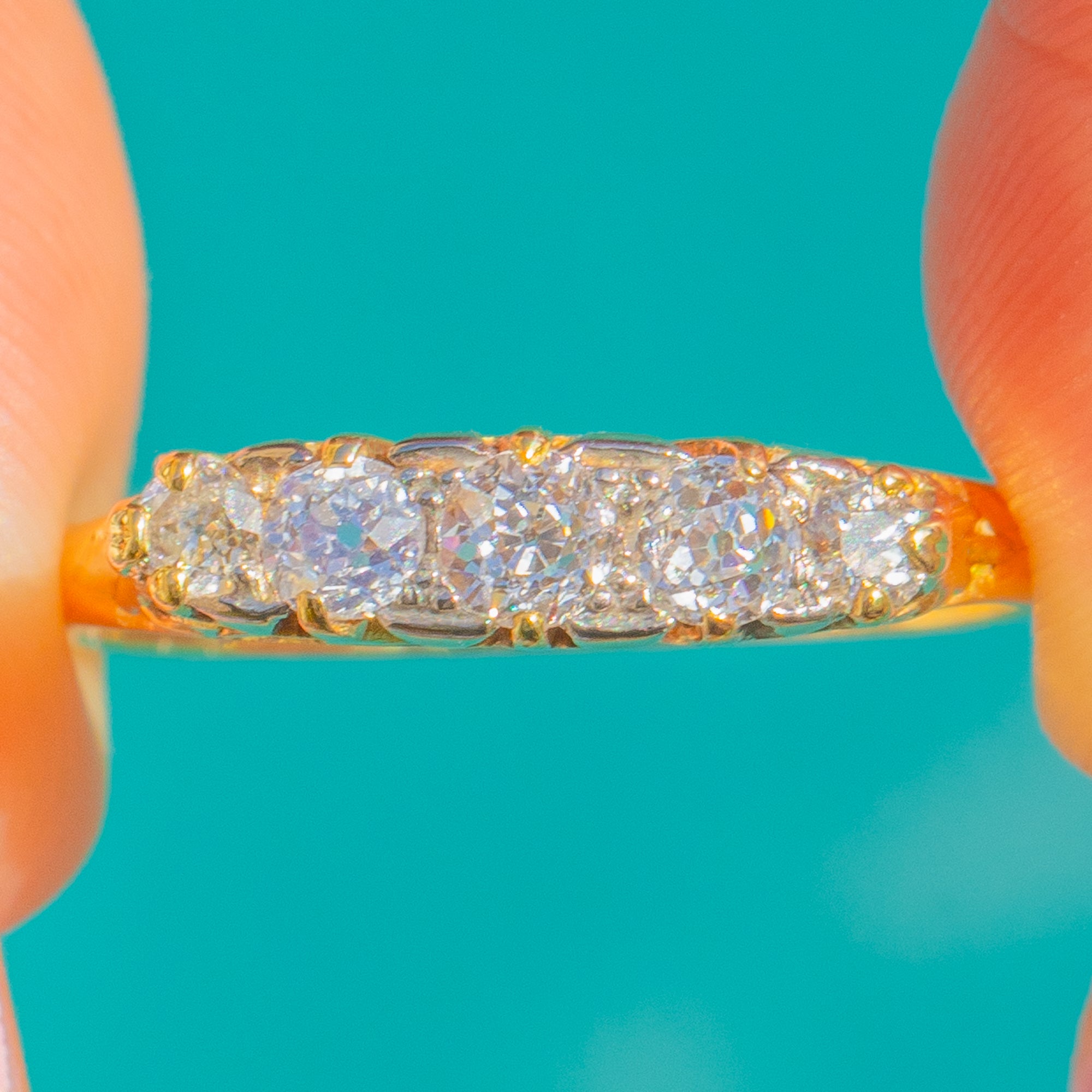 Ein zeitloser Edwardian-Fünfstein-Diamantring, kunstvoll gefertigt aus edlem 18ct Gold. Fünf Old Mine Cut Diamanten funkeln in einer eleganten, linearen Anordnung, ihr lebhaftes Feuer wird durch eine schlanke, kunstvoll verzierte Krone betont.