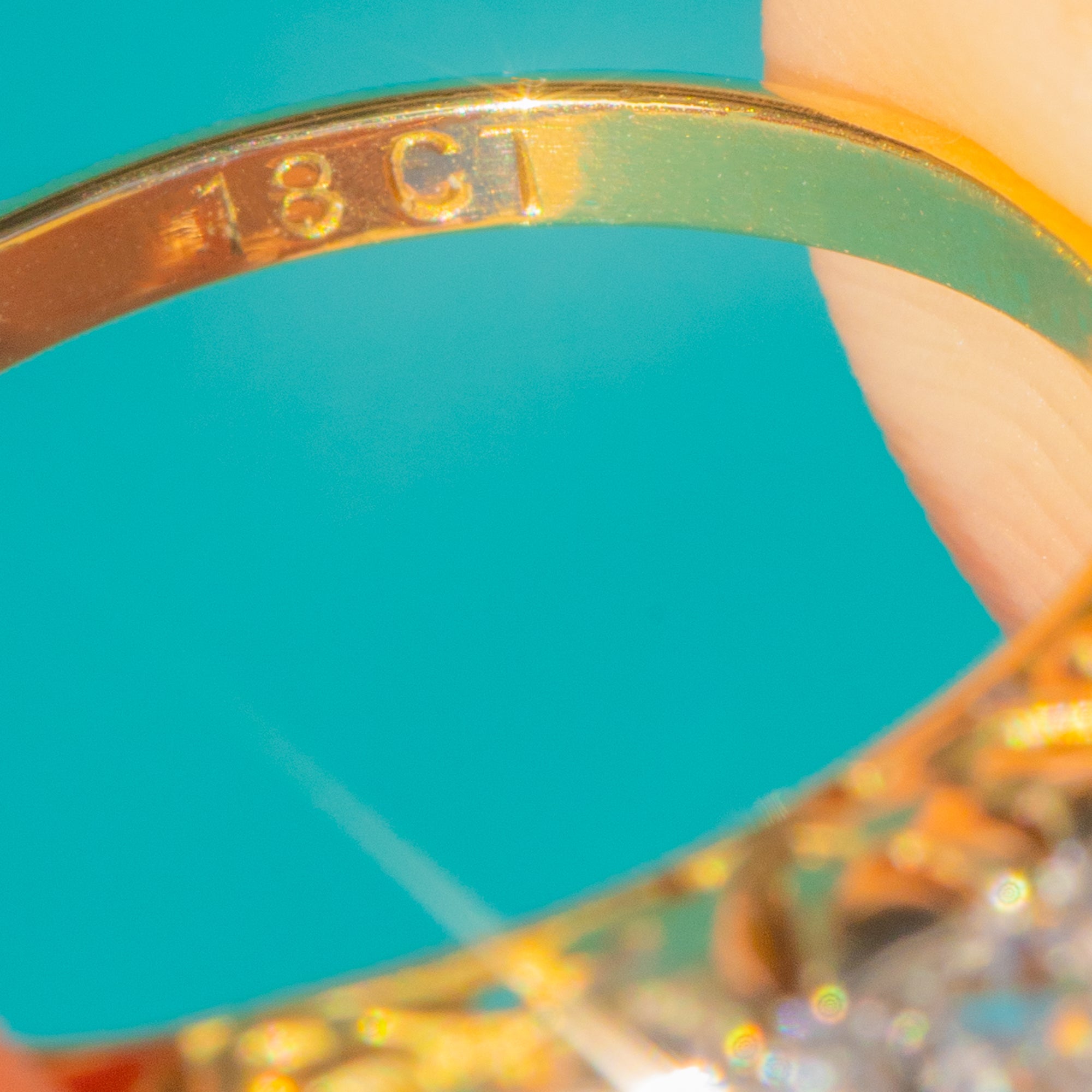 EXZELLENT: Die Diamanten sind leuchtend und sicher gefasst, ohne erkennbare Absplitterungen oder Kratzer. Die schlanke 18ct Goldschiene und die dekorativen Fassungen sind klar konturiert und zeigen nur leichte Gebrauchsspuren. Keine offensichtlichen Hinweise auf Größenänderungen oder Restaurierungen sichtbar.