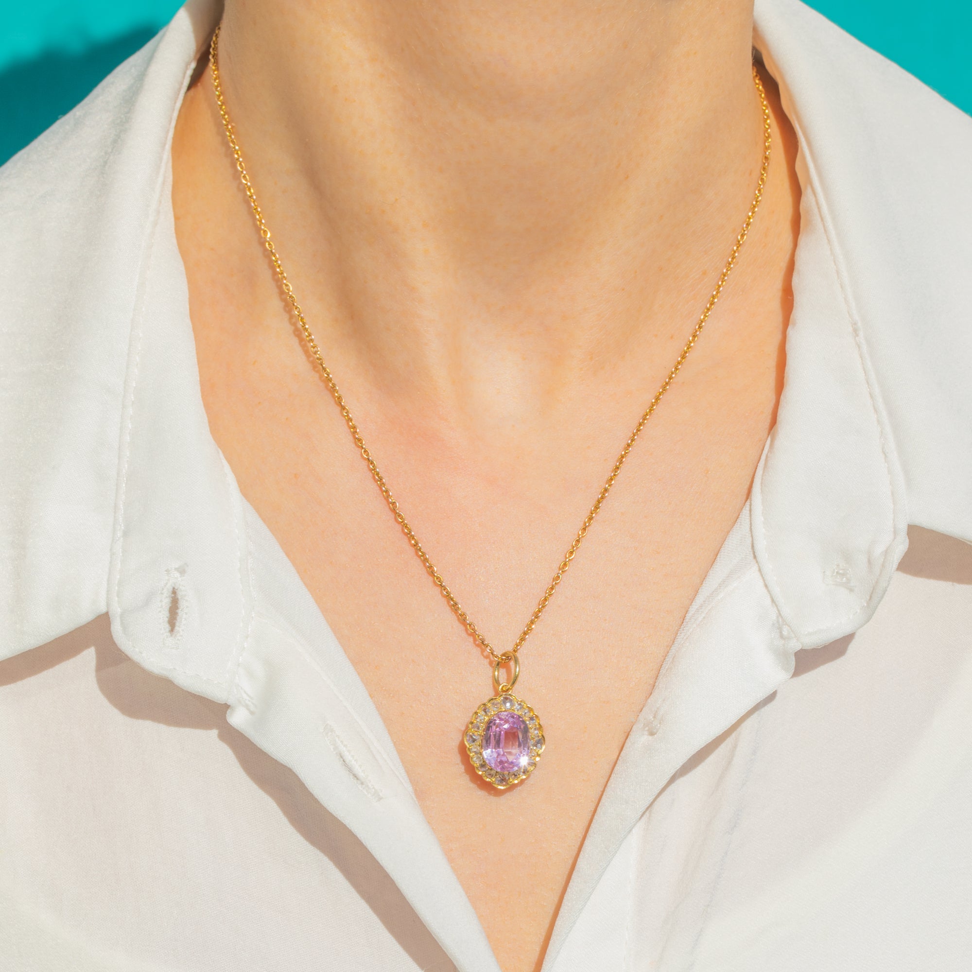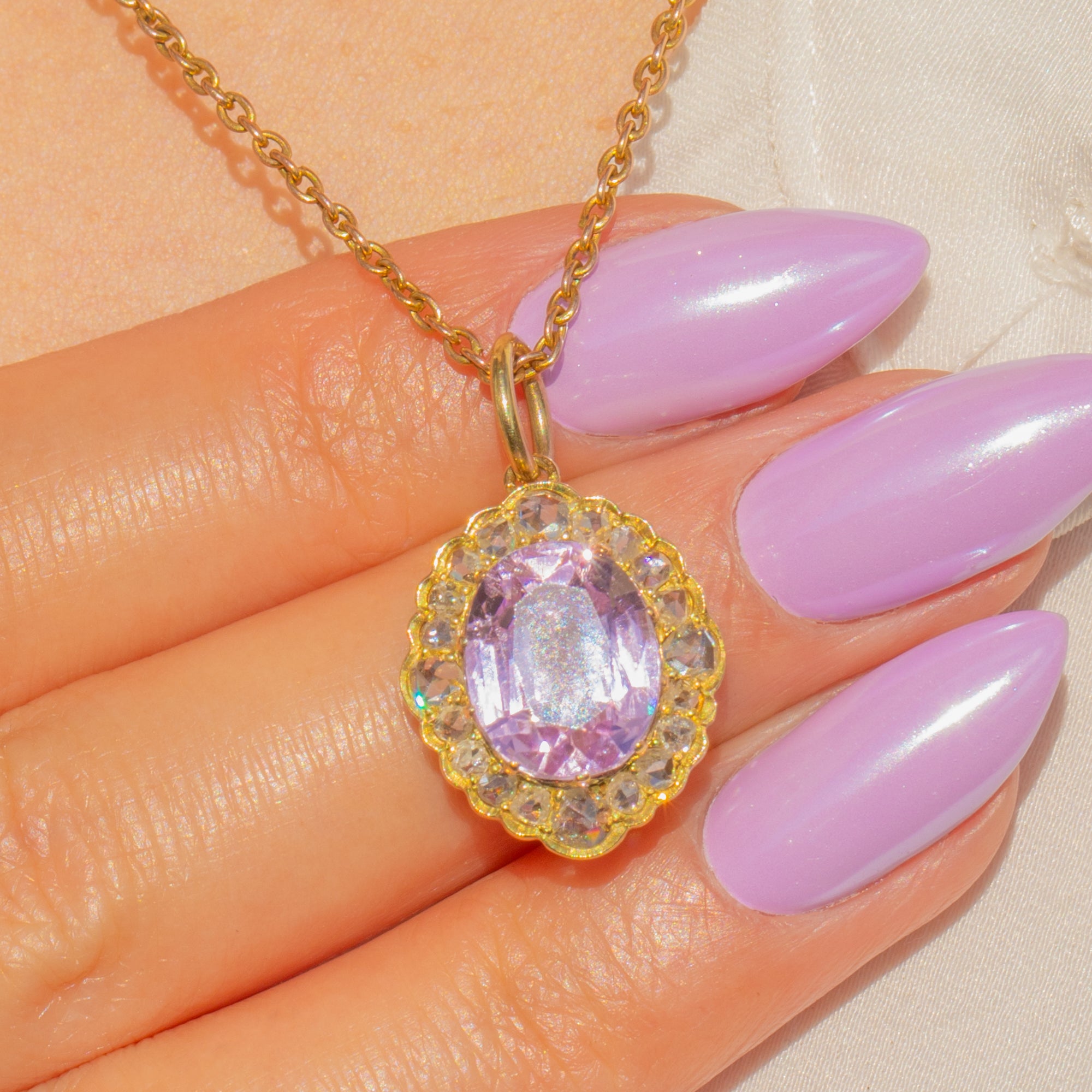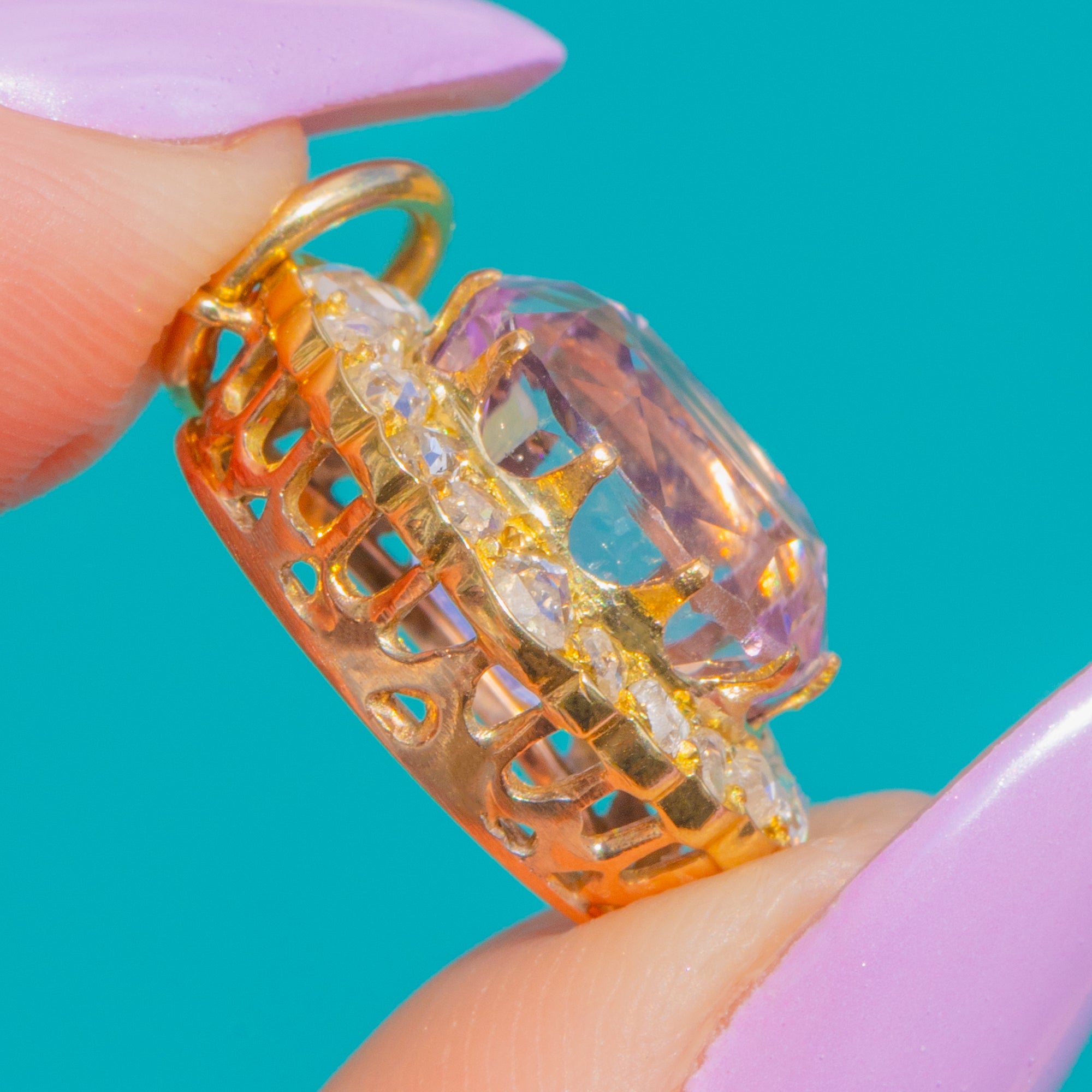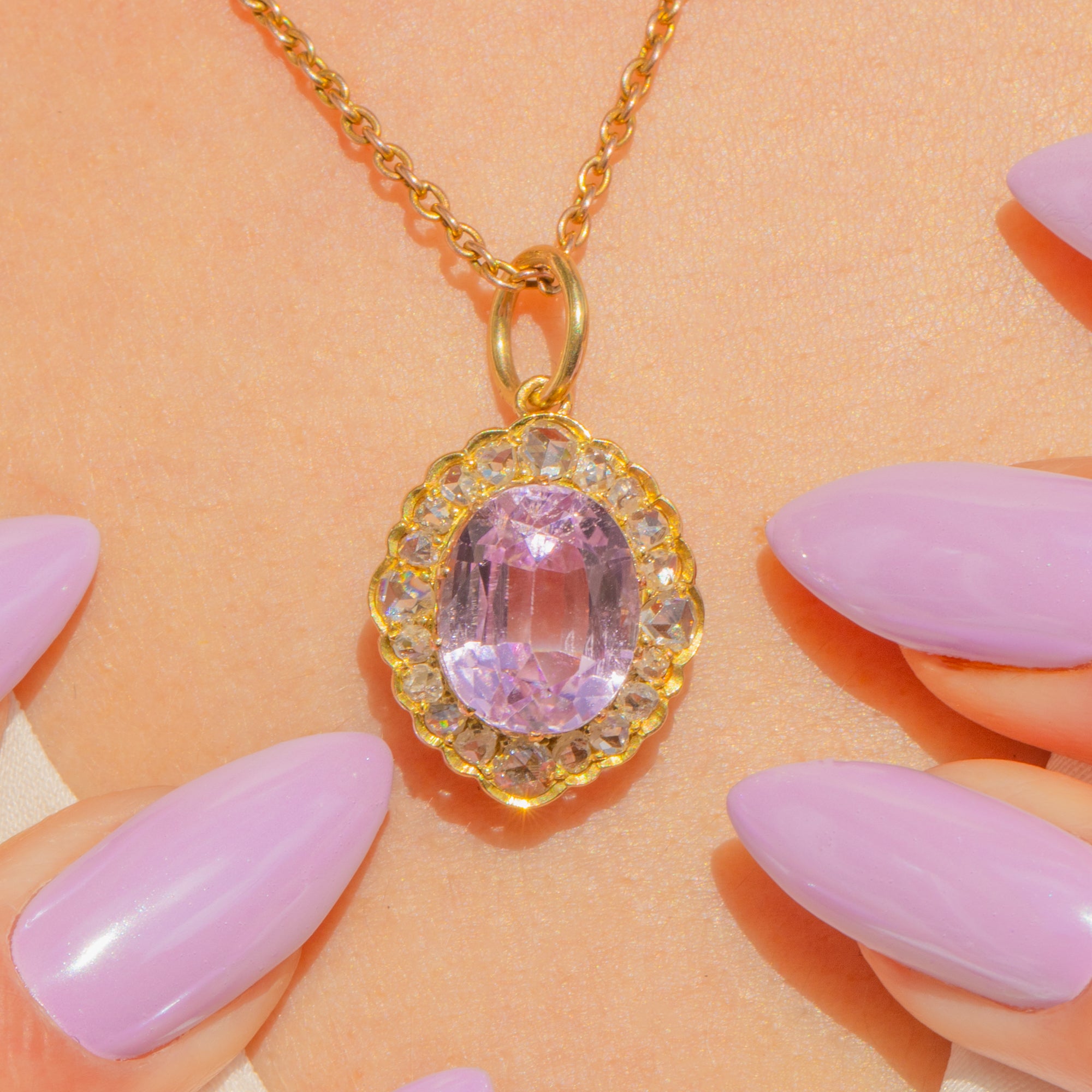 Ein leuchtender 3,80ct natürlicher Kunzit in romantischem Pink-Lila steht im Mittelpunkt, umrahmt von einem 0,40ct Halo aus funkelnden Diamanten im Rosenschliff, gefasst in warmem 15ct Gold. Die gewellte Cluster-Silhouette und das filigrane Durchbruchdekor spiegeln die raffinierte Eleganz der späten Victorian bis Edwardian Epoche wider, während das pastellfarbene Leuchten des Kunzits eine sanfte, ätherische Ausstrahlung verleiht. Wie bei allen Rosenschliffen erschweren die unregelmäßigen Facettenmuster eine exakte Karatbestimmung; das angegebene Diamantgewicht ist unsere beste Schätzung, solange die Steine gefasst sind.