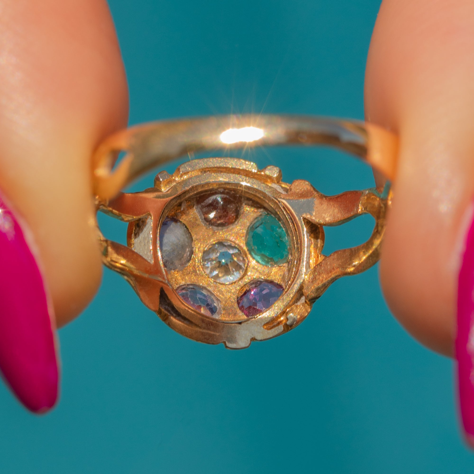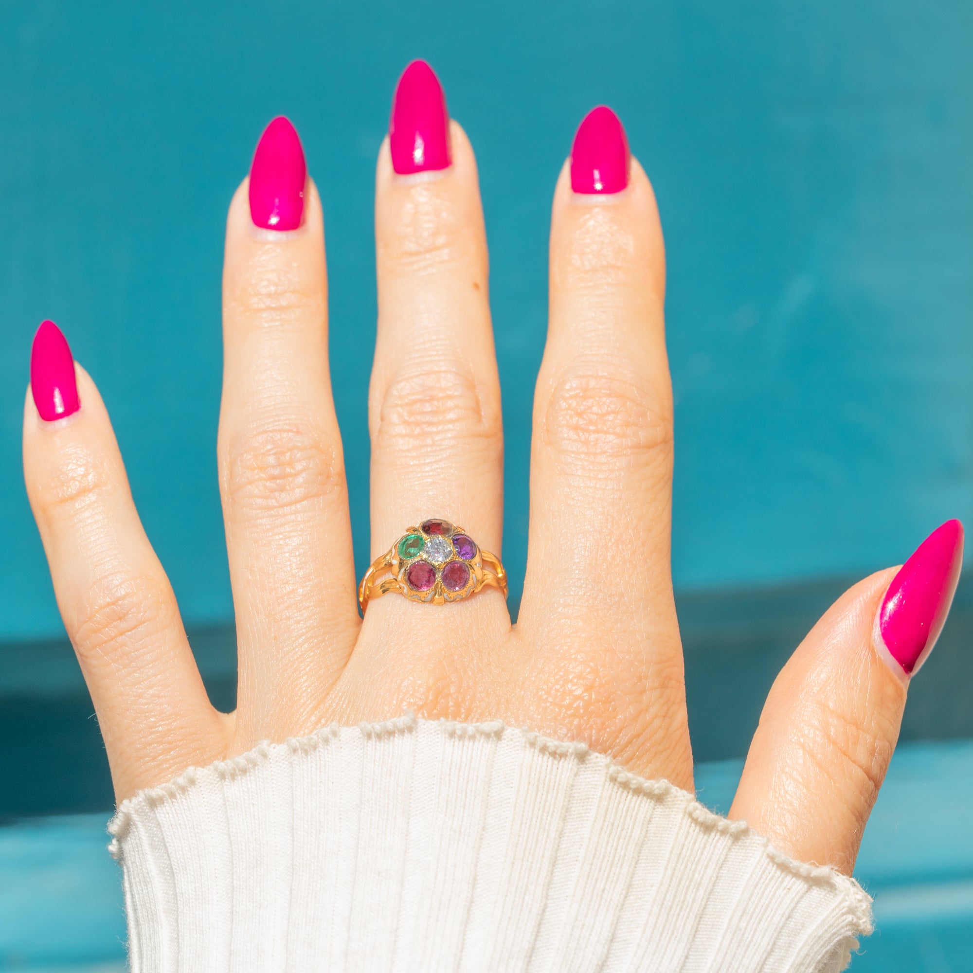 This rare Victorian multi-gemstone REGARD flower ring features a delicate White Enamel border, surrounding a splendid assortment of gemstones; she looks as though she's been plucked from an English flower garden!