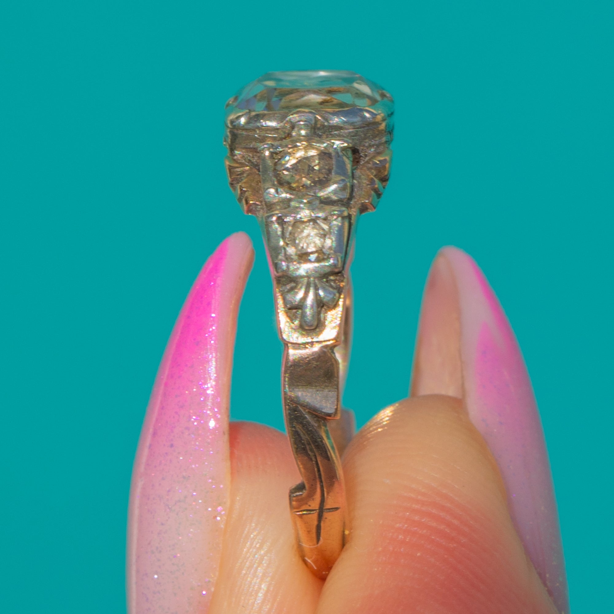 Ein faszinierender Georgian „Stuart-Kristall“-Ring, um 1780, gefertigt aus 15-karätigem Gold mit reizvollen Silberfassungen. Im Zentrum befindet sich eine klare Bergkristall-Tafel, unterlegt mit rosafarbener Folie für einen sanften, romantischen Schimmer, flankiert von kleinen Diamantakzenten im Altschliff, die einen zarten Glanz verleihen. Die zweifarbige Kombination aus Silber und Gold sorgt für einen schönen Kontrast und zeittypischen Reiz.
