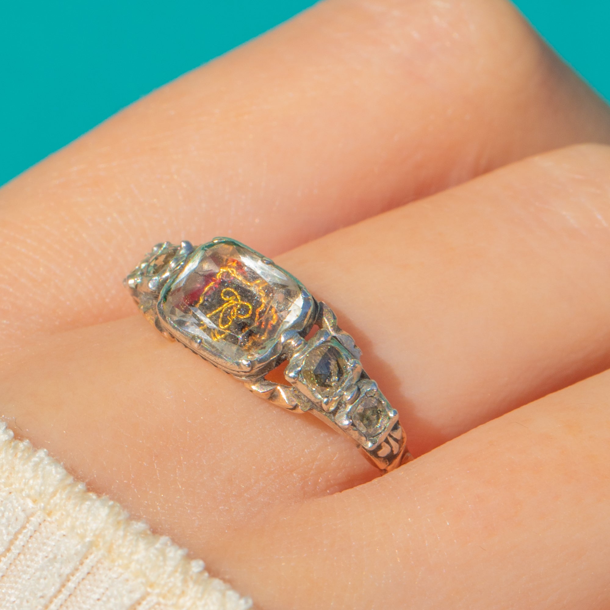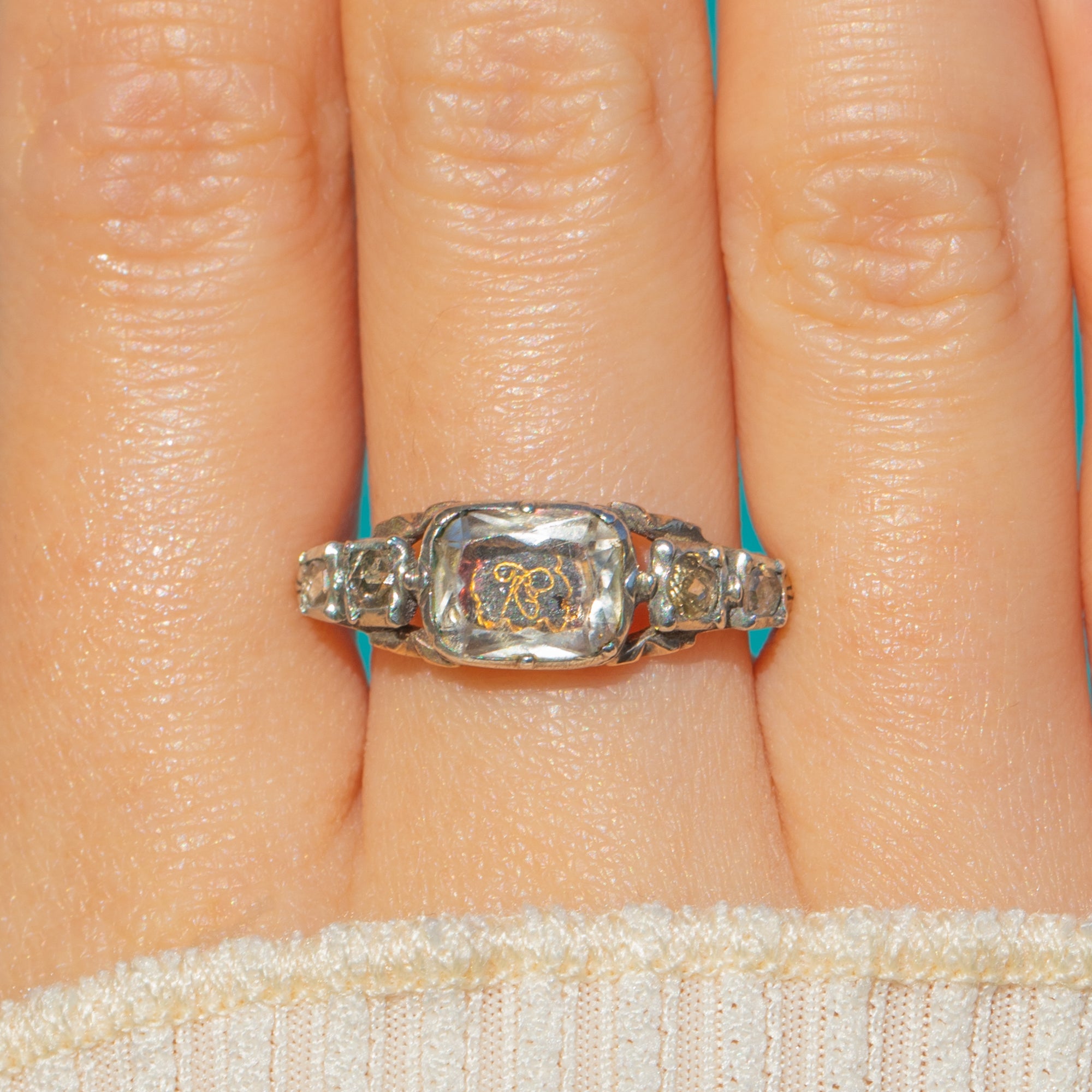 Der Ringkopf ist sorgfältig in Zargenfassung mit durchbrochener Galerie gearbeitet und besitzt anmutig gravierte, blattverzierte Schultern – alles meisterhaft von Hand vollendet, wie es Sammler an antikem, sentimentalen Schmuck schätzen. Zierlich in der Ausführung, doch voller Charakter, bietet dieser Ring einen seltenen Einblick in historische Liebesgaben und ist bereit, aufs Neue geschätzt zu werden.