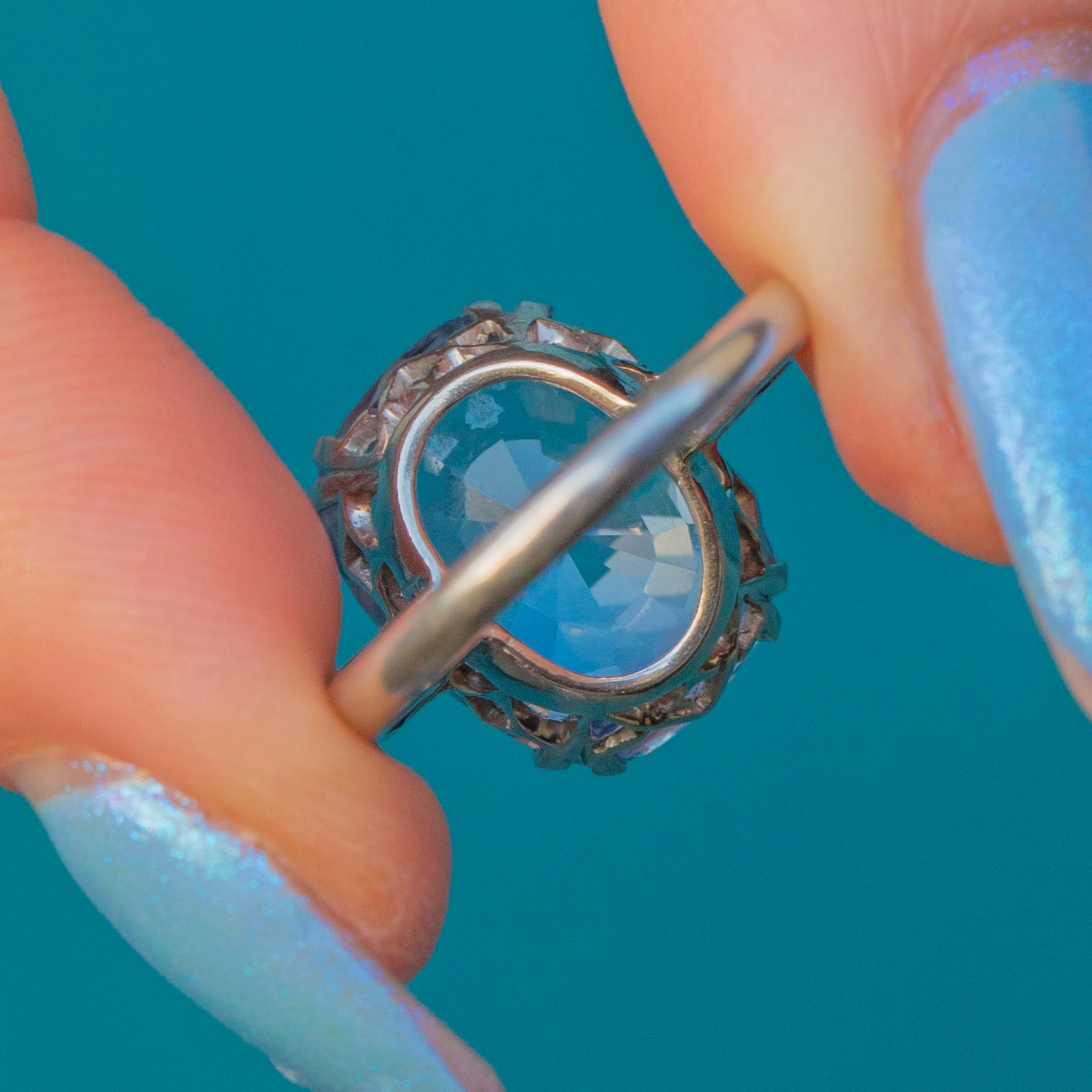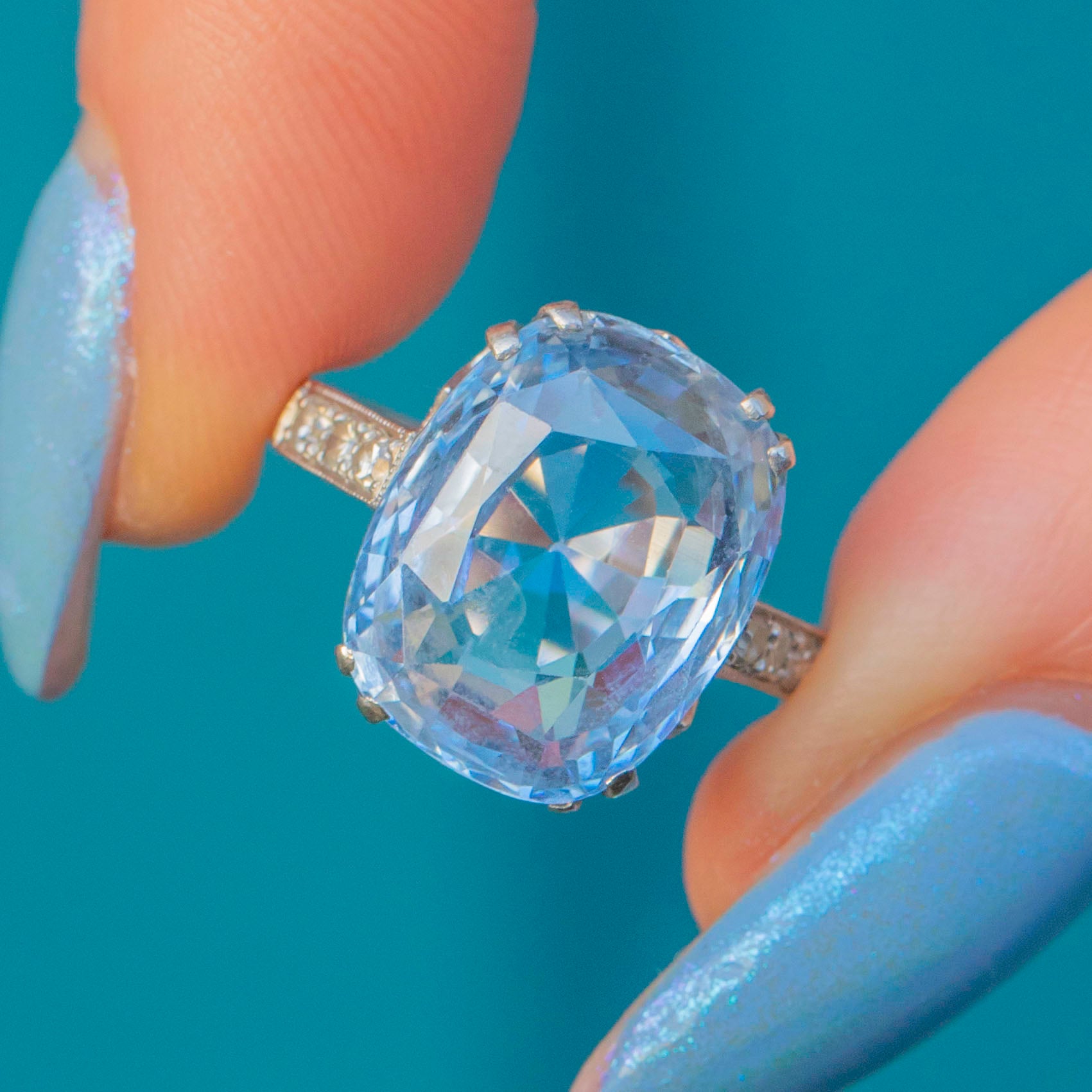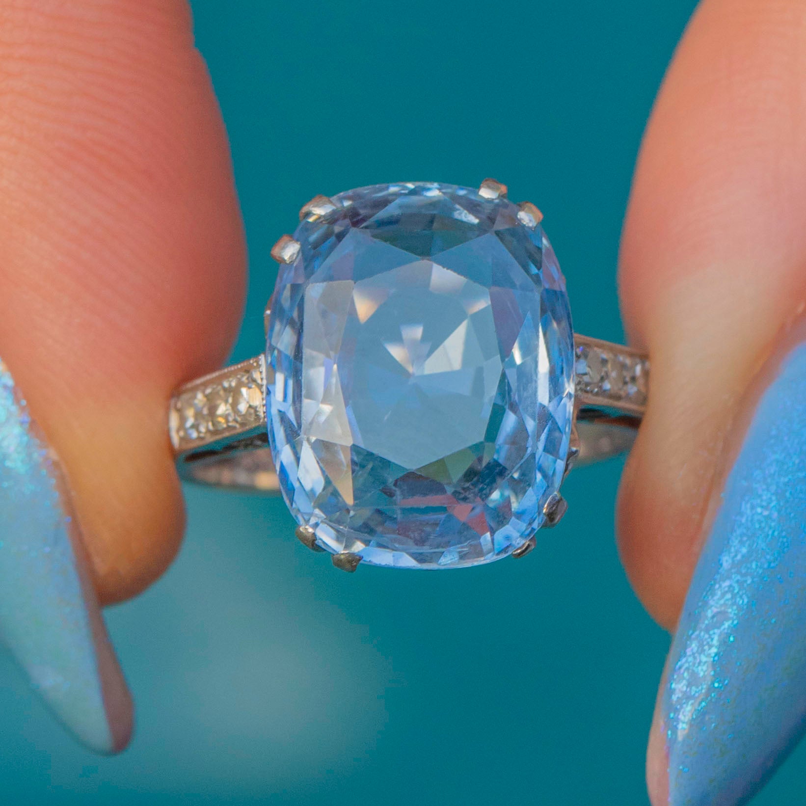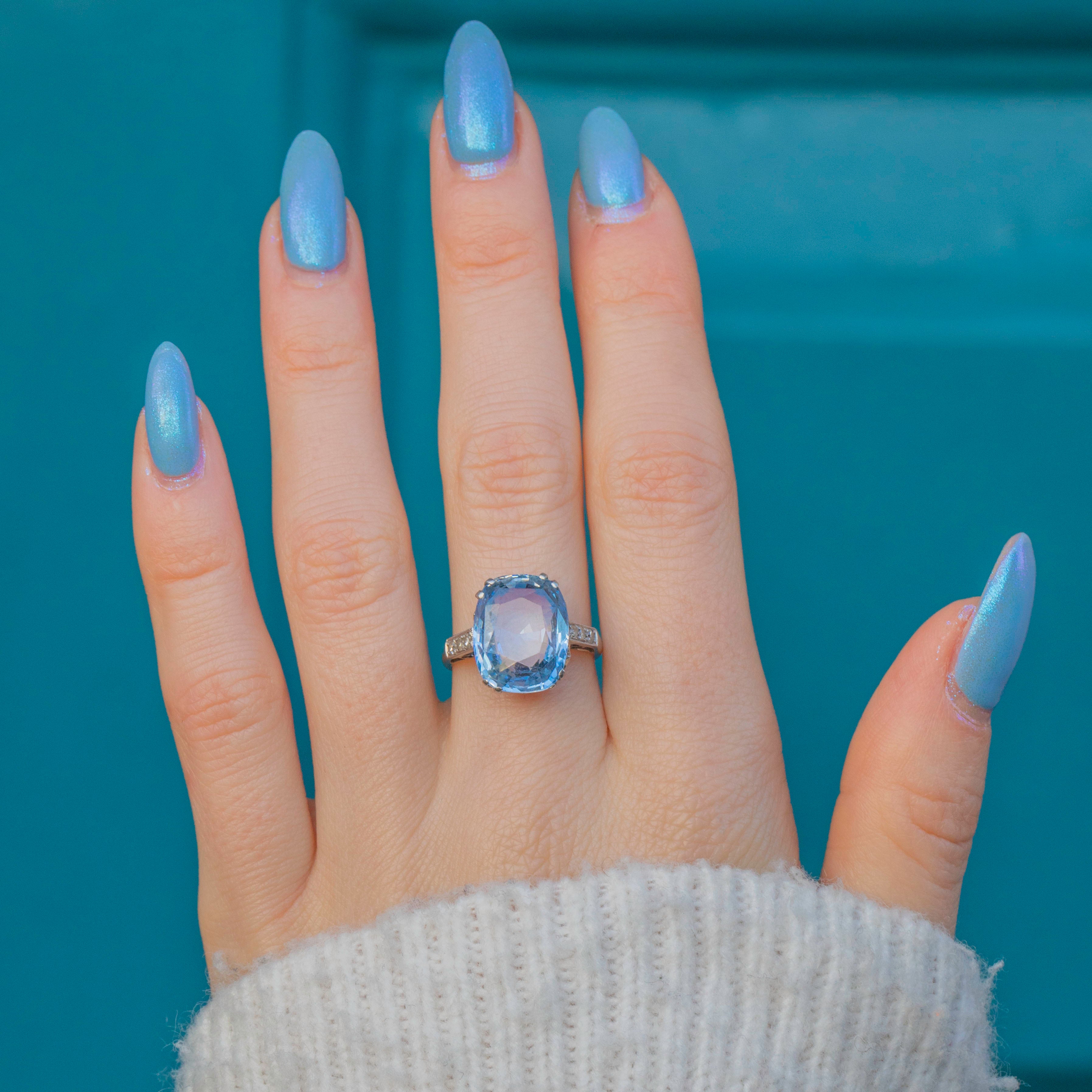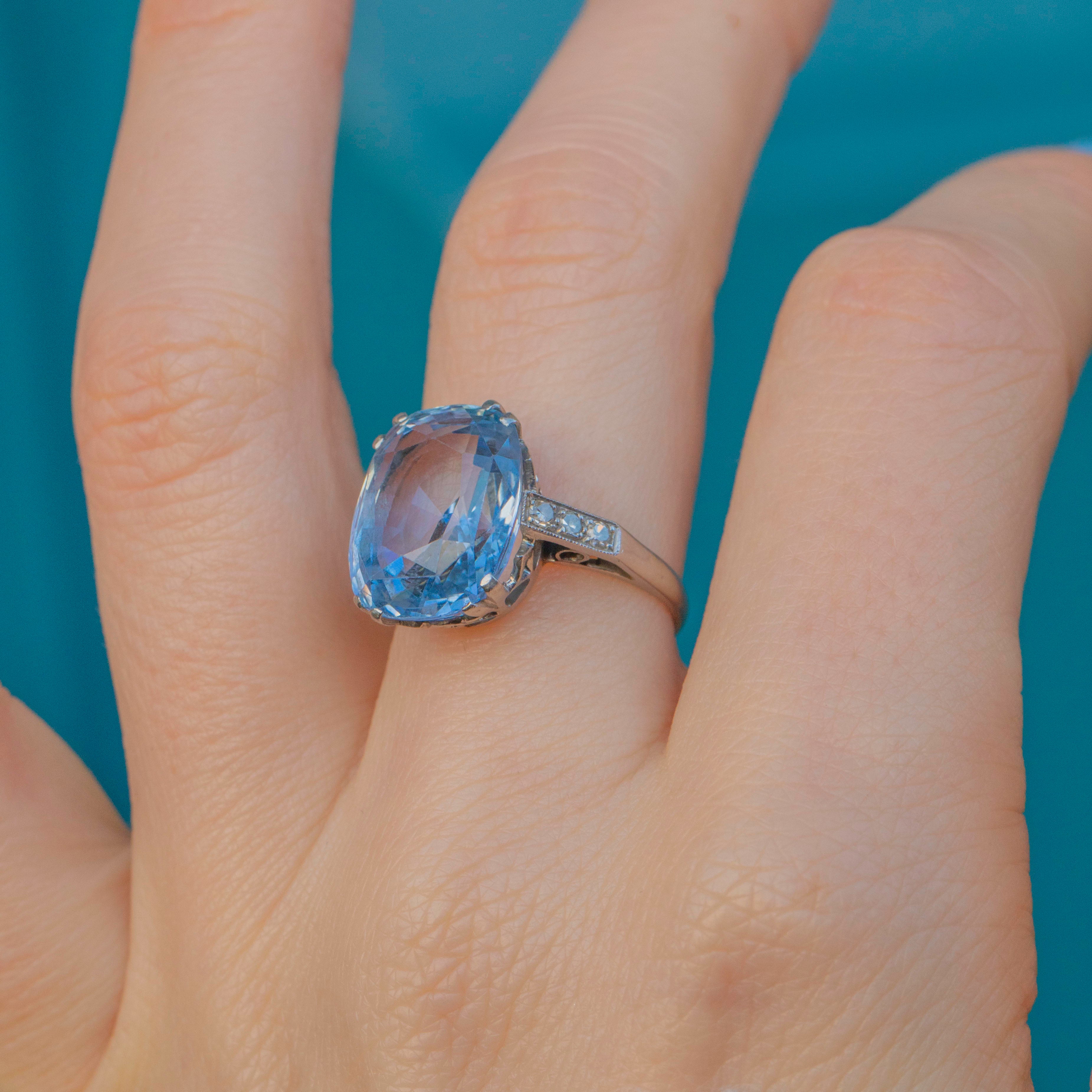 This exquisite rare Art Deco Platinum cornflower Blue Natural Sapphire Diamond ring features a whopping 8.00ct natural cornflower blue Sapphire, her delicate light sky-blue hue radiating an ethereal beauty. The Sapphire is set within stylistic double claws and held proudly from the finger in a decorative openwork basket that allows the light to beam through from every angle.