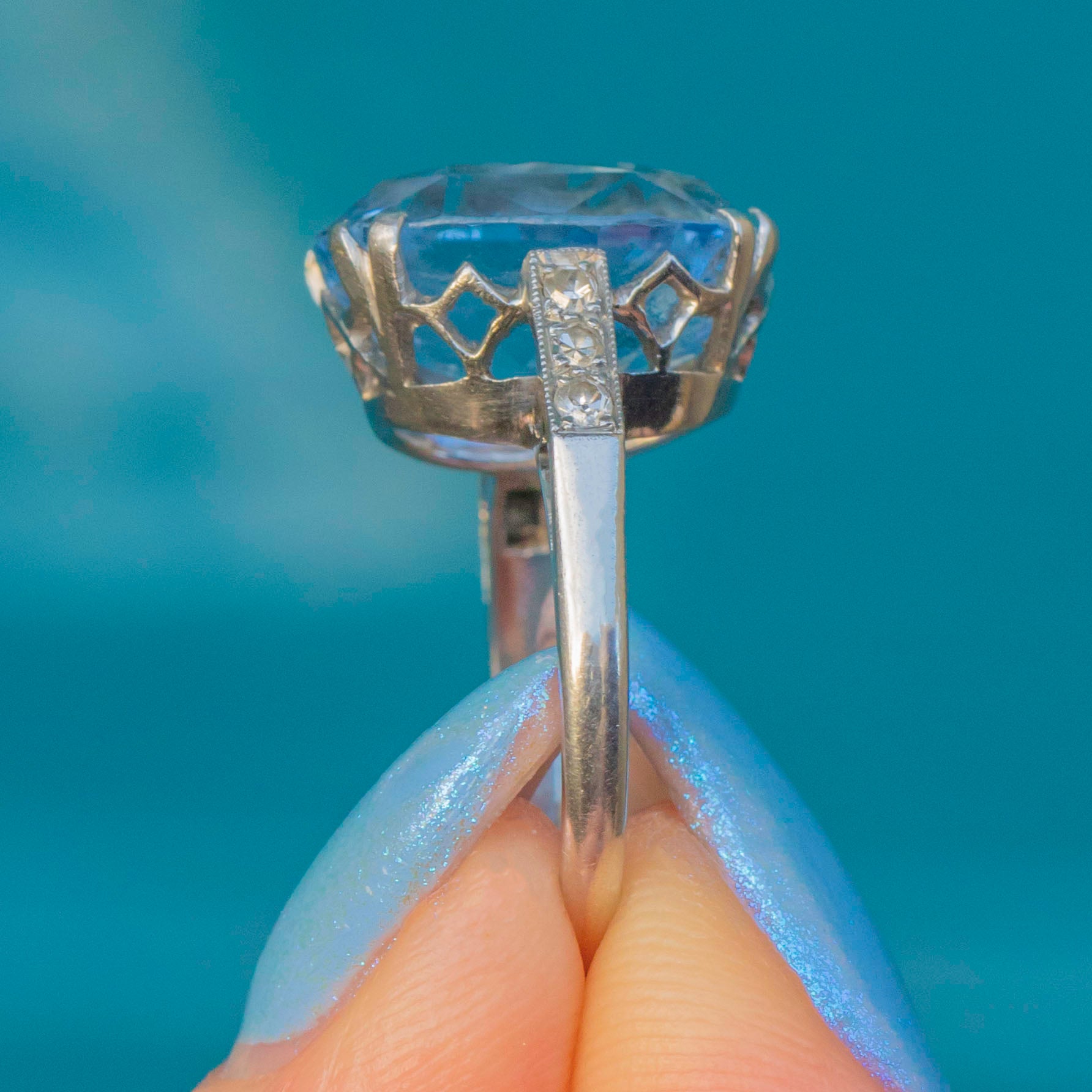 Crafted from solid Platinum and flush set with a row of dazzling Diamonds on both shoulders, this Art Deco ring is nothing short of decadent. Whether you are looking for a unique engagement ring or simply love standout pieces of antique jewellery, this piece is a must!