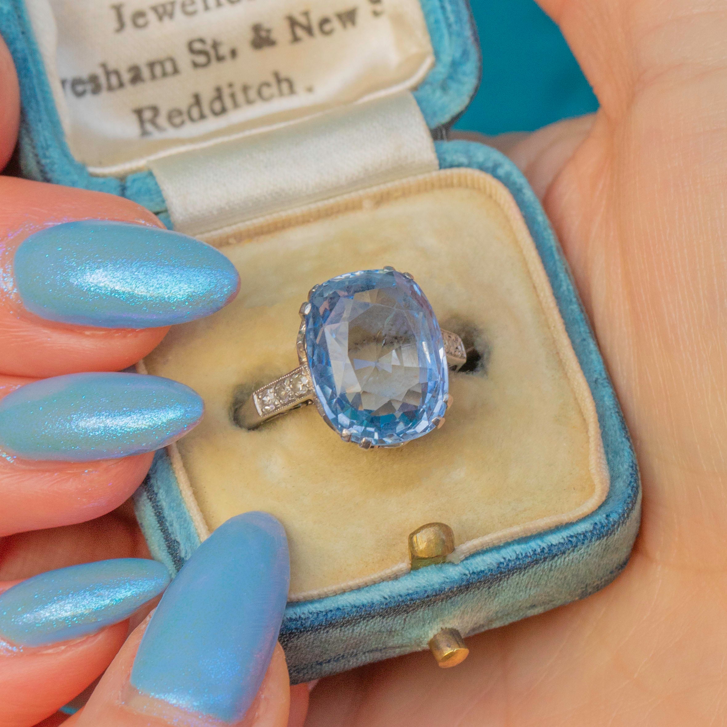 EXCELLENT. This Rare Art Deco Platinum cornflower Blue Natural Sapphire Diamond ring is in excellent condition, with the Platinum showing minimal wear and retaining her intricate detailing. The 8.00ct Sapphire is vibrant and free from noticeable scratches or chips. Likewise, all Diamonds are securely set, sparkling brilliantly without any damage. There is some evidence of resizing in the past but this is hardly noticable unless under close inspection. She's a delightful one!