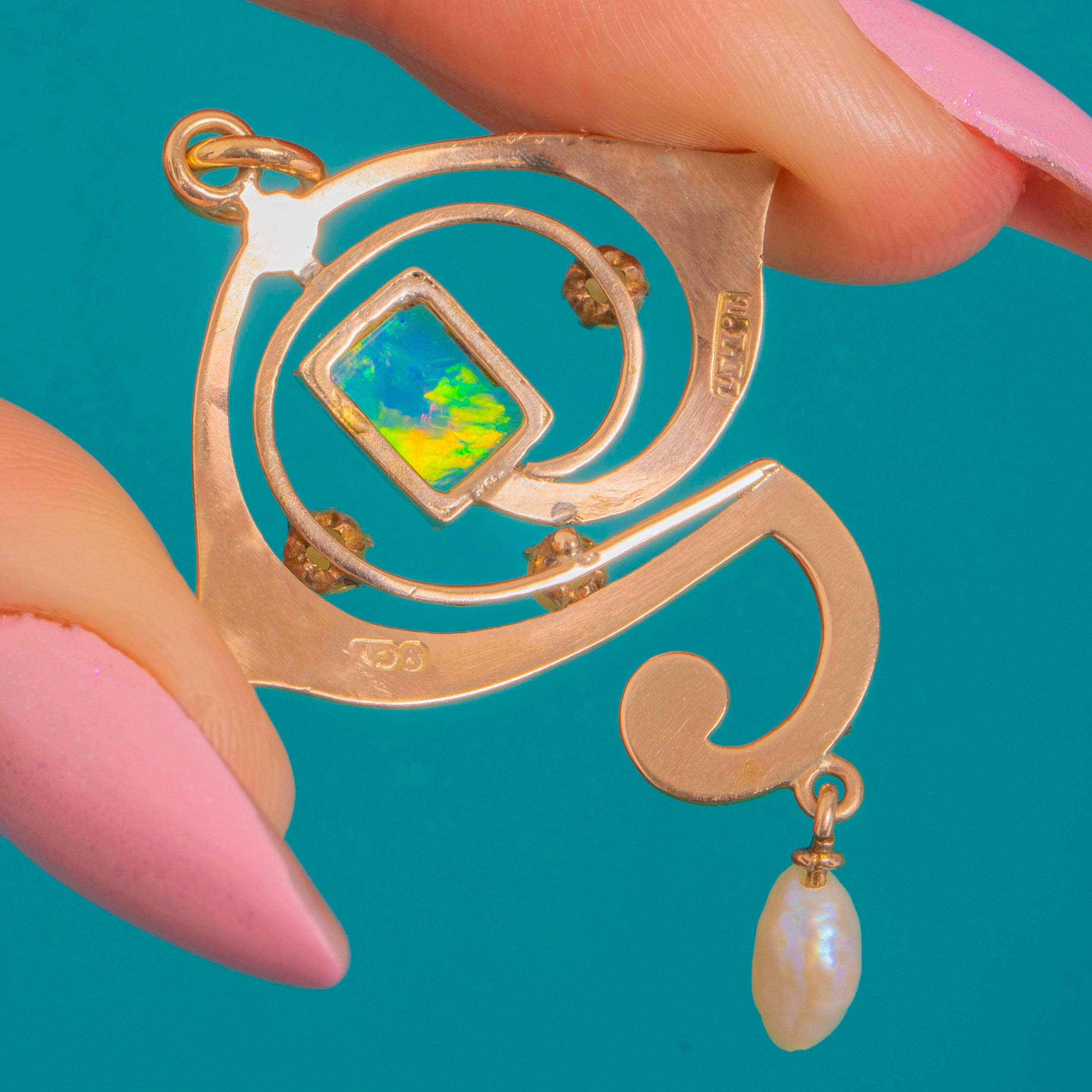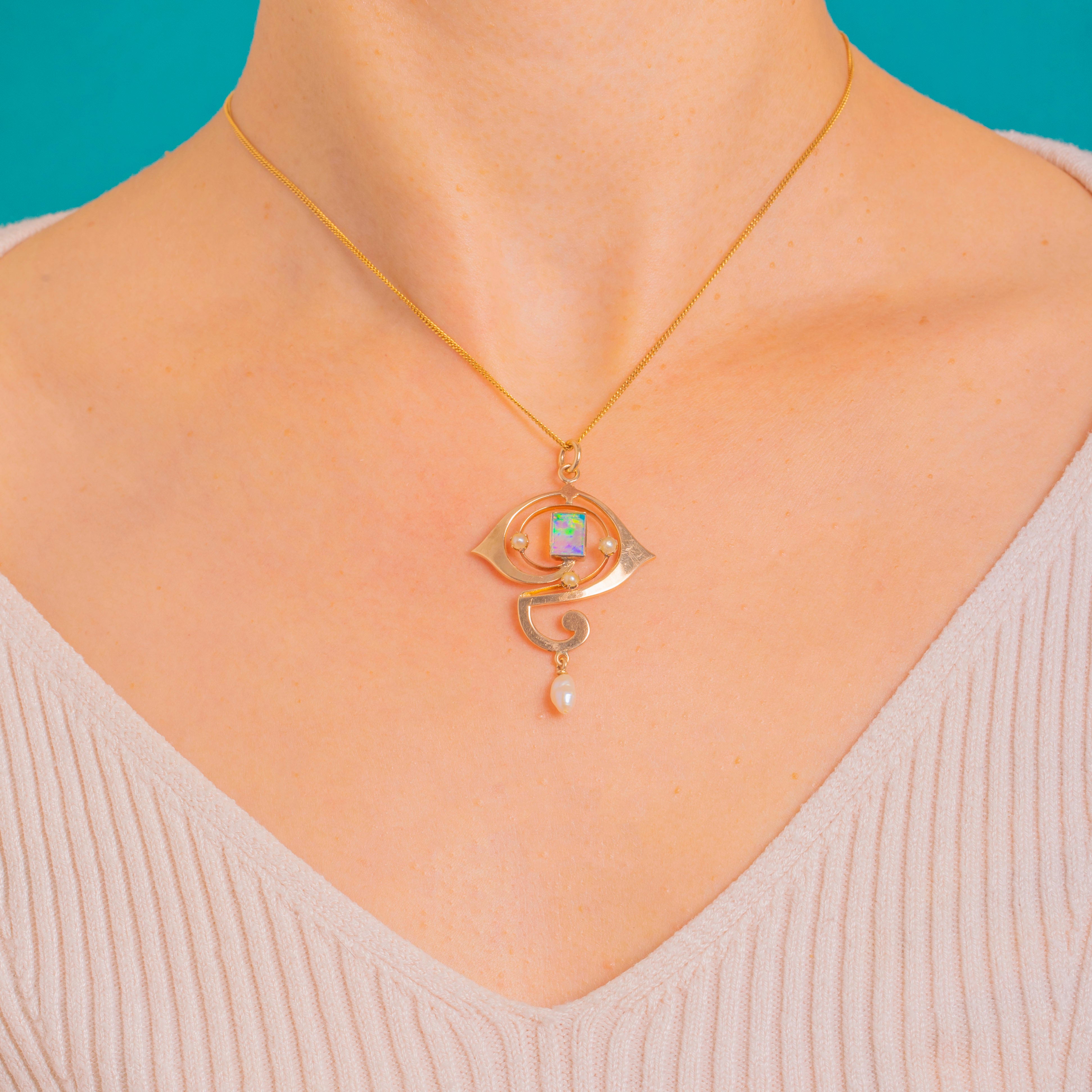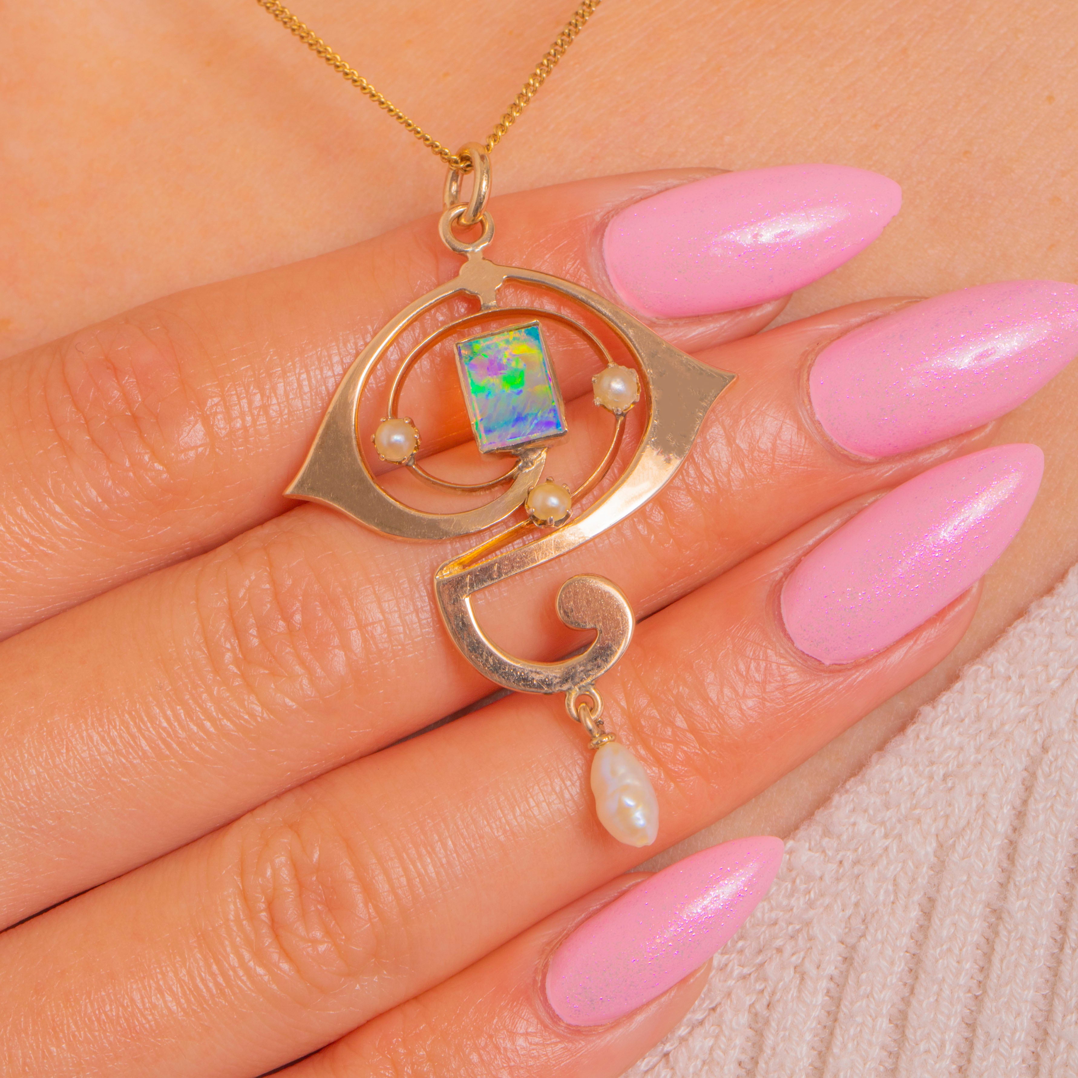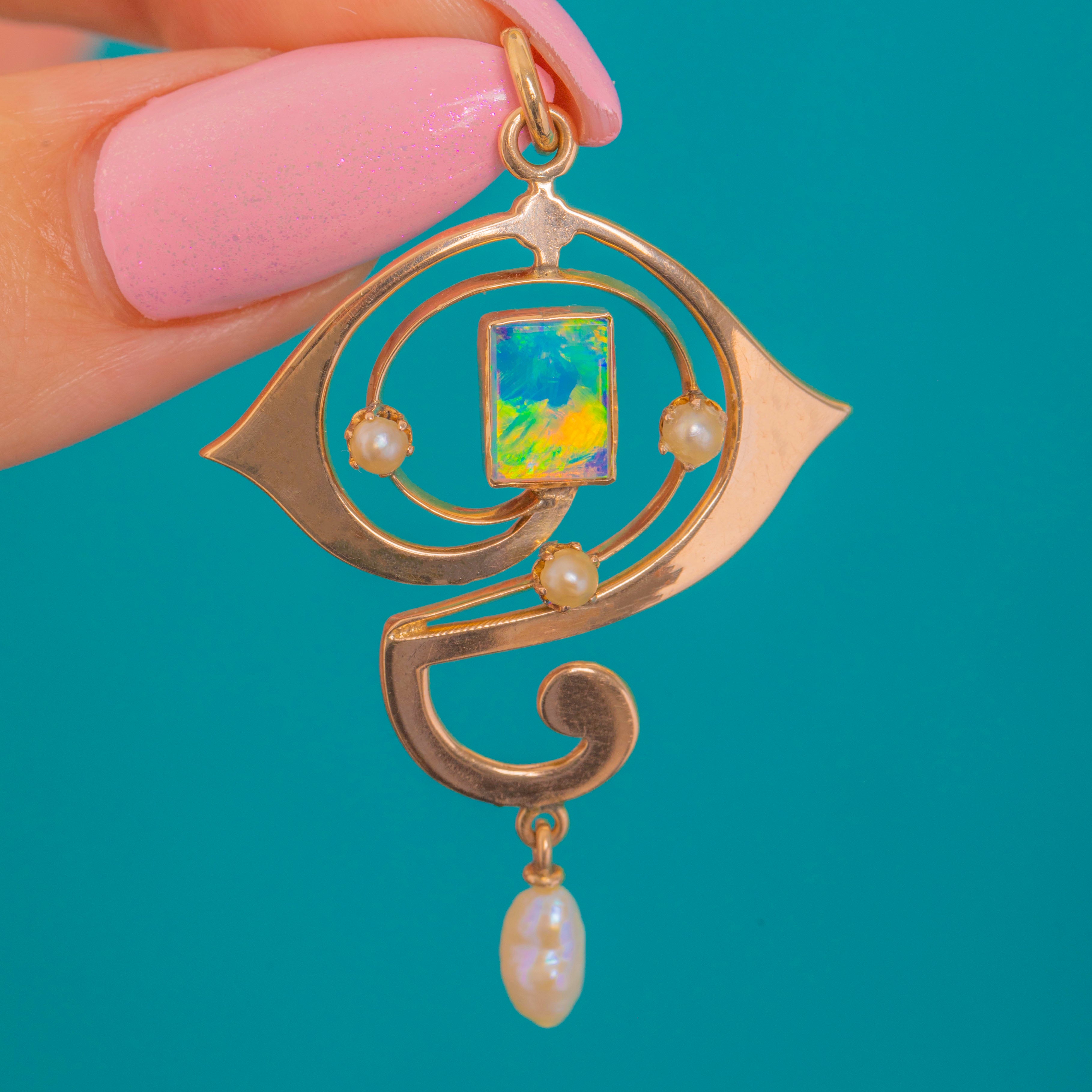 Sinnliche Voluten und eine poetische „Fragezeichen“-Silhouette machen diesen Art Nouveau Anhänger zu einem kleinen tragbaren Kunstwerk. Gefertigt aus 9ct Gold, rahmen seine durchbrochenen Schwünge ein rechteckiges Opal-Cabochon ein, das mit blau-grünem Feuer und goldenen Blitzen schimmert. Drei zierliche Perlen akzentuieren die Linie, während eine barocke Perle als Pendel bei jedem Schritt anmutige Bewegung verleiht.
