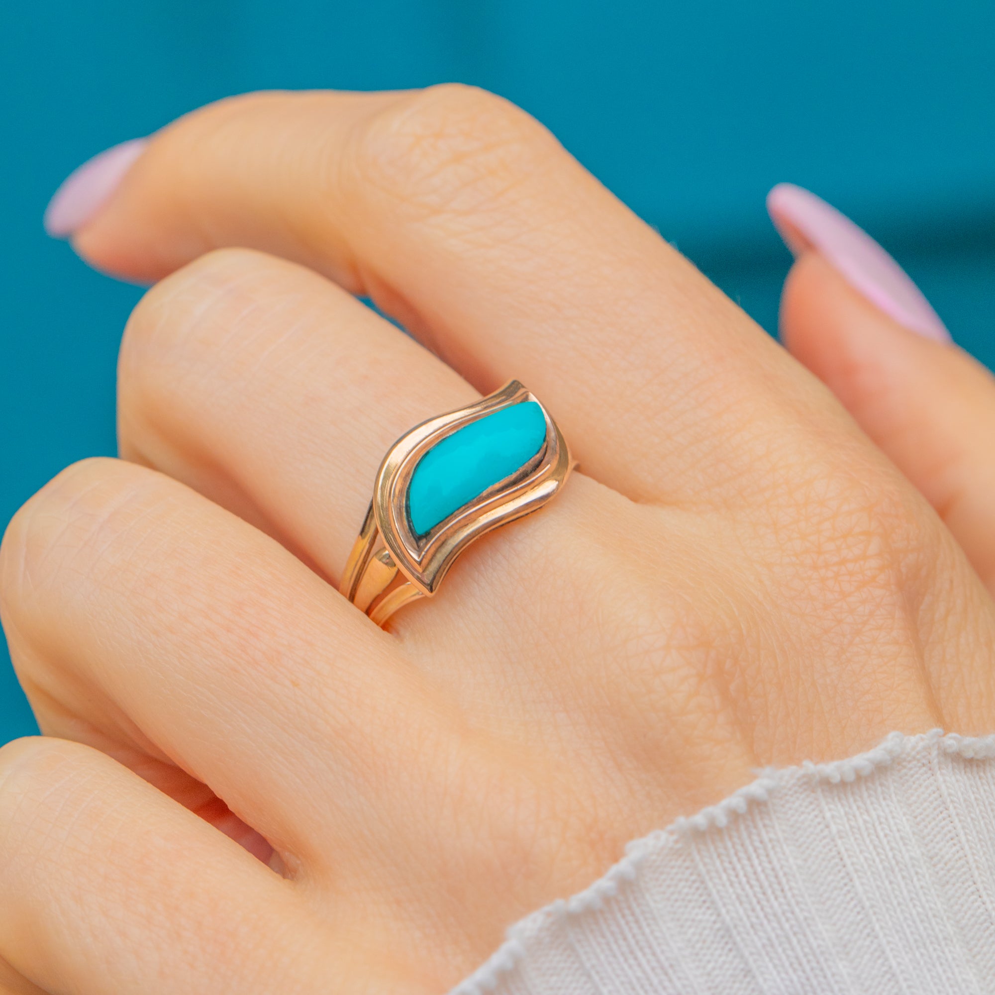 A touching are rare piece of Georgian history, this memorial ring is crafted in warm 12ct Gold and set with a beautiful curved eye-shaped Turquoise tablet. The vibrant sky-blue stone is bezel-set within an elegant, sculpted mount that curves smoothly around the finger.