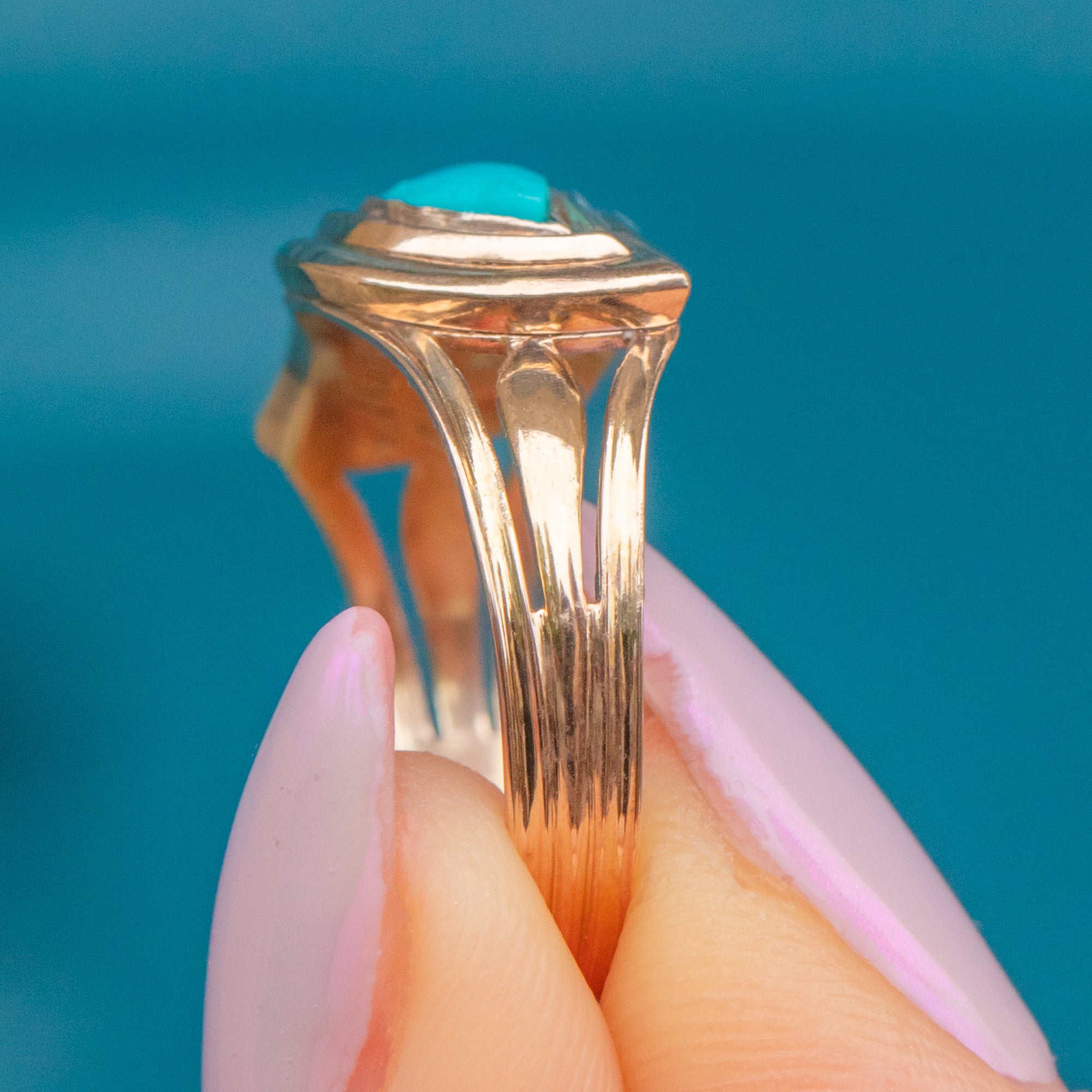 MATERIALS: Tests as 12ct Gold, rare eye-shaped Natural Turquoise.