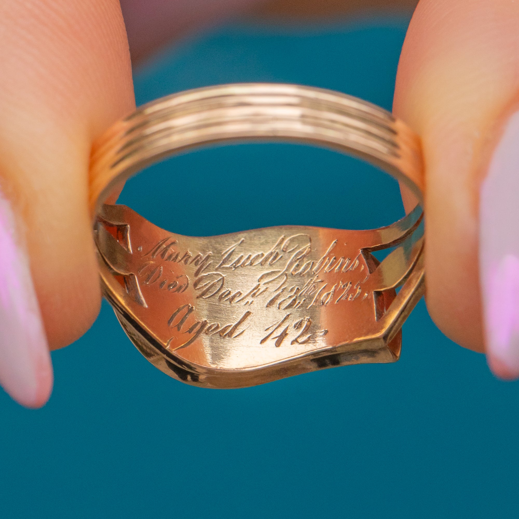 Inside the band is a hand-engraved inscription reading, “Mary Luch Robins died December 13th 1825 aged 42”, preserving the memory of a loved one for nearly two centuries. Poignant and exquisitely made, this rare piece is both a work of art and a tangible link to the Georgian past.