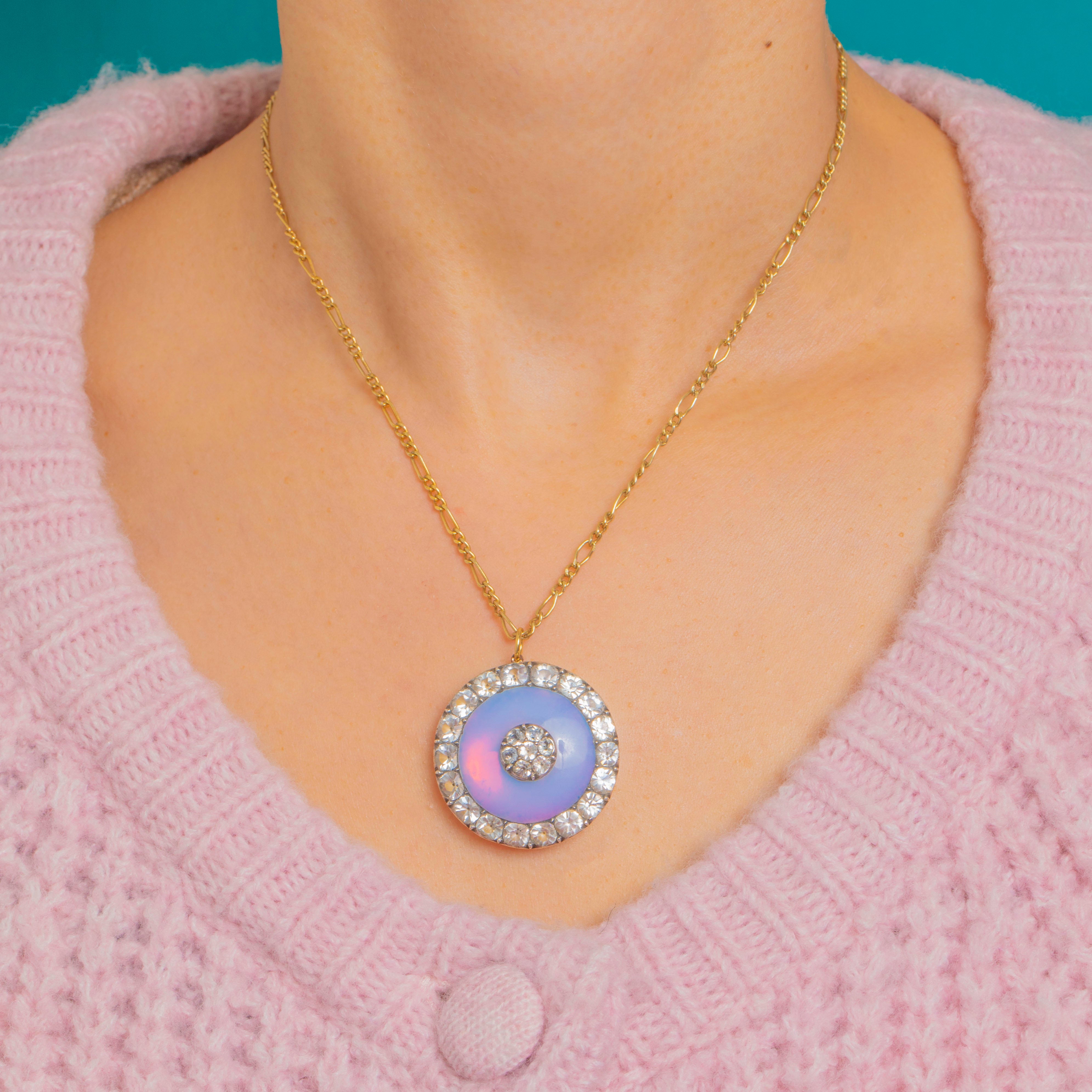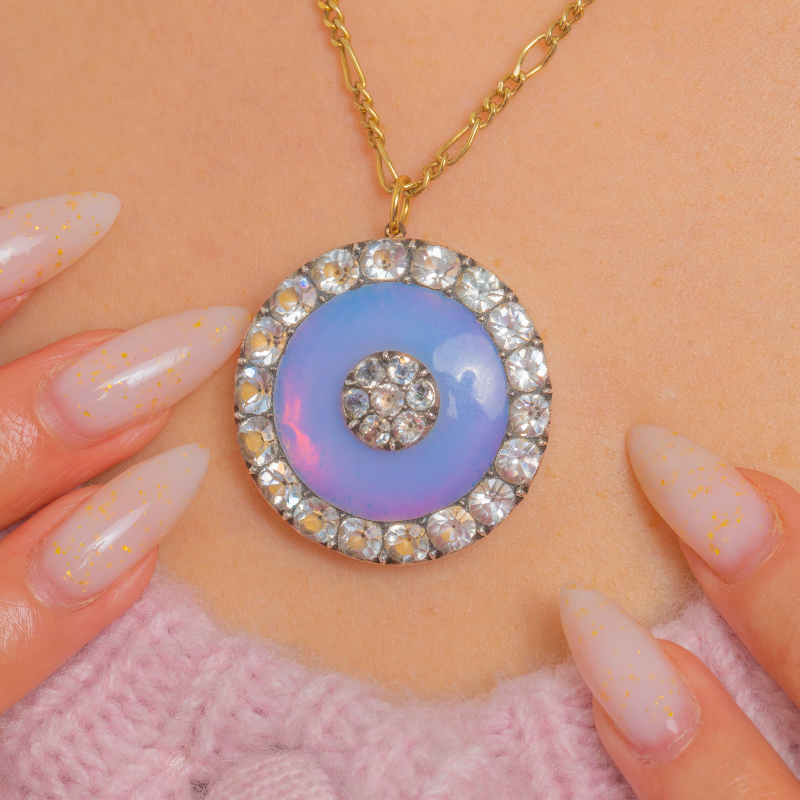 A luminous Georgian Silver roundel pendant with a dreamy Opaline centre that shimmers lavender-blue with soft pink flashes. At its heart sits a petite cluster of clear Paste, framed by a radiant halo of larger, graduated Paste stones. The crisp concentric “target” motif, closed-back collets and elegant symmetry deliver that sought-after period glamour in a wonderfully wearable design.