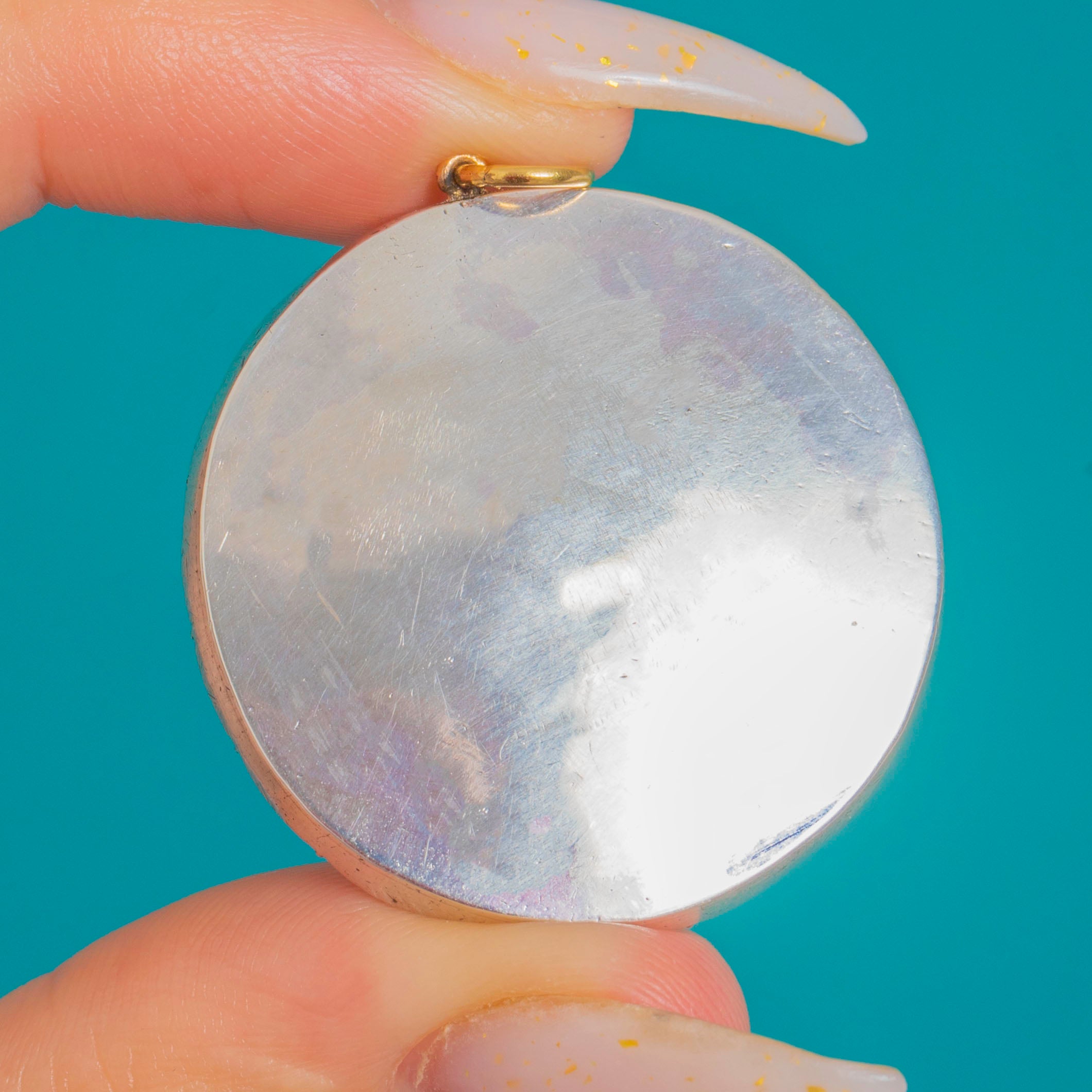 The Opaline disc provides a silky glow while the foiled Paste catches the light with charming sparkle. Finished with a 9ct Gold jump ring for a subtle two-tone accent, this pendant is an evocative slice of Georgian style that transitions effortlessly from day to evening.