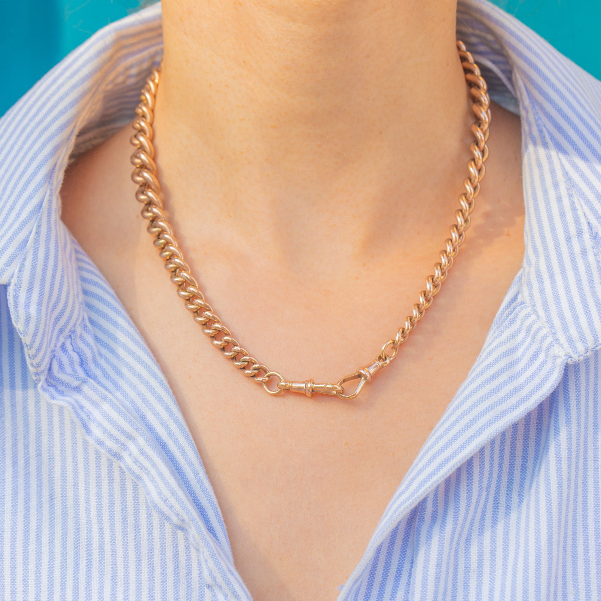 Quintessentially Albert in spirit and superbly wearable, this 9ct Gold collar-length chain is a bold staple with beautiful utilitarian detailing. The substantial curbed links flow to a static dog clip charm holder, inviting you to curate pendants, fobs or charms with ease.