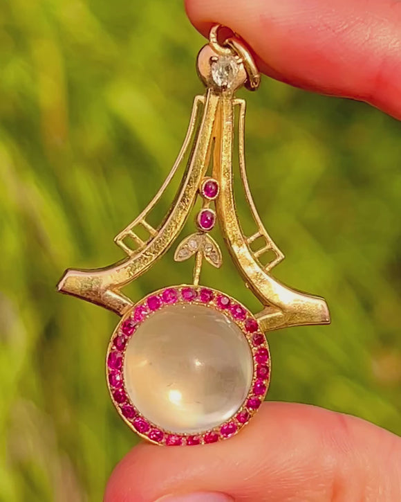 Seltener Jugendstil 14ct Gold Mondstein-Rubin-Diamant-Zielscheiben-Anhänger