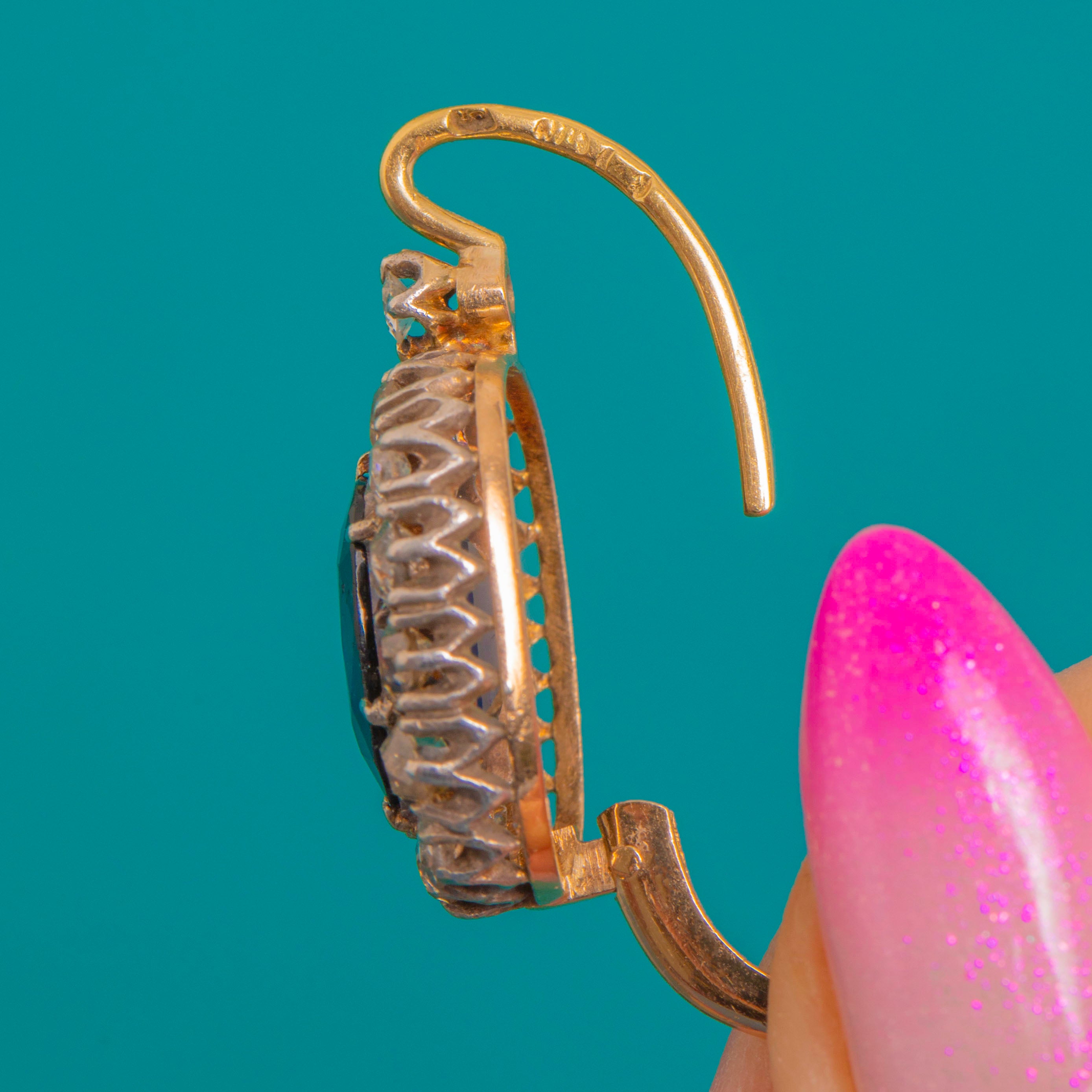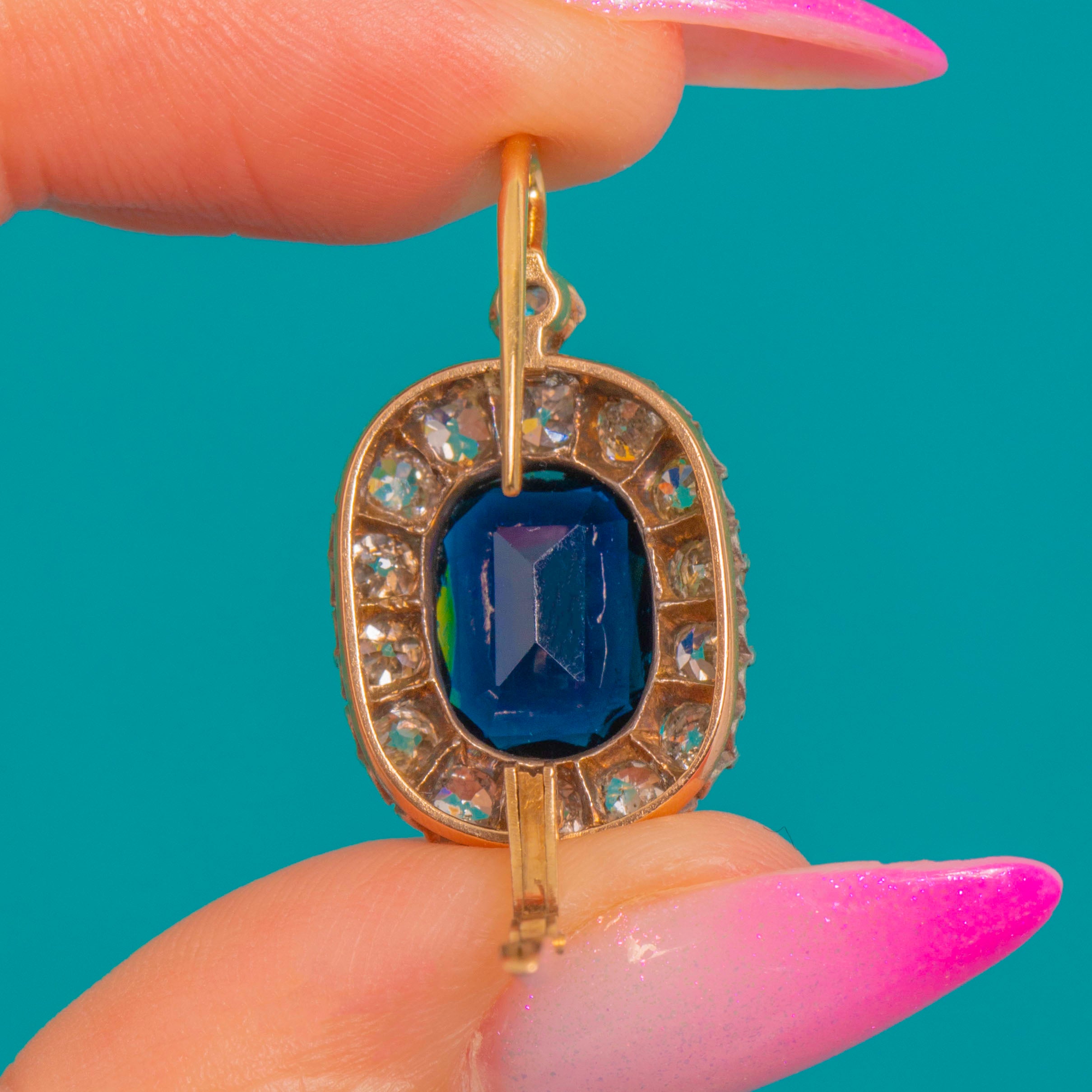 RARE Large 15ct Gold Blue Paste & Diamond Lever-Back Earrings