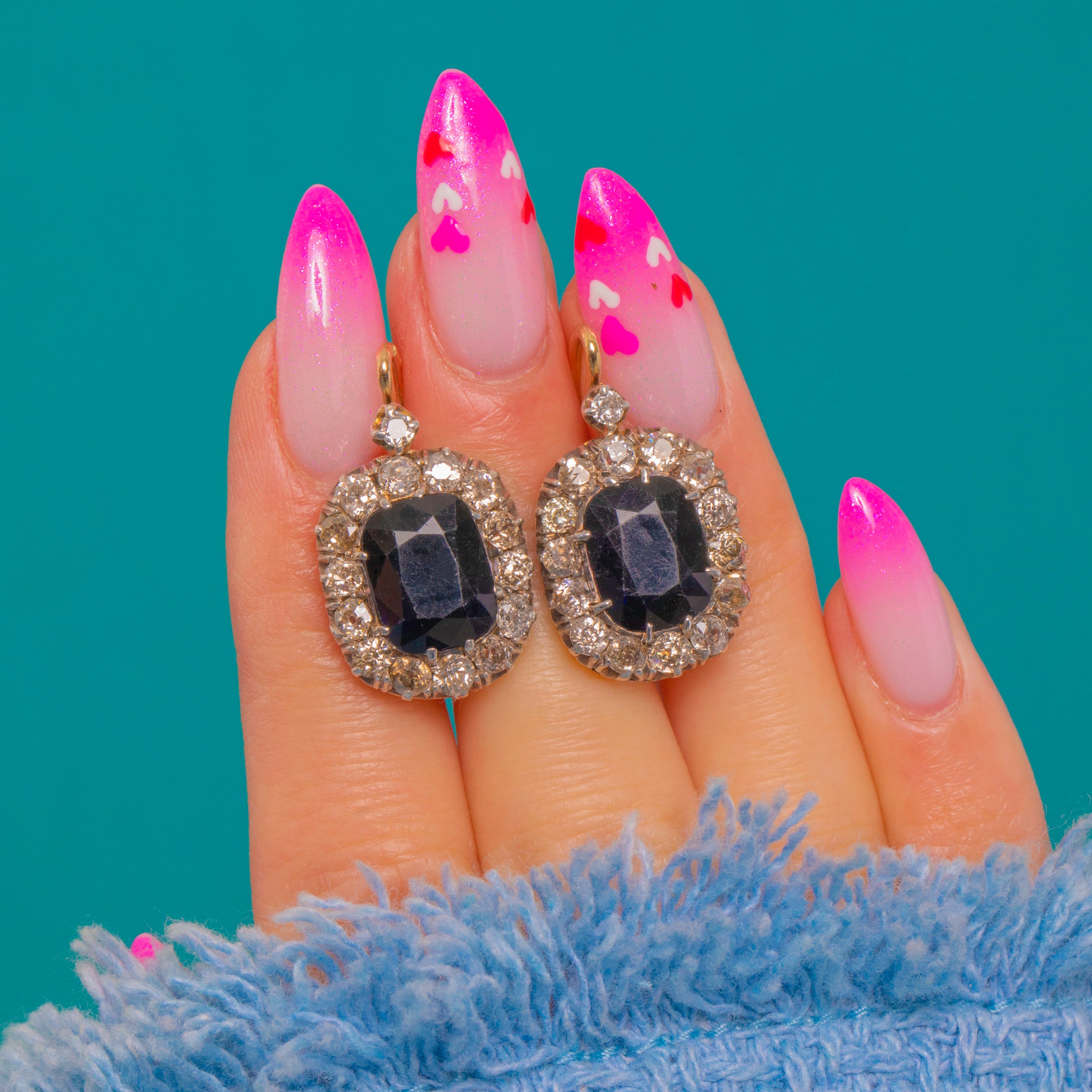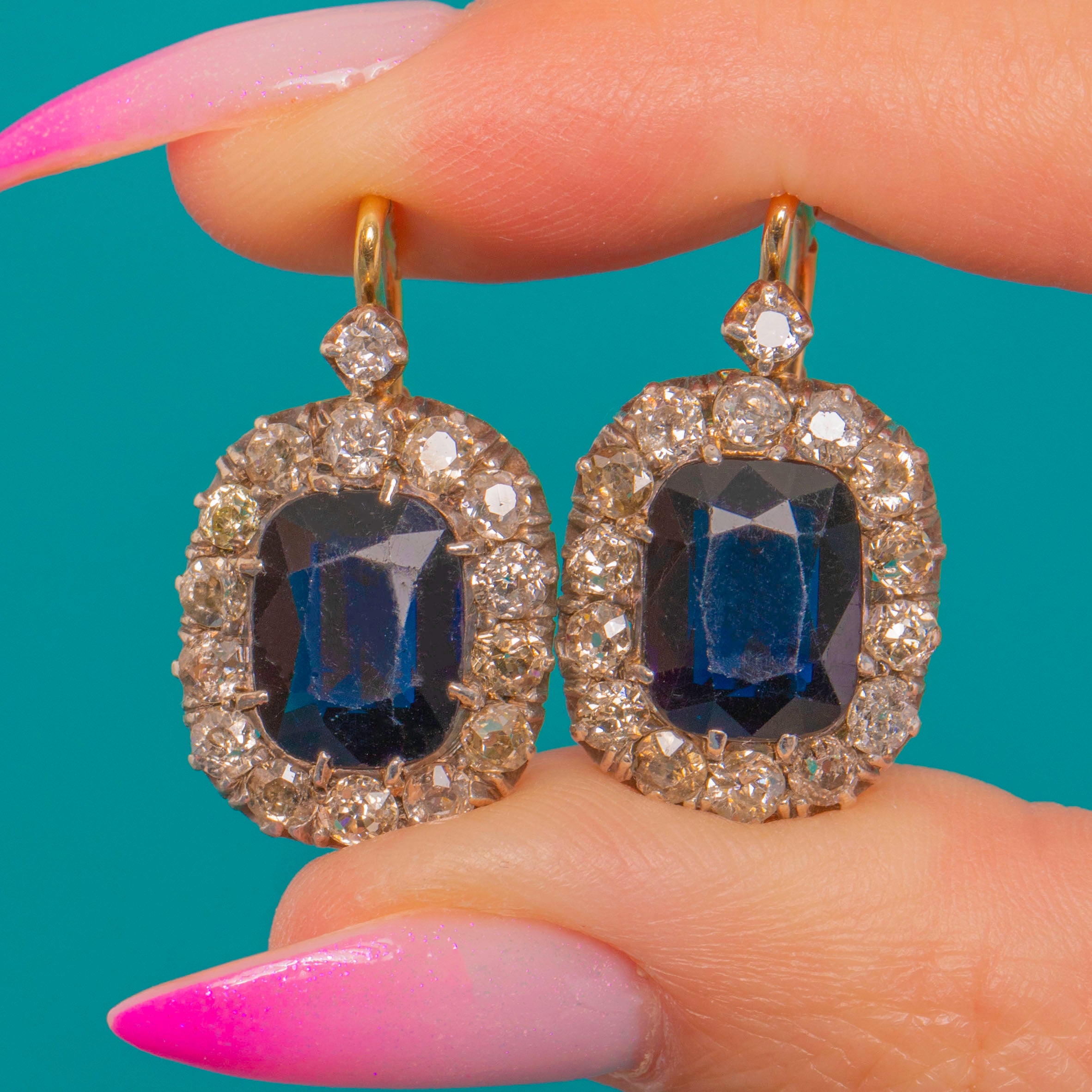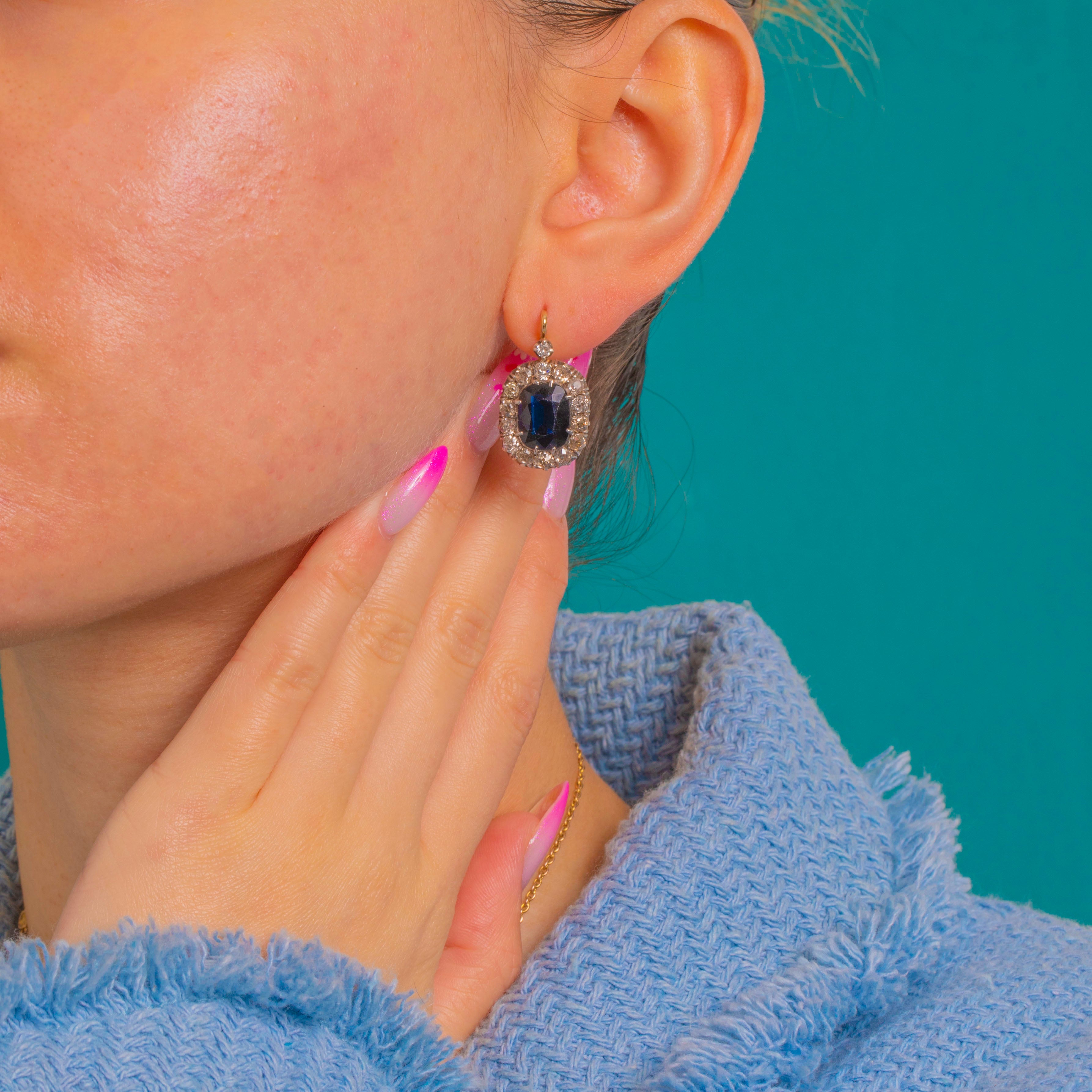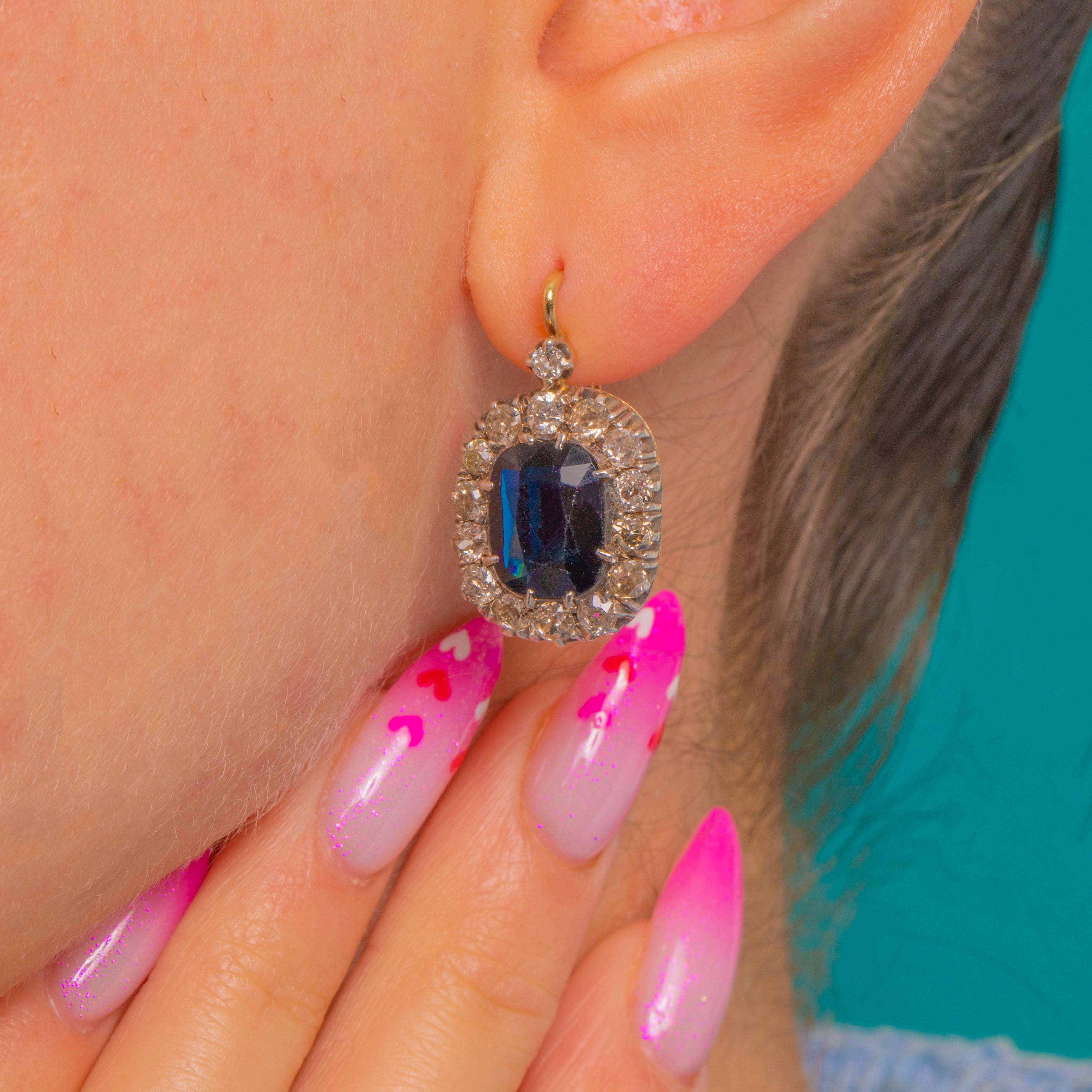 These elegant Victorian drop earrings centre on richly sapphire-hued Blue Paste framed by a scintillating halo of Diamonds.