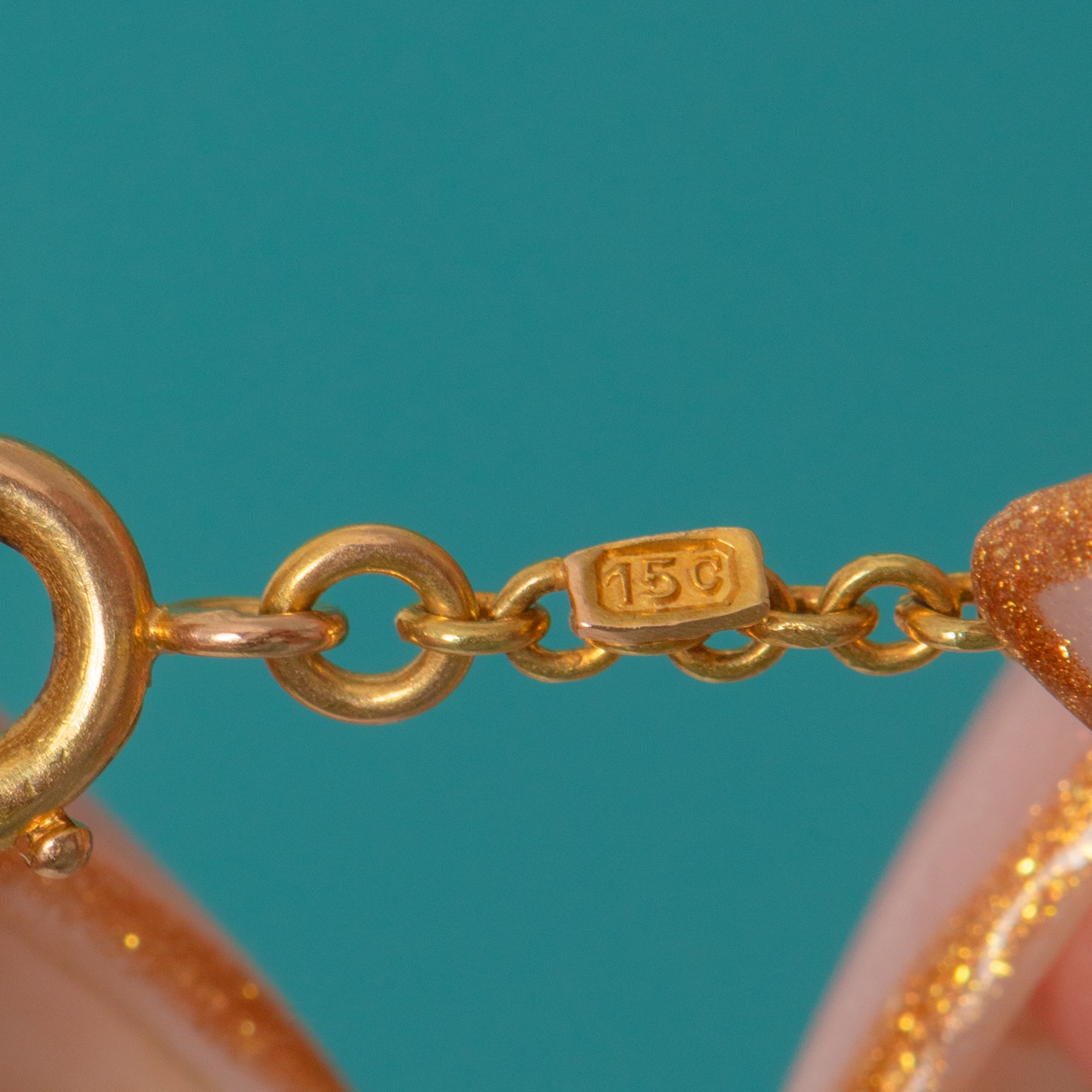 STAMPS: “15CT” tag near the clasp.