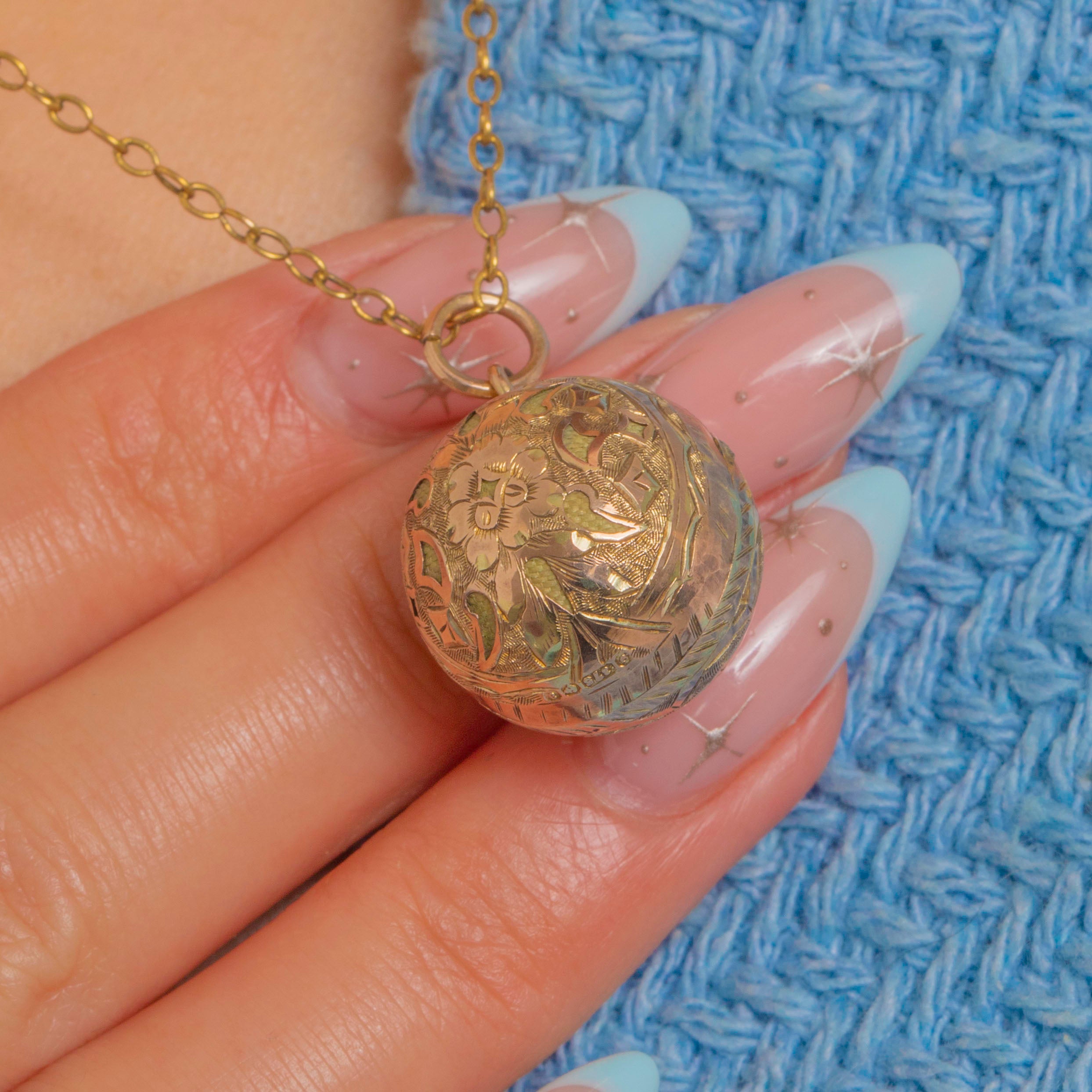 EXCELLENT: The hollow sphere remains in lovely order with crisp hand‑engravings and gentle high‑point softening; light surface wear and minor shallow dings are commensurate with age. The seam is visible by design, the jump ring is secure, and there are no obvious splits or repairs; attractive antique patina within the recesses.