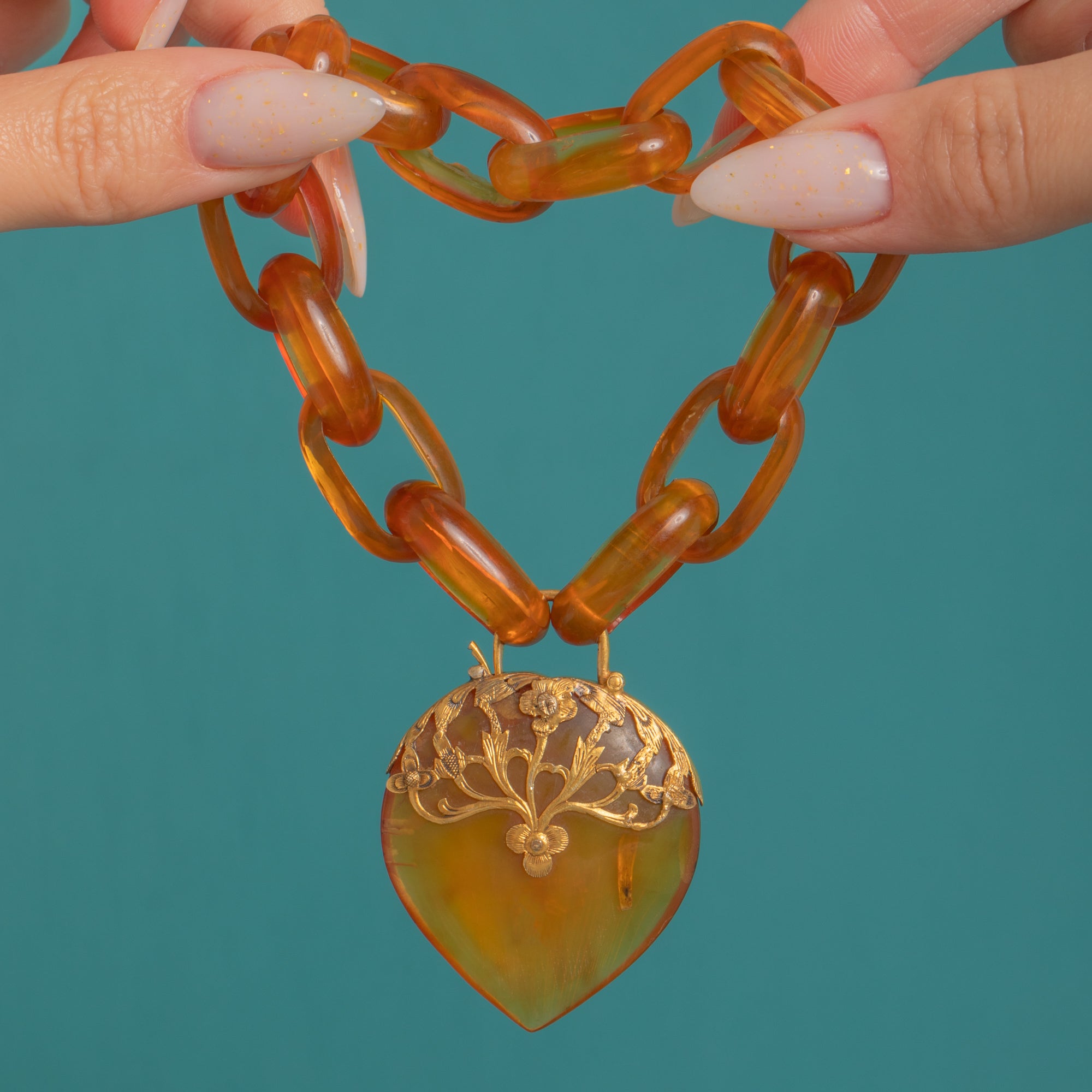 Glowing with the warm translucency of Blonde Tortoiseshell, this Victorian bracelet marries sculptural links with a romantic heart-shaped padlock clasp. The honeyed oval links are smooth and glossy, their natural swirls and veils catching the light beautifully, while the heart padlock is adorned with elegant foliate detailing in Sterling Silver Gilt for a richly decorative finish.