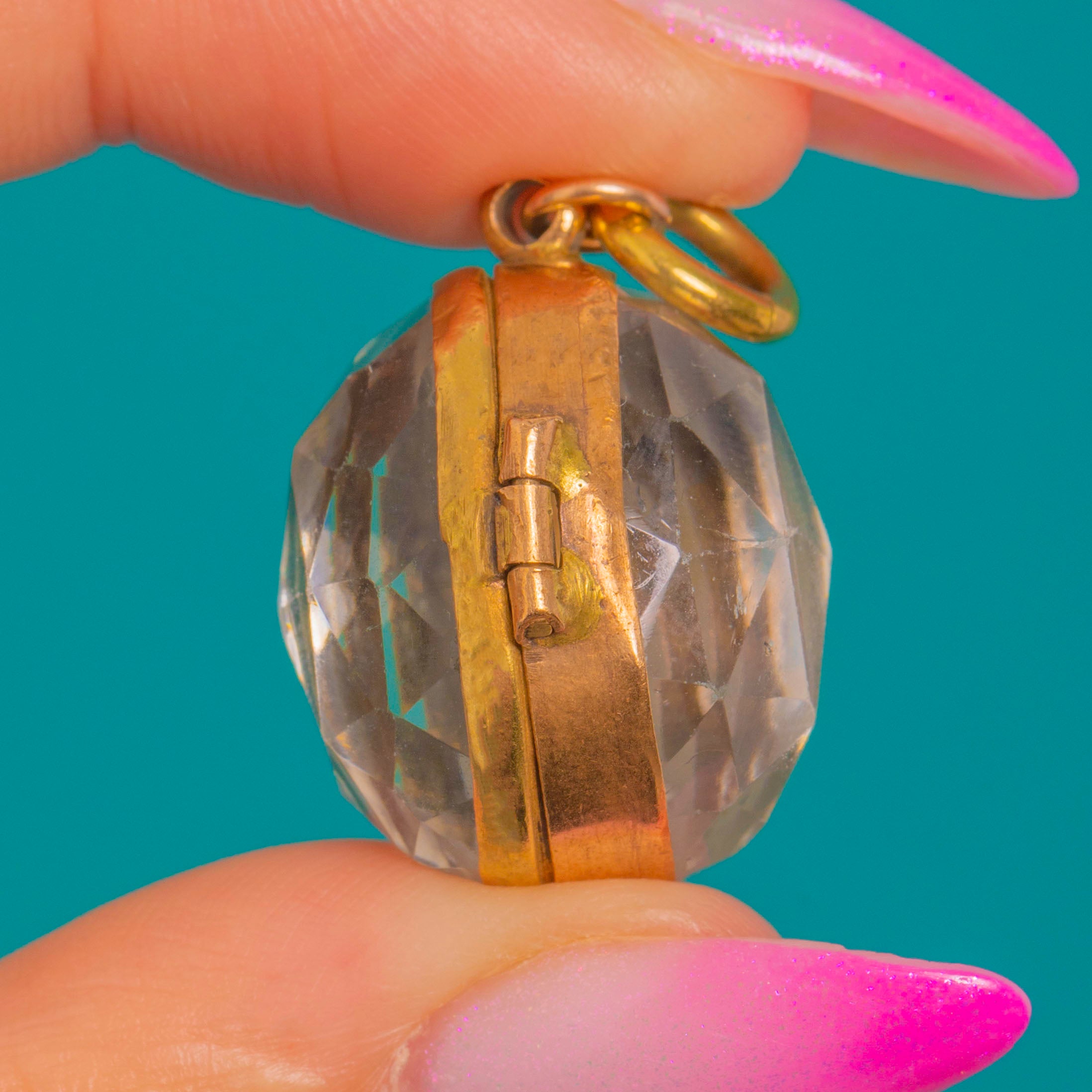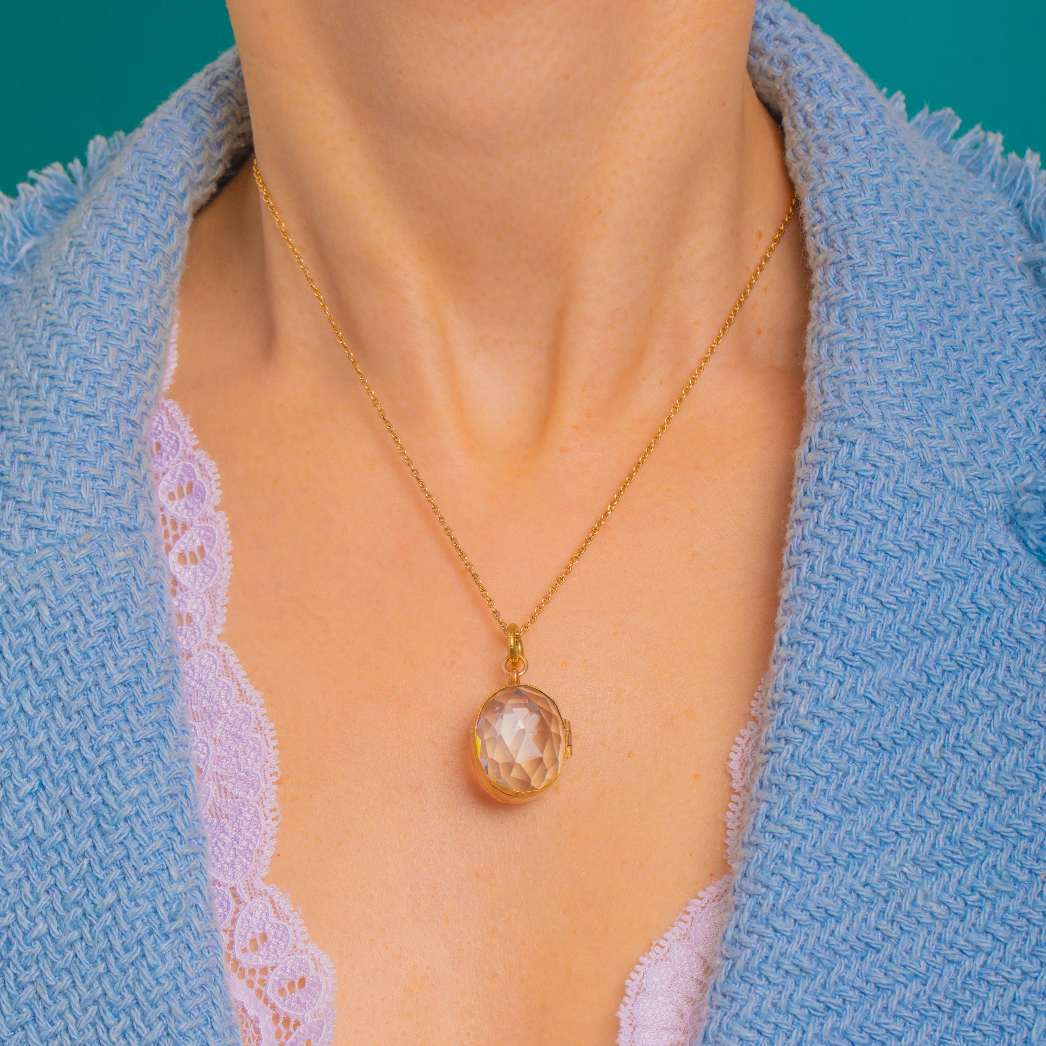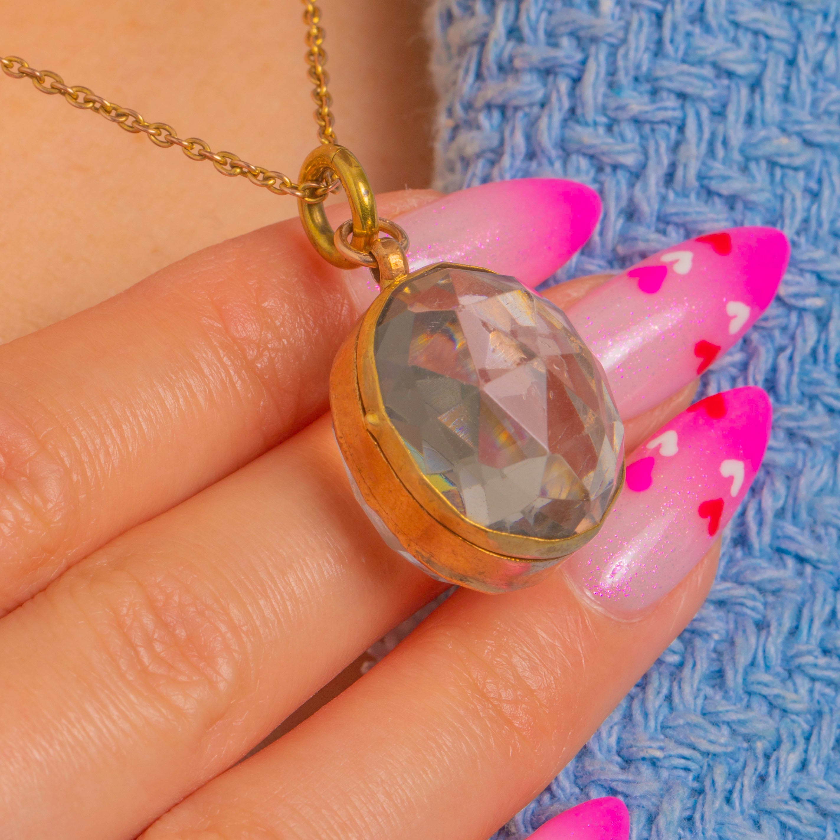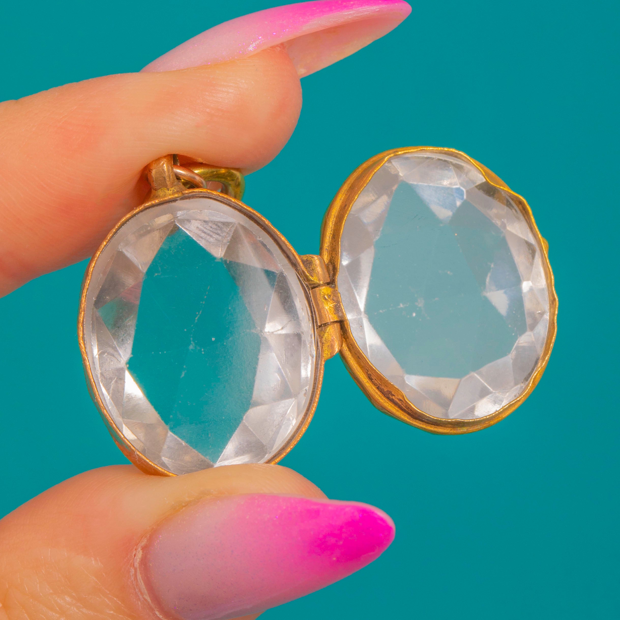 A rare Victorian faceted Rock Crystal locket, set with a luminous, high-domed Quartz in a slender Gilt Metal bezel. The clear stone shimmers with crisp facets, creating a beautiful play of light. Its clean lines, external hinge and side catch speak to classic 19th-century design, with a warm golden patina that only time can bestow.