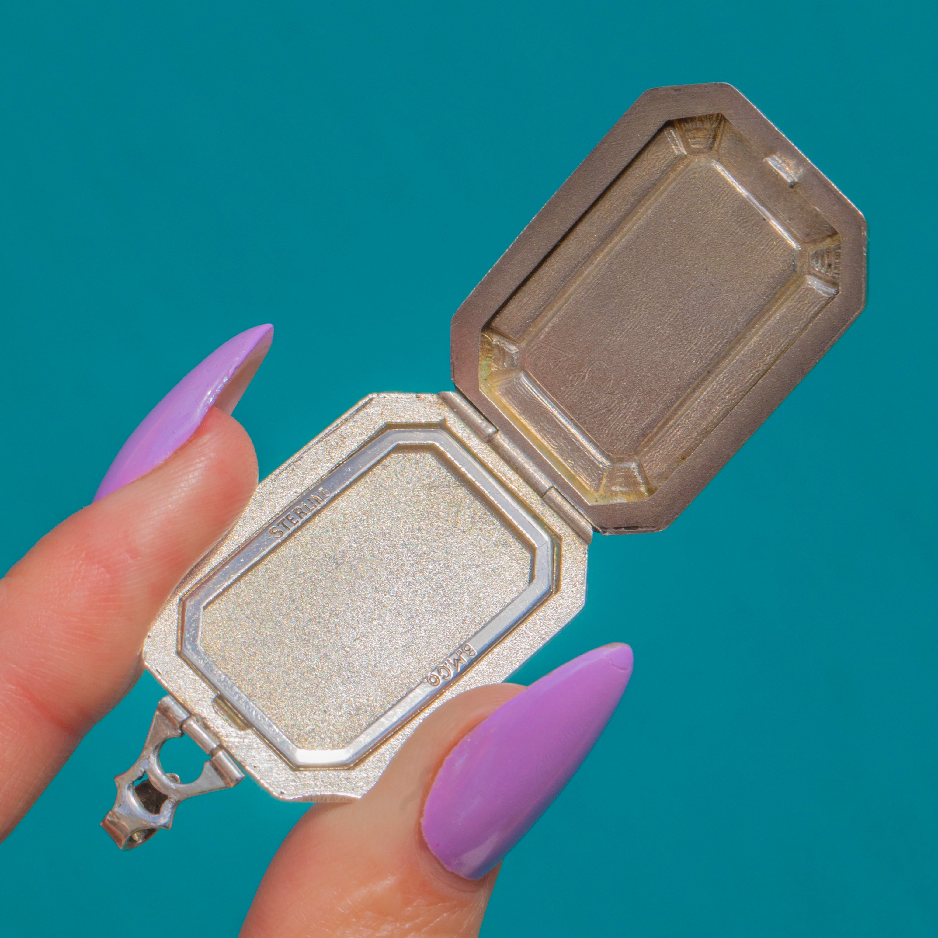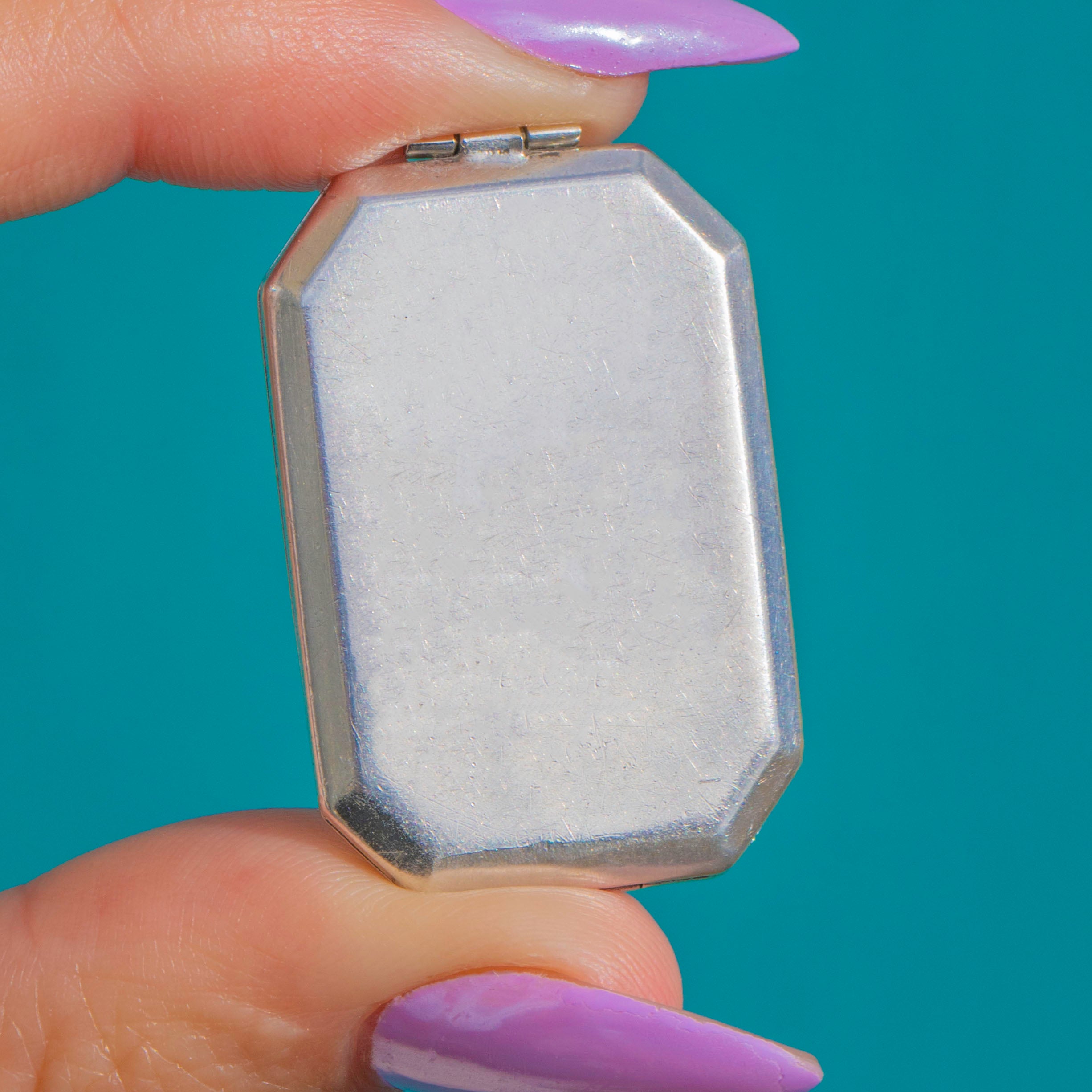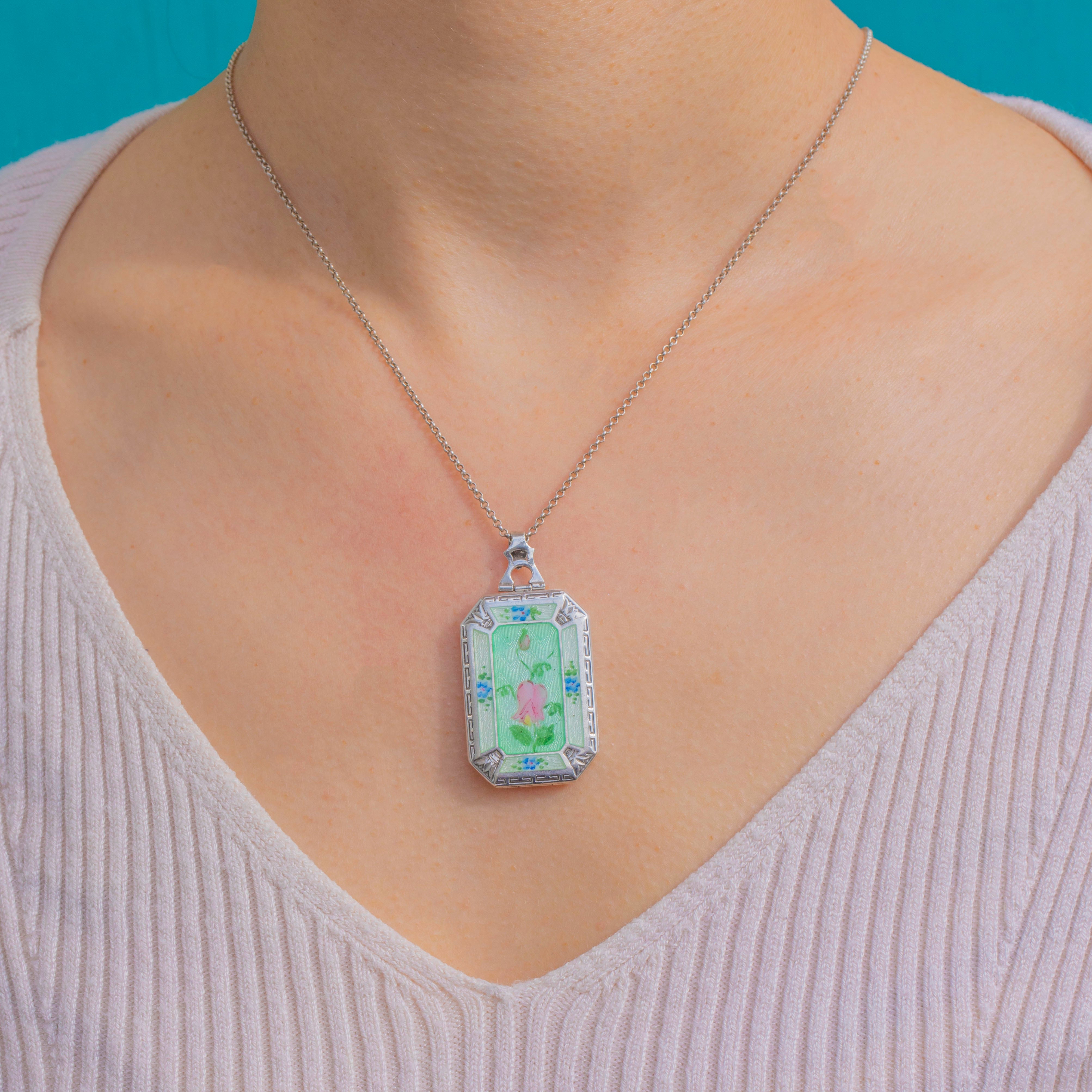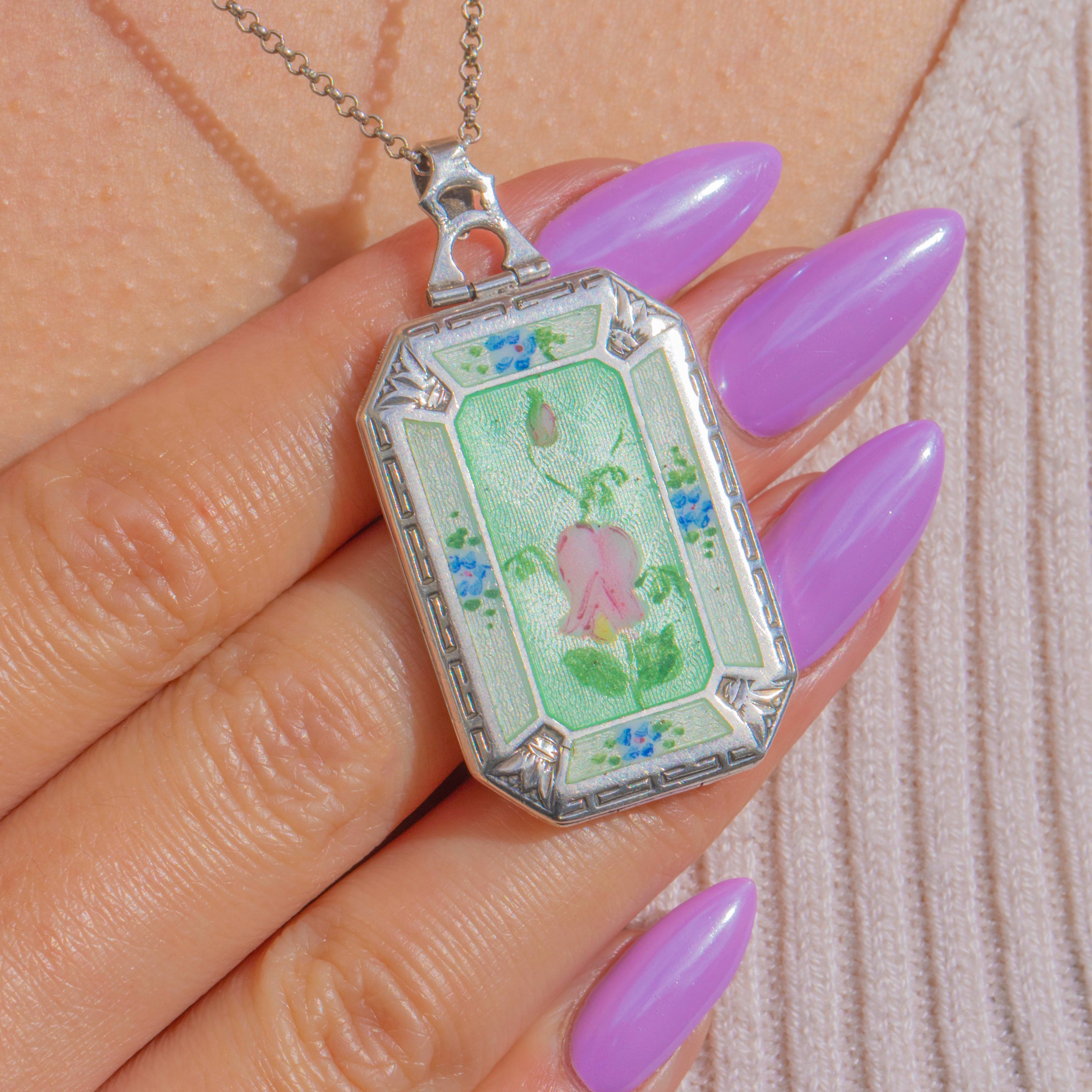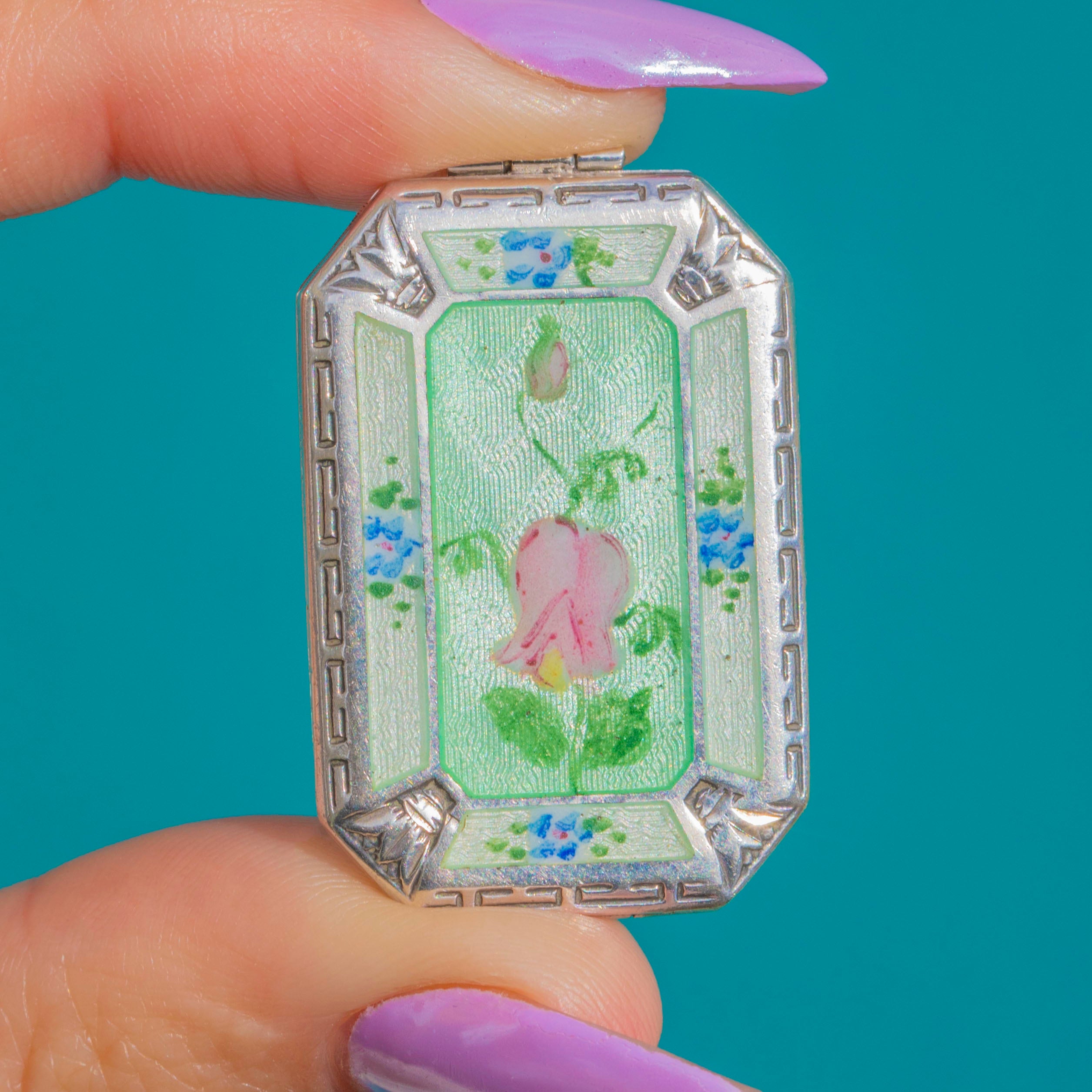 Ein bezauberndes Art Deco Guilloché-Emaille-Medaillon aus Sterling Silber, zart bemalt mit einer roséfarbenen Blütenknospe und winzigen himmelblauen Blütensprays auf einem blass seegrünen Grund. Das maschinengravierte Muster schimmert unter der transluzenten Emaille und wird von einem eleganten, achteckig-rechteckigen Rahmen mit feinen Gravurakzenten und einer dekorativen Öse eingefasst.
