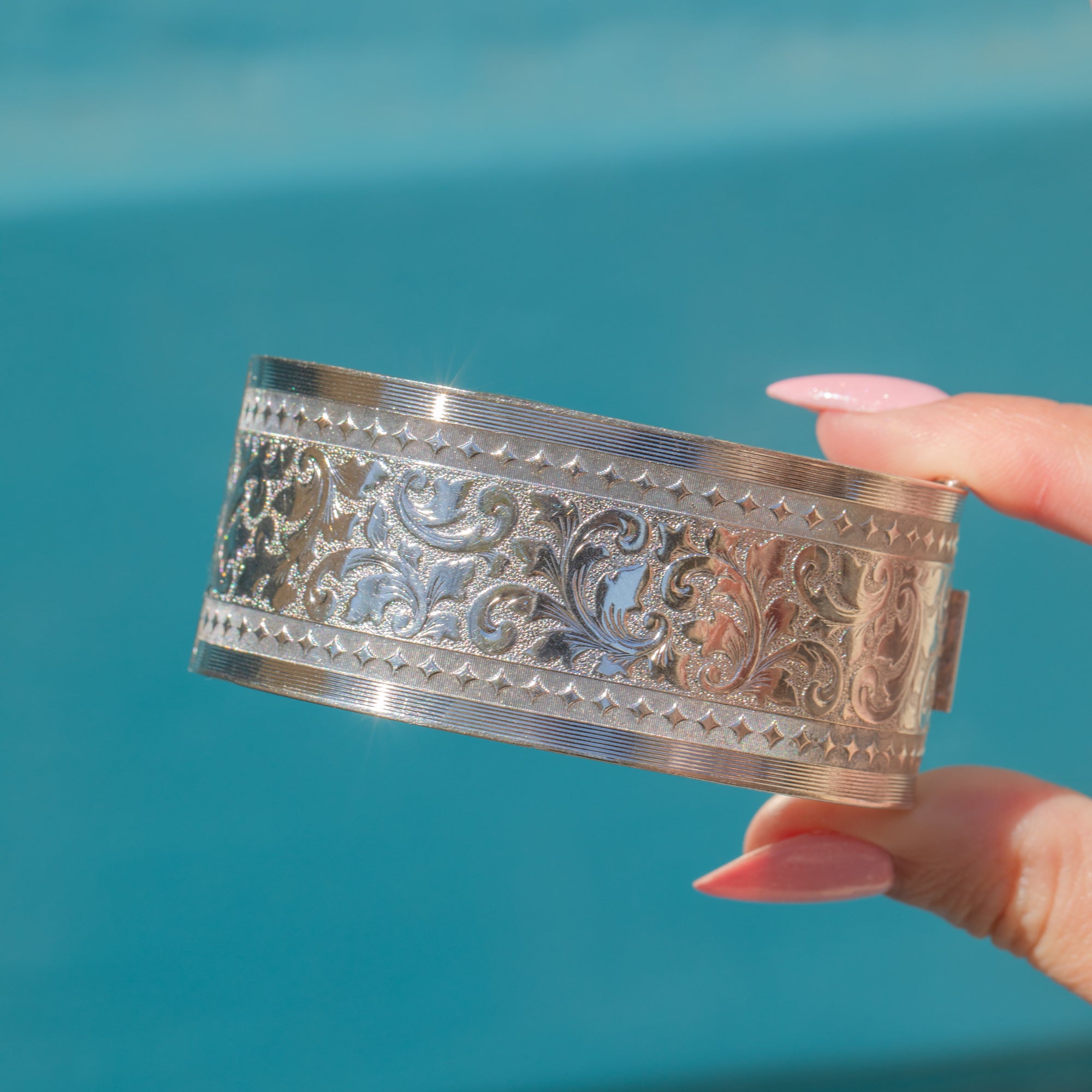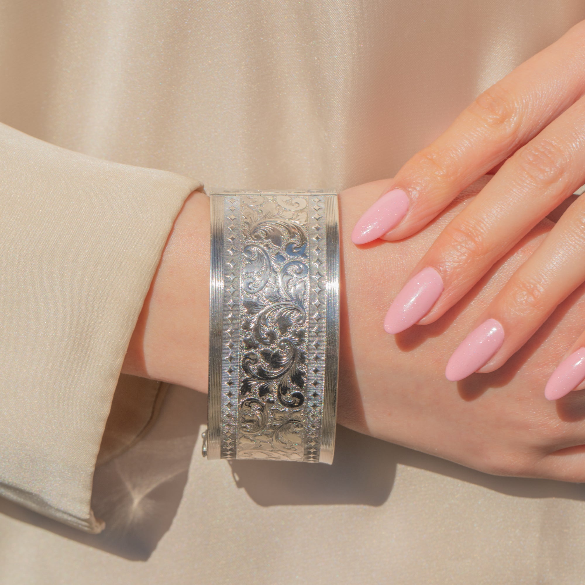 This Silver engraved cuff bangle will become an everyday essential! Intricately engraved floral details span the entire circumference of this vintage bangle, with sweeping lines that catch the light beautifully.