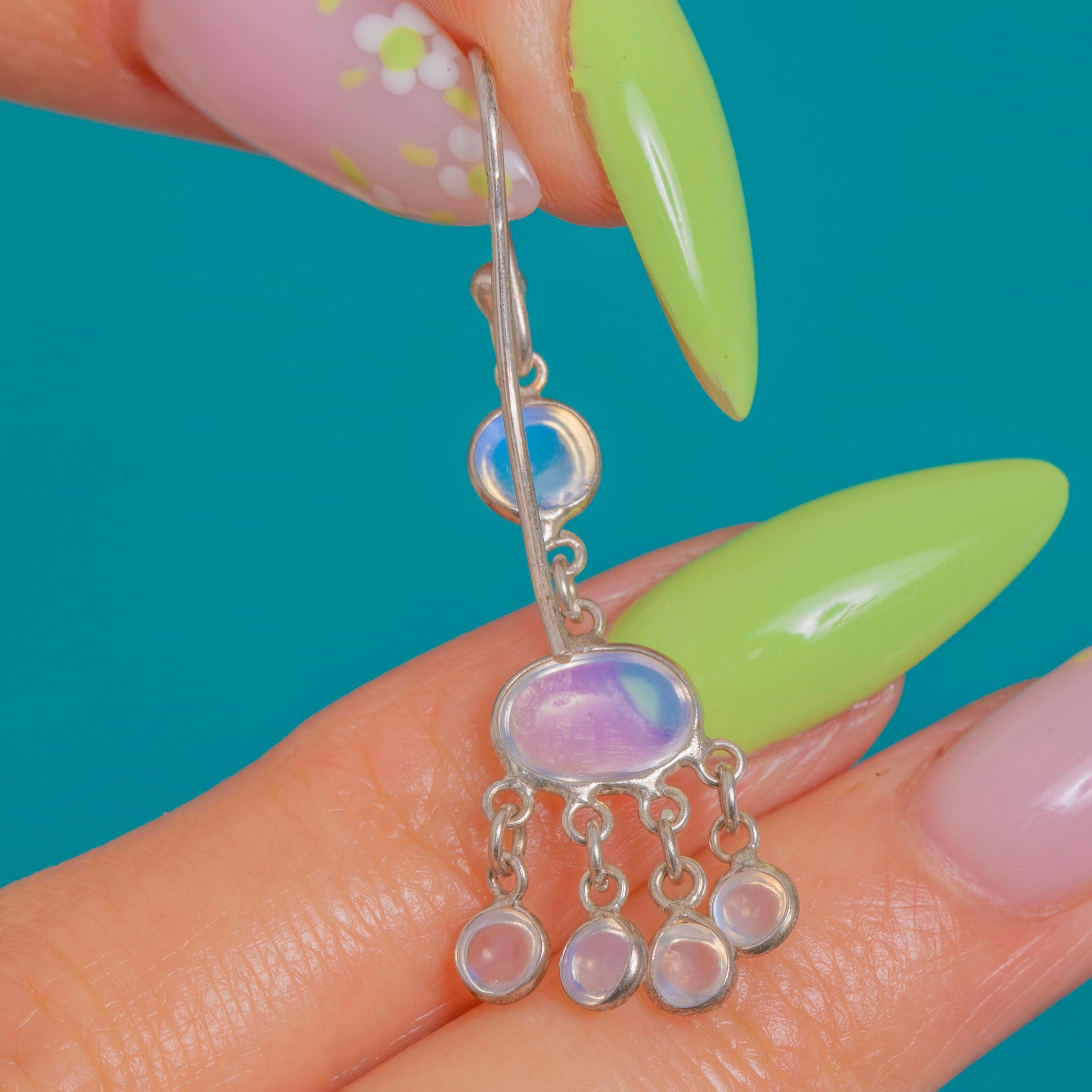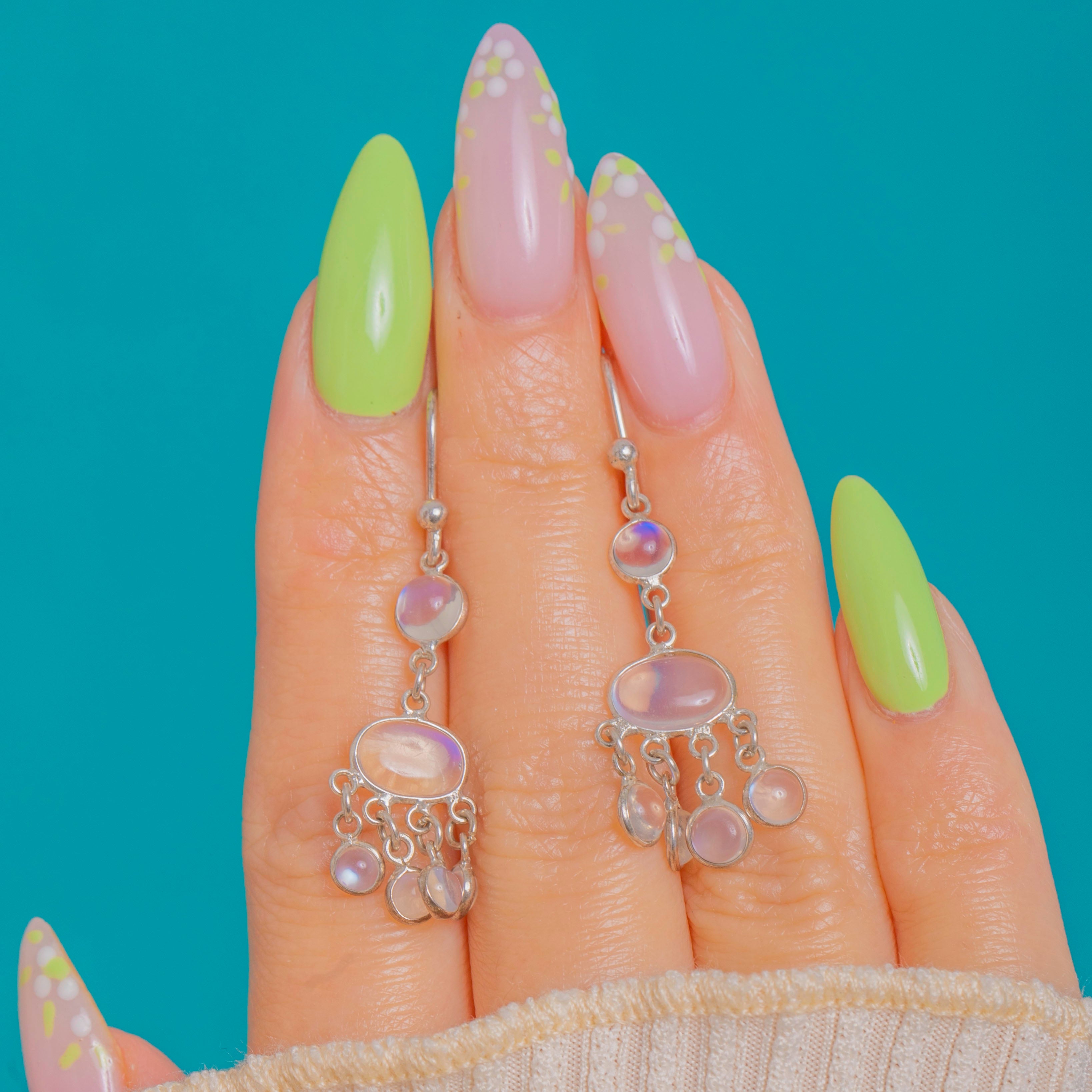 Luftig und romantisch schimmern diese Vintage-Mondstein-Chandelier-Ohrringe mit jenem unverkennbaren adularisierenden Glanz. Jeder Ohrring besteht aus einem kleinen runden Mondstein am oberen Ende, einem leuchtenden, horizontalen Oval im Zentrum und einer Kaskade kleiner, gefasster Cabochons, die bei jeder Bewegung anmutig tanzen.