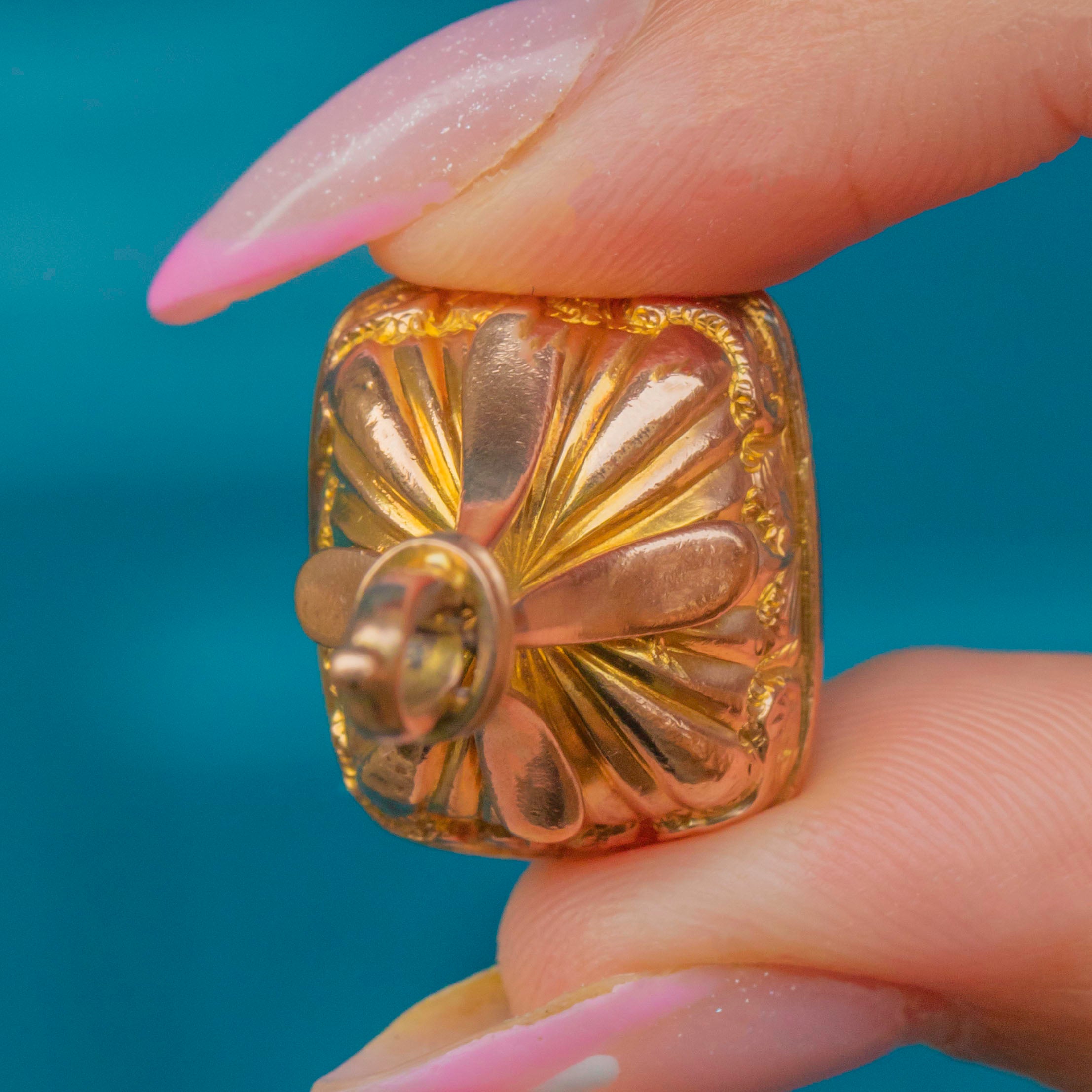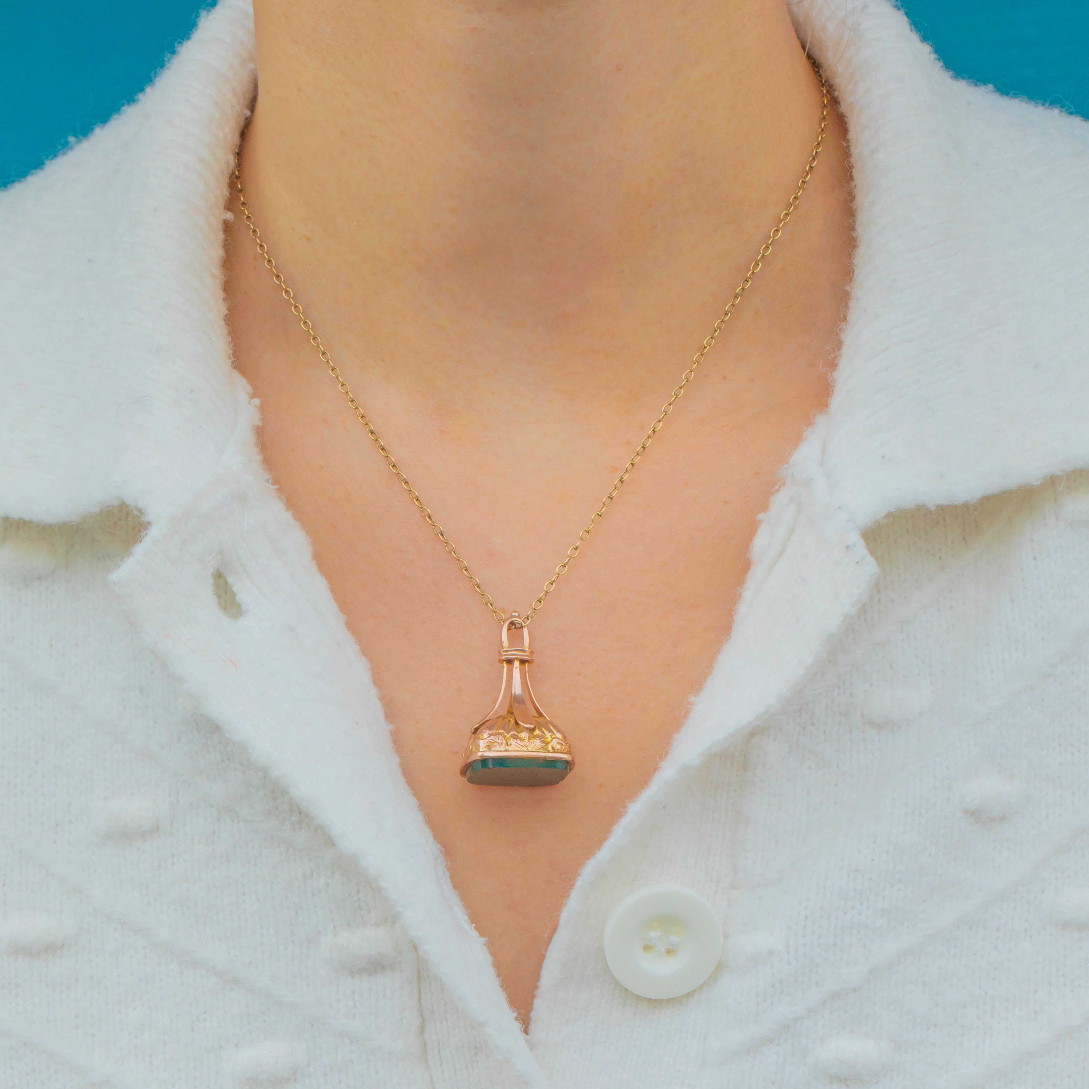 This antique Art Deco era 9ct Gold Bloodstone fob is undeniably beautiful! Crafted from solid sumptuous 9ct Gold in the year 1920, this lovely solid Gold fob has a speckled Bloodstone base, decedent texture and sleek lines that are synonymous with Art Deco design.