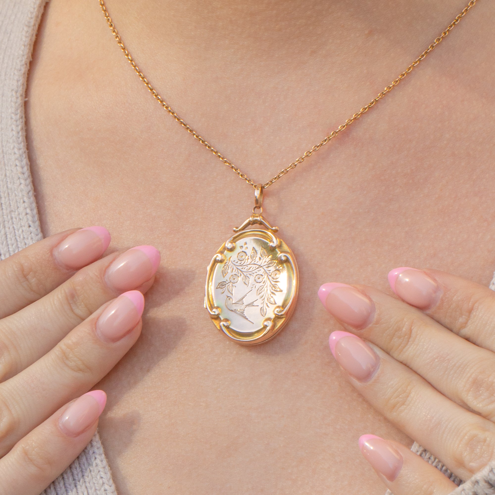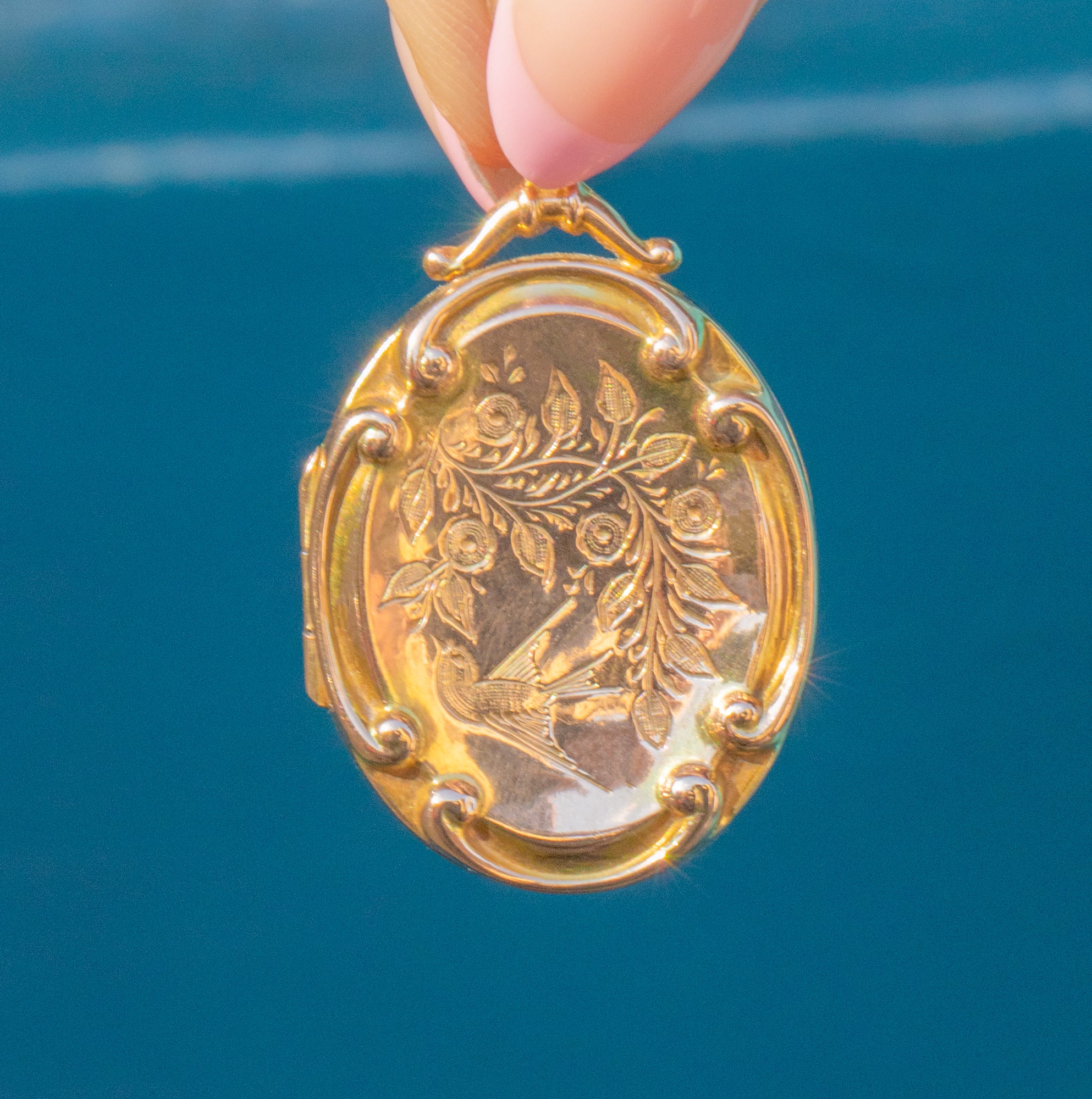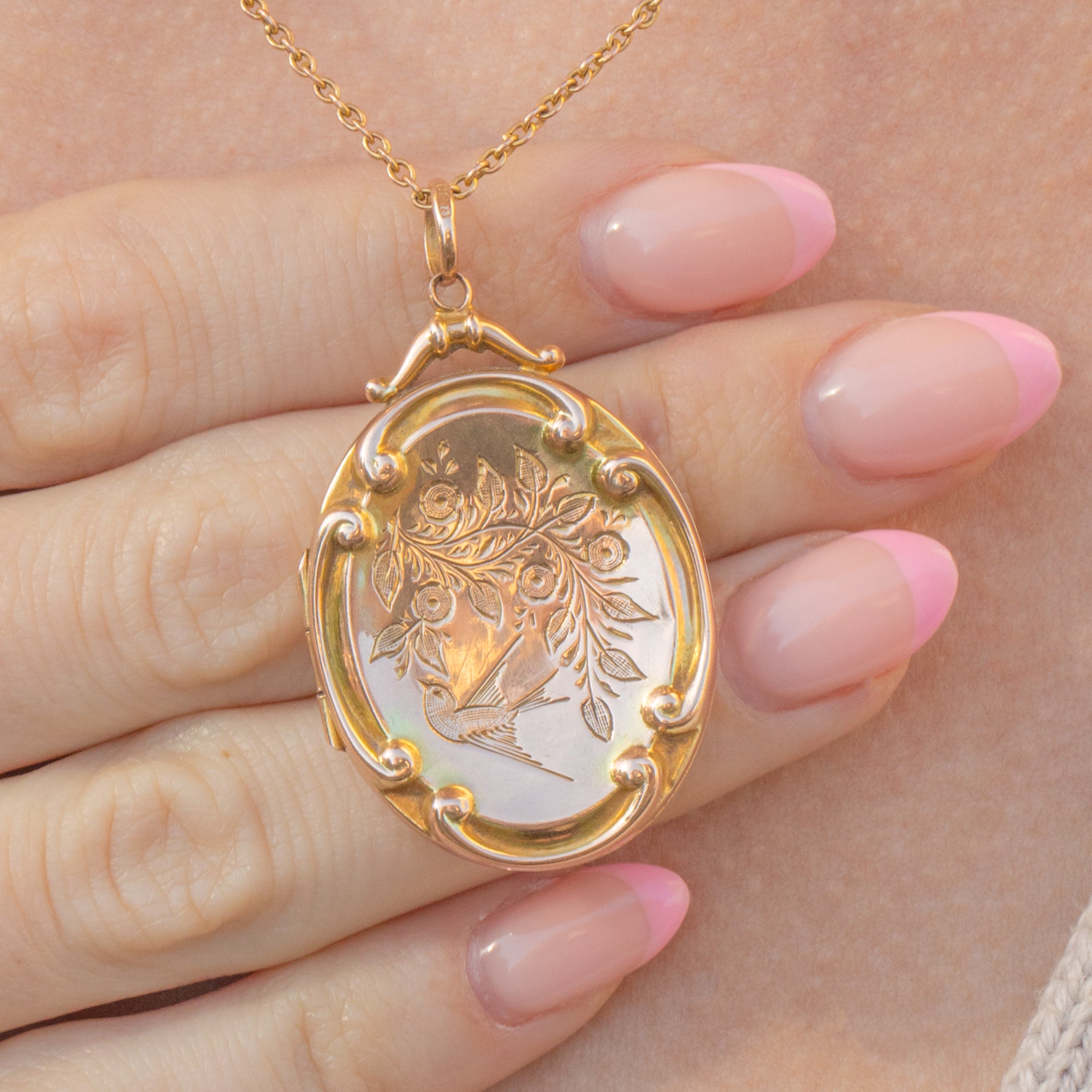 This solid 9ct Gold engraved swallow oval locket is gorgeous! Exquisitely engraved with delicate details on both sides, this decorative antique locket was made to be cherished for generations.