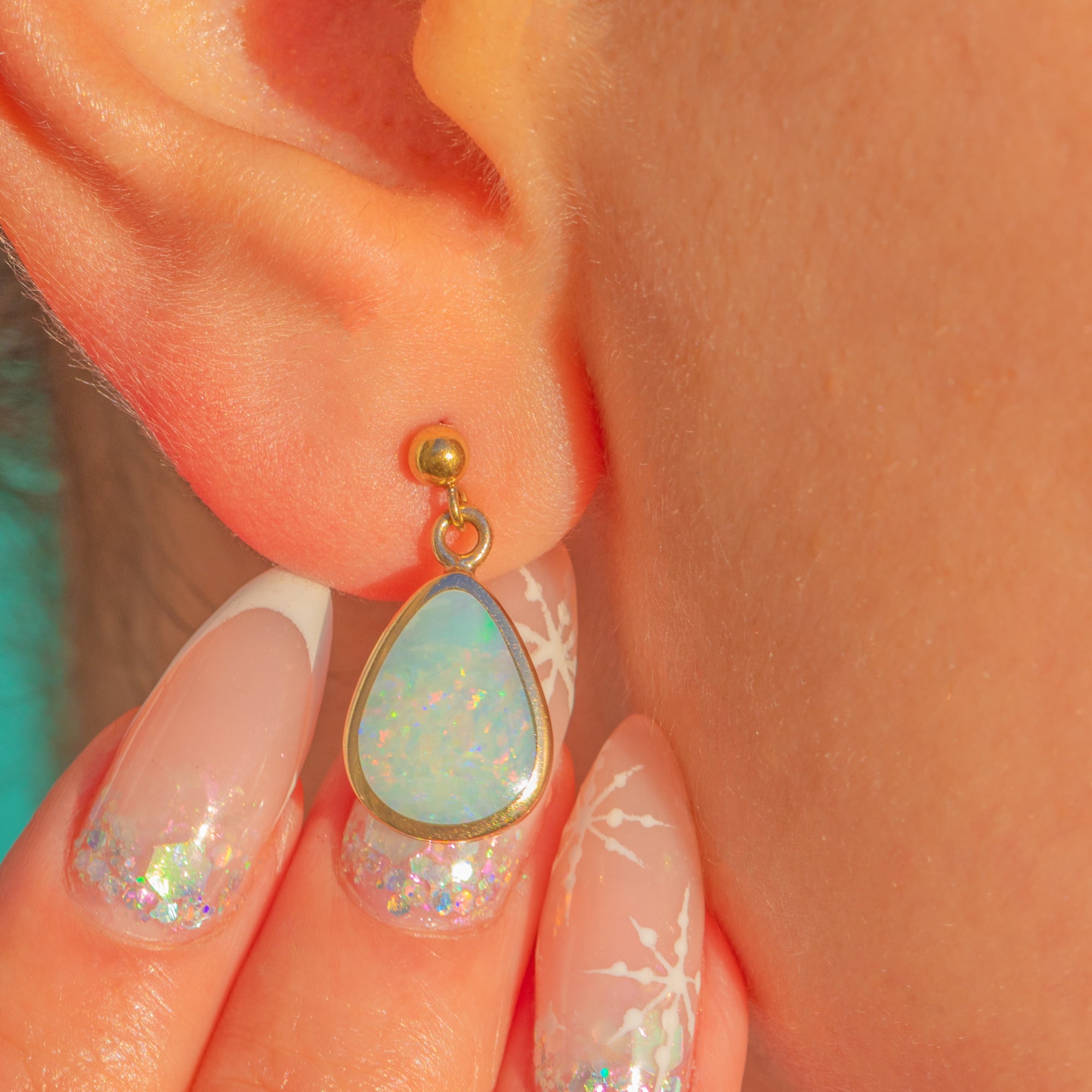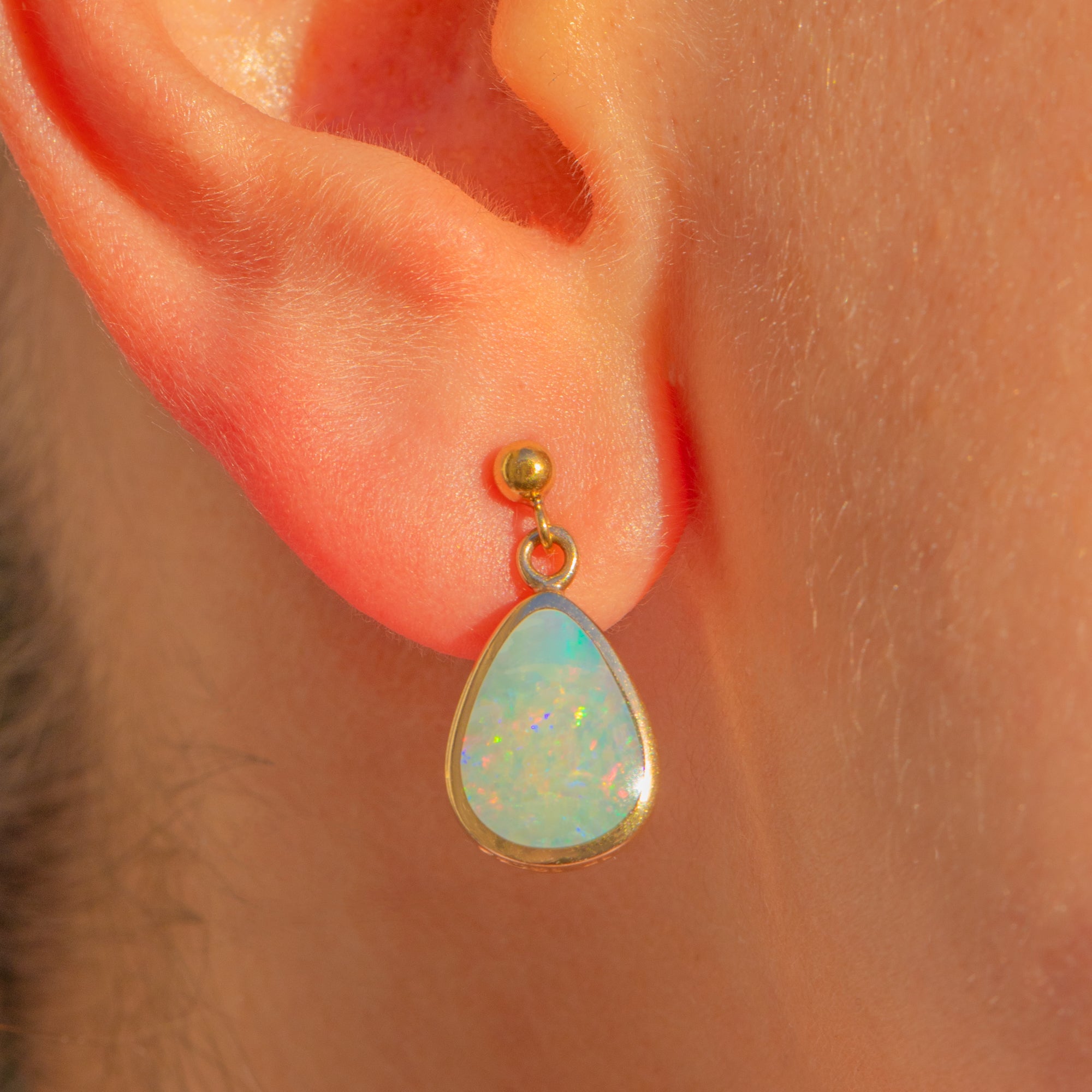 Die tropfenförmigen Opalcabochons sind in warmem 9ct Gold eingerahmt und bieten ein elegantes, raffiniertes Finish. Leicht am Ohr und dennoch ausdrucksstark, sind sie ein zeitloser und unkomplizierter Vintage-Klassiker.