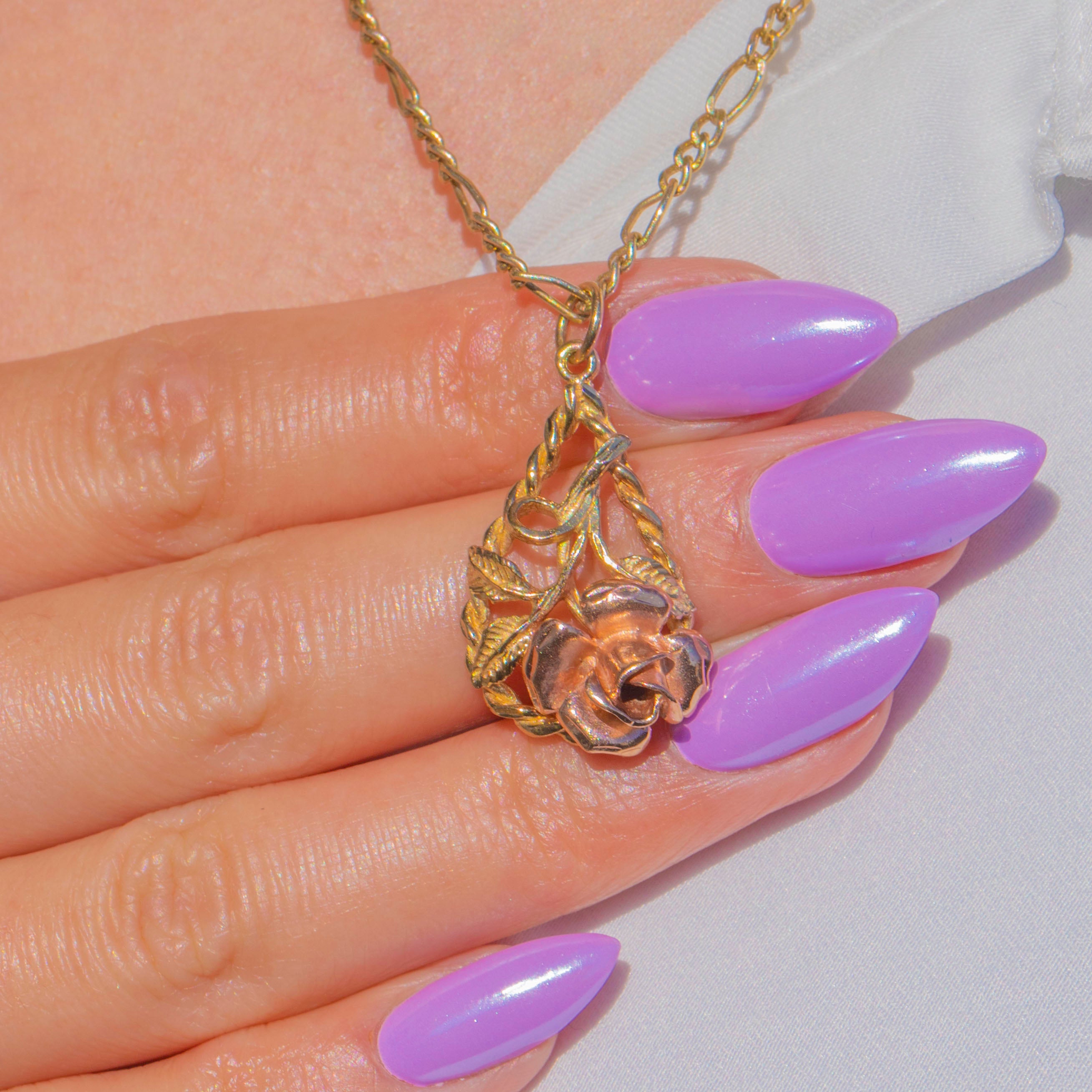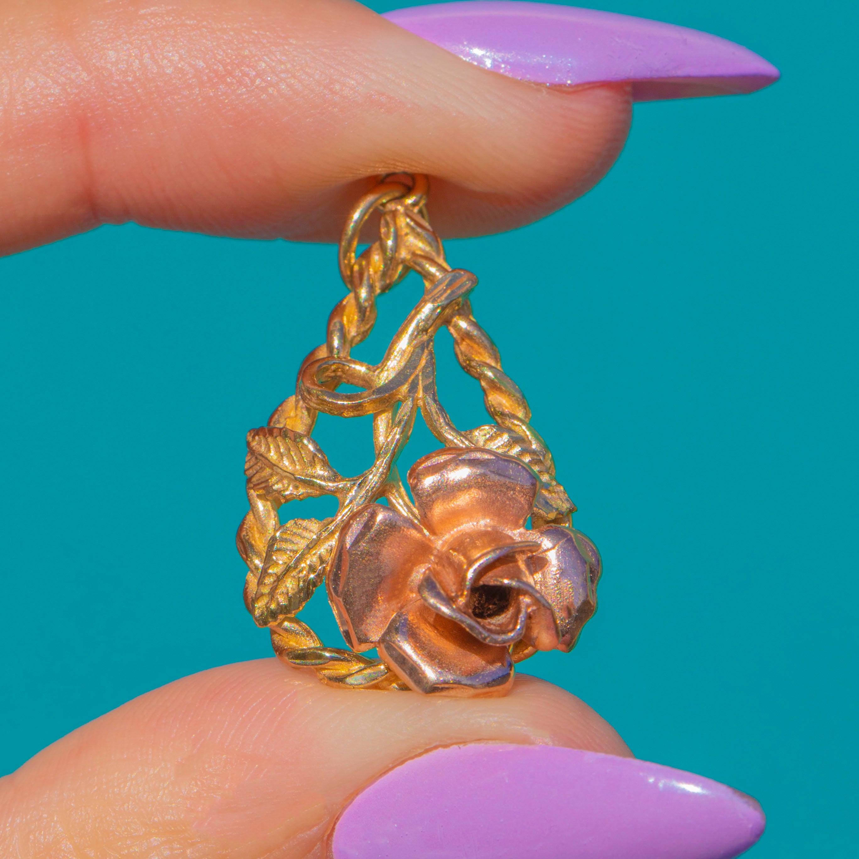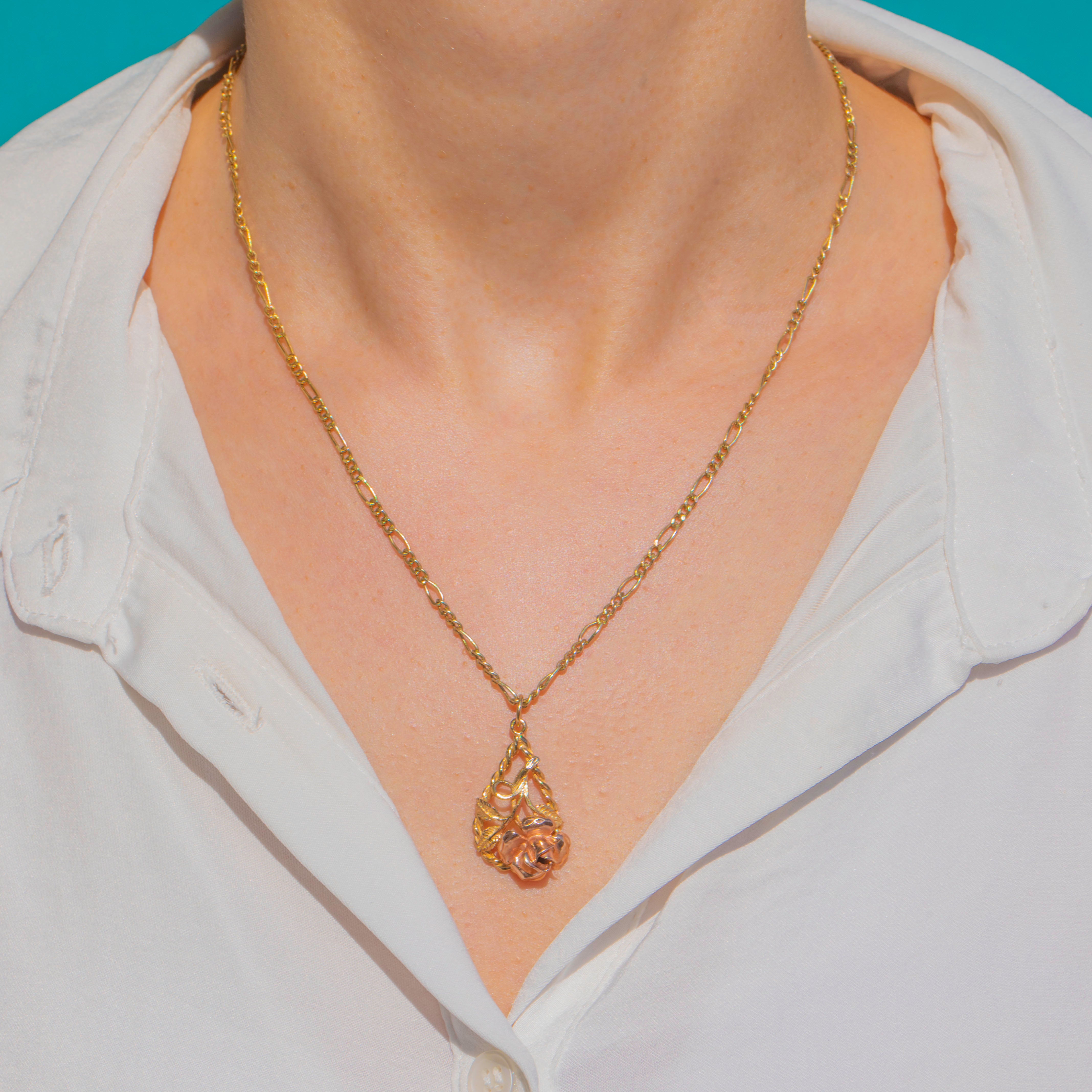 Romantik in voller Blüte: Dieser skulpturale Rosenanhänger ist in zweifarbigem 9ct Gold gefertigt und vereint warme Roségold-Blütenblätter mit einem tropfenförmigen Rahmen aus Gelbgold im Kordeldesign. Die Blüte ist in hohem Relief kunstvoll modelliert, mit rankenden Stielen und gravierten Blättern, die dem Schmuckstück anmutige Bewegung und Tiefe verleihen.