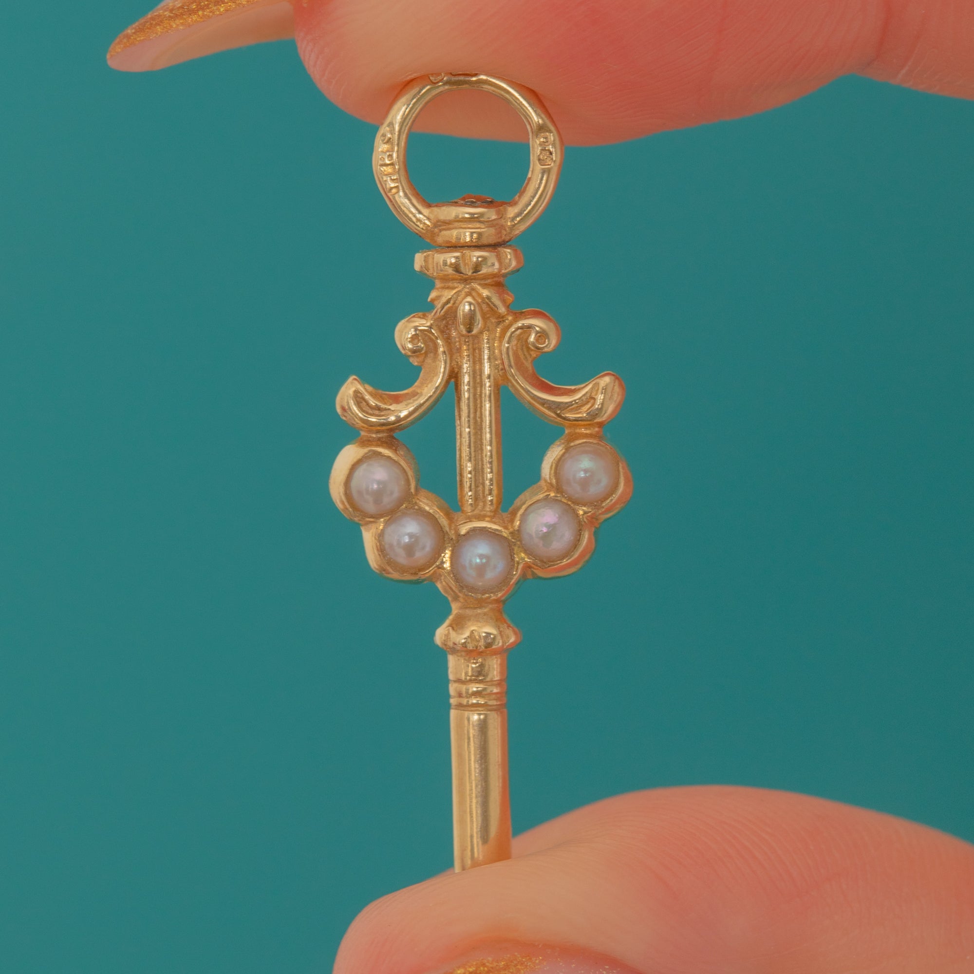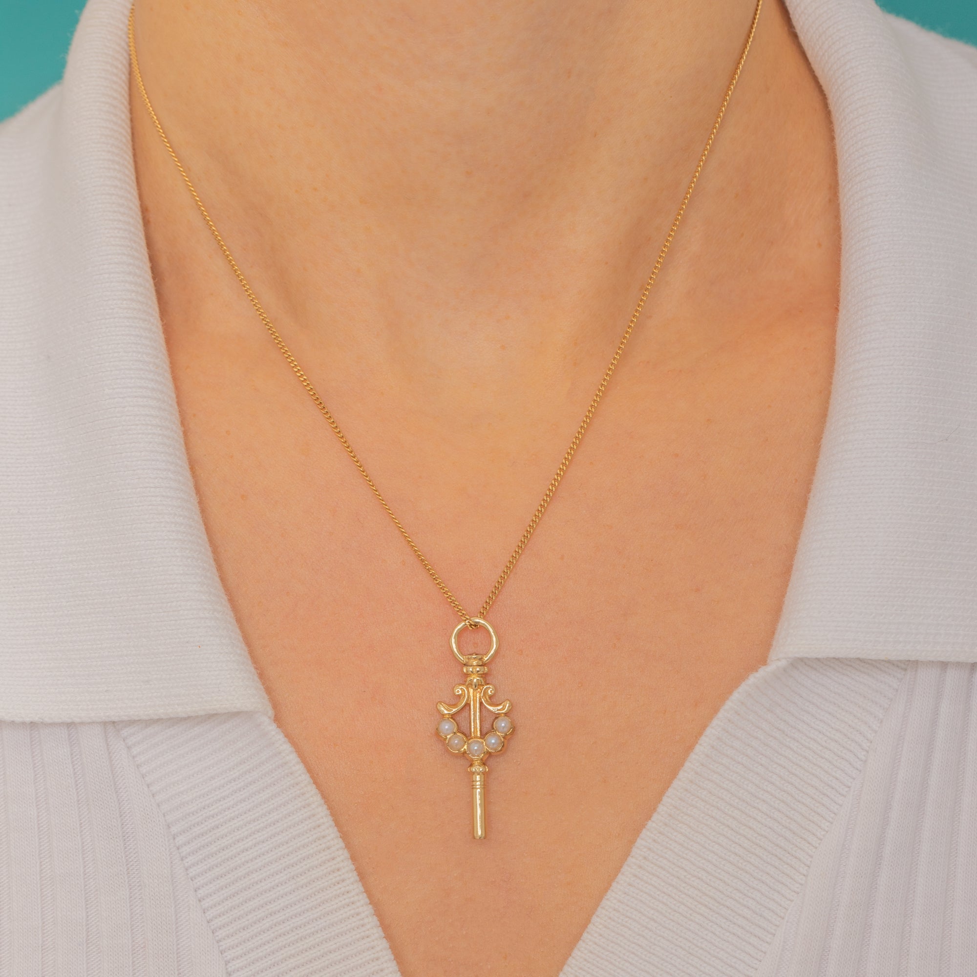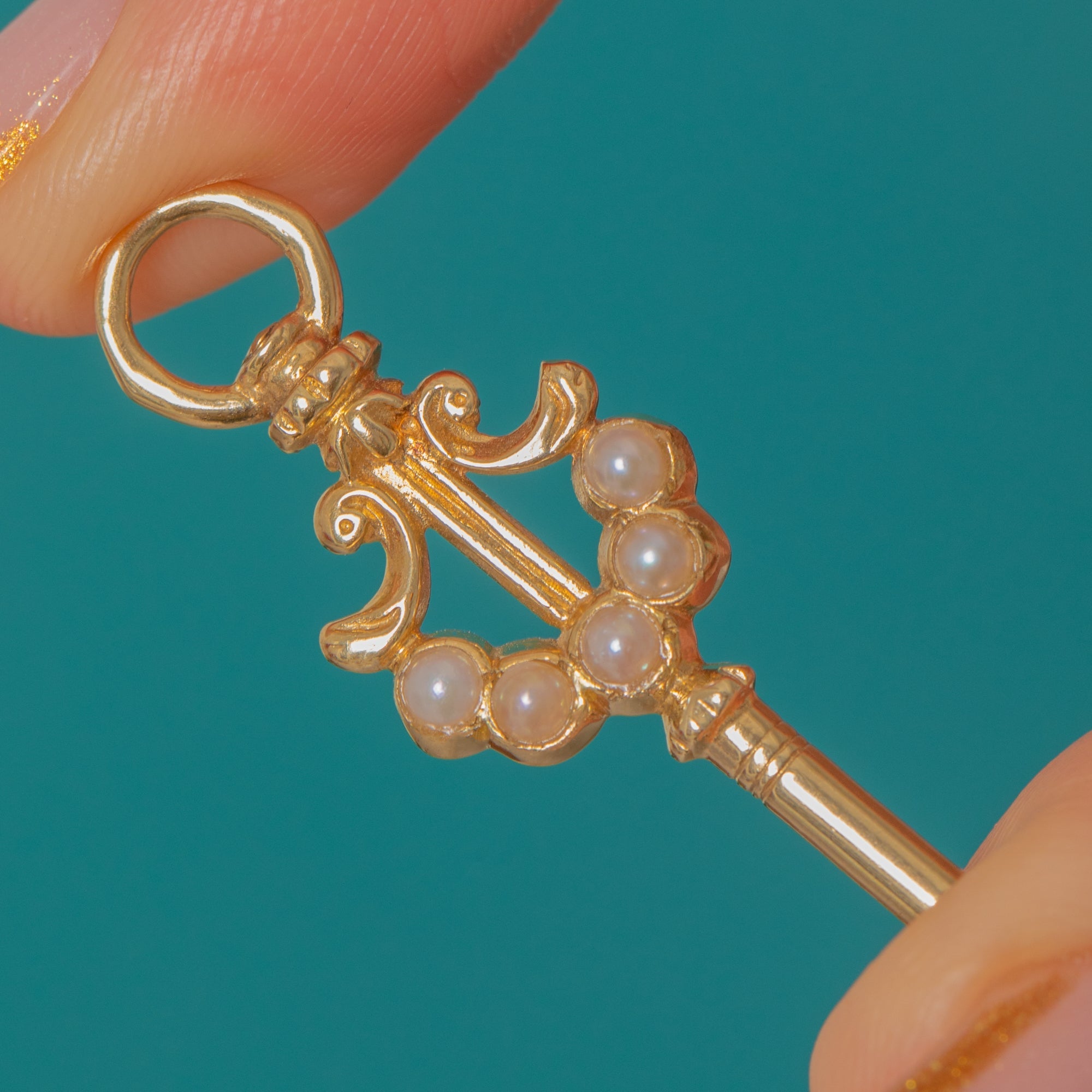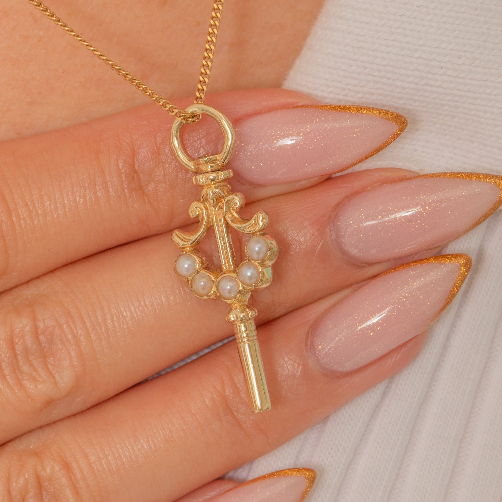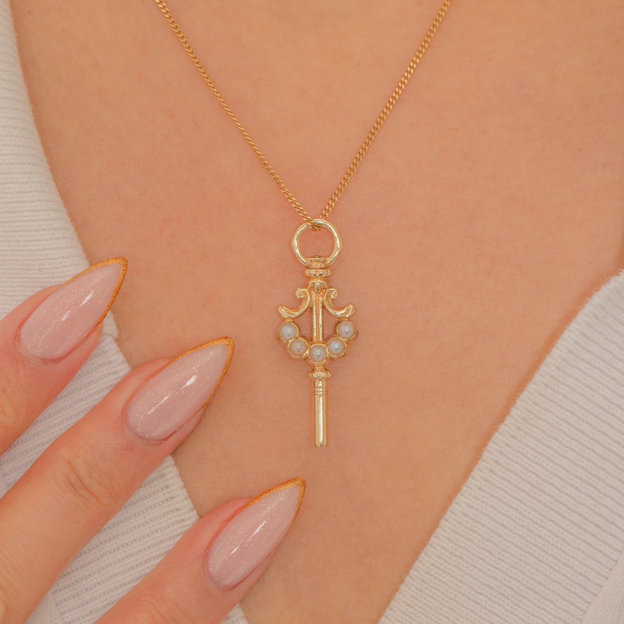 This beautiful vintage charm takes inspiration from Georgian and Victorian watch keys — once used to wind pocket watches — and reimagines the design as a luxurious pendant. Crafted in solid 9ct Gold and adorned with Natural Pearls, it captures all the antique romance of the original 18th and 19th-century forms.
