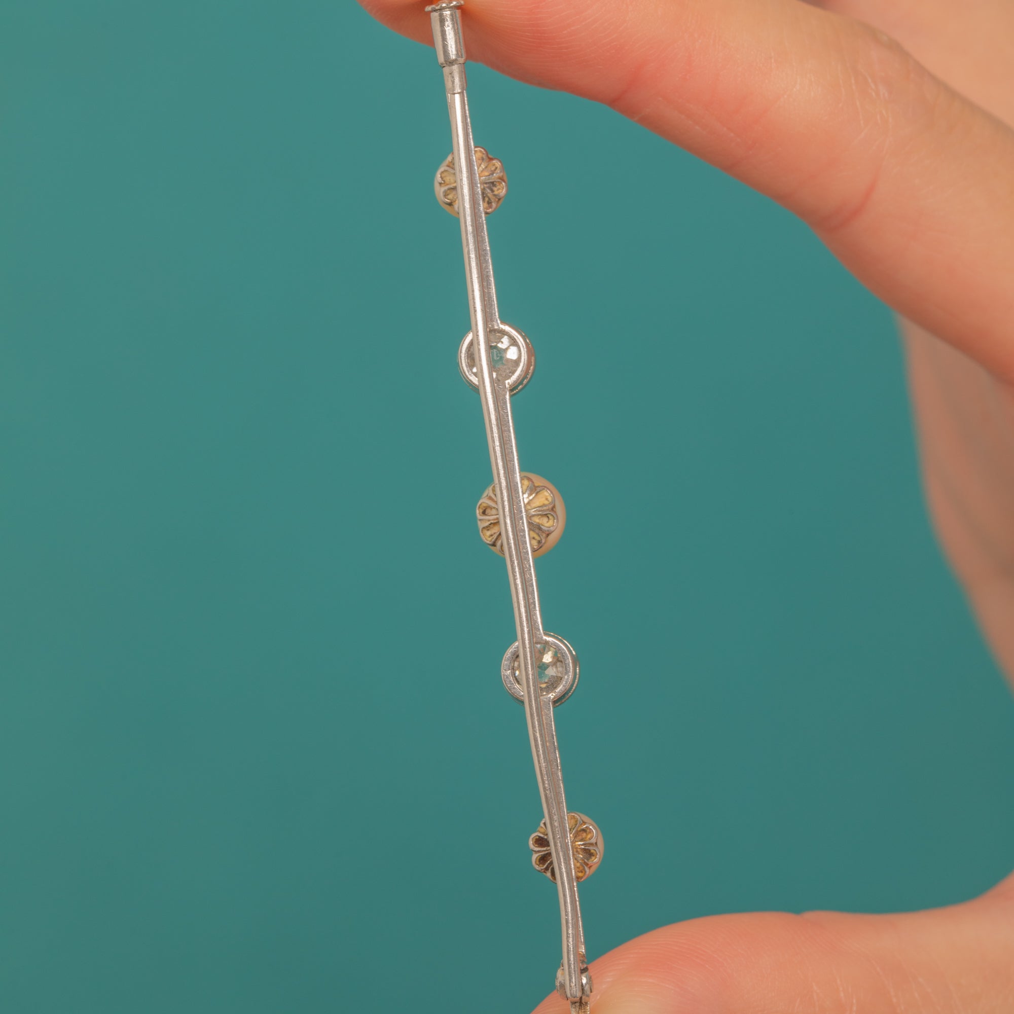 A refined Edwardian bar brooch in luminous Platinum, set with a graceful rhythm of Pearls and Old Mine Cut Diamonds. Two scintillating Diamonds, with a combined weight of approximately 1.20ct, alternate with creamy Pearls along the slender double-rail bar, while delicate milgrain edging around the collet-set Diamonds adds a whisper of texture and light.