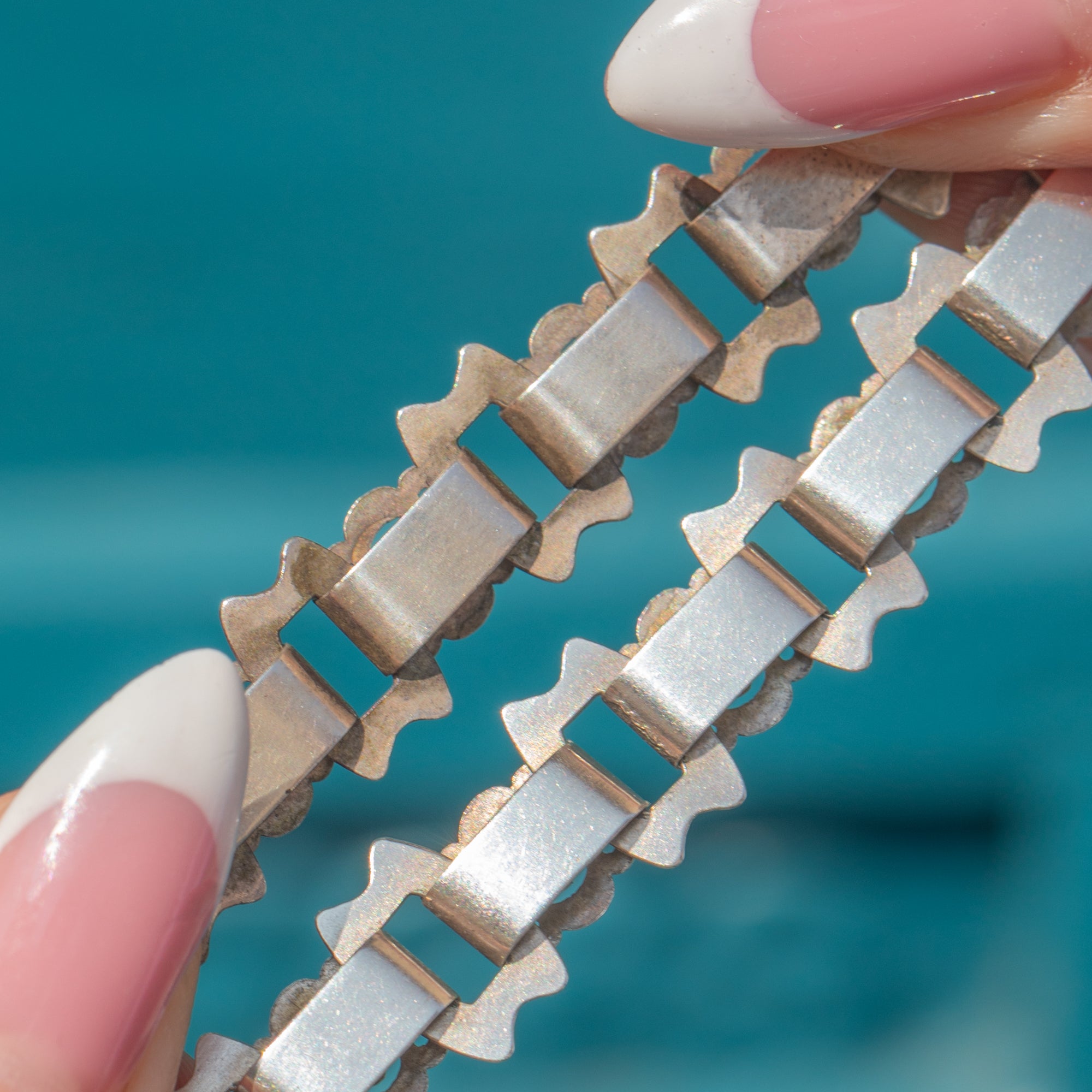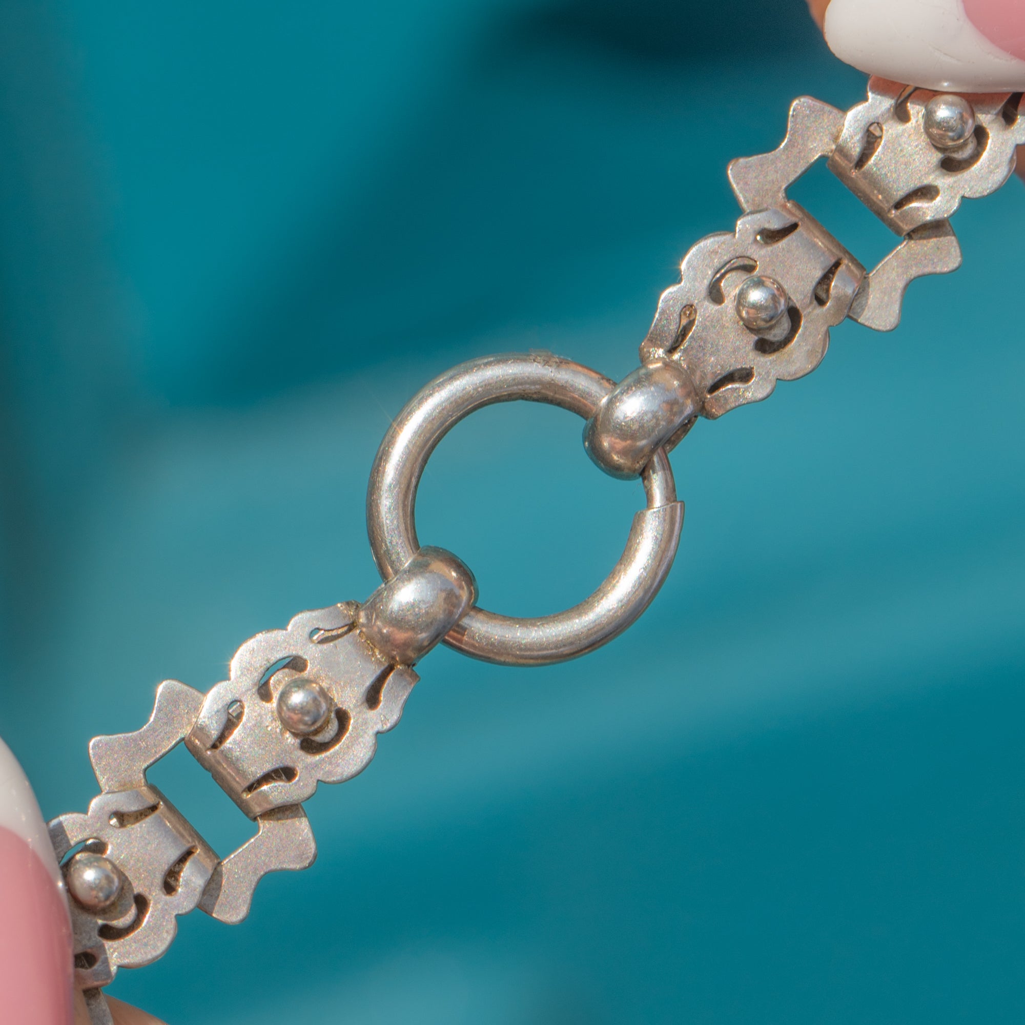 A Victorian Sterling Silver book chain collar necklace featuring a beaded design and finished with a secure bolt ring clasp. The classic style showcases the fine craftsmanship of the era.