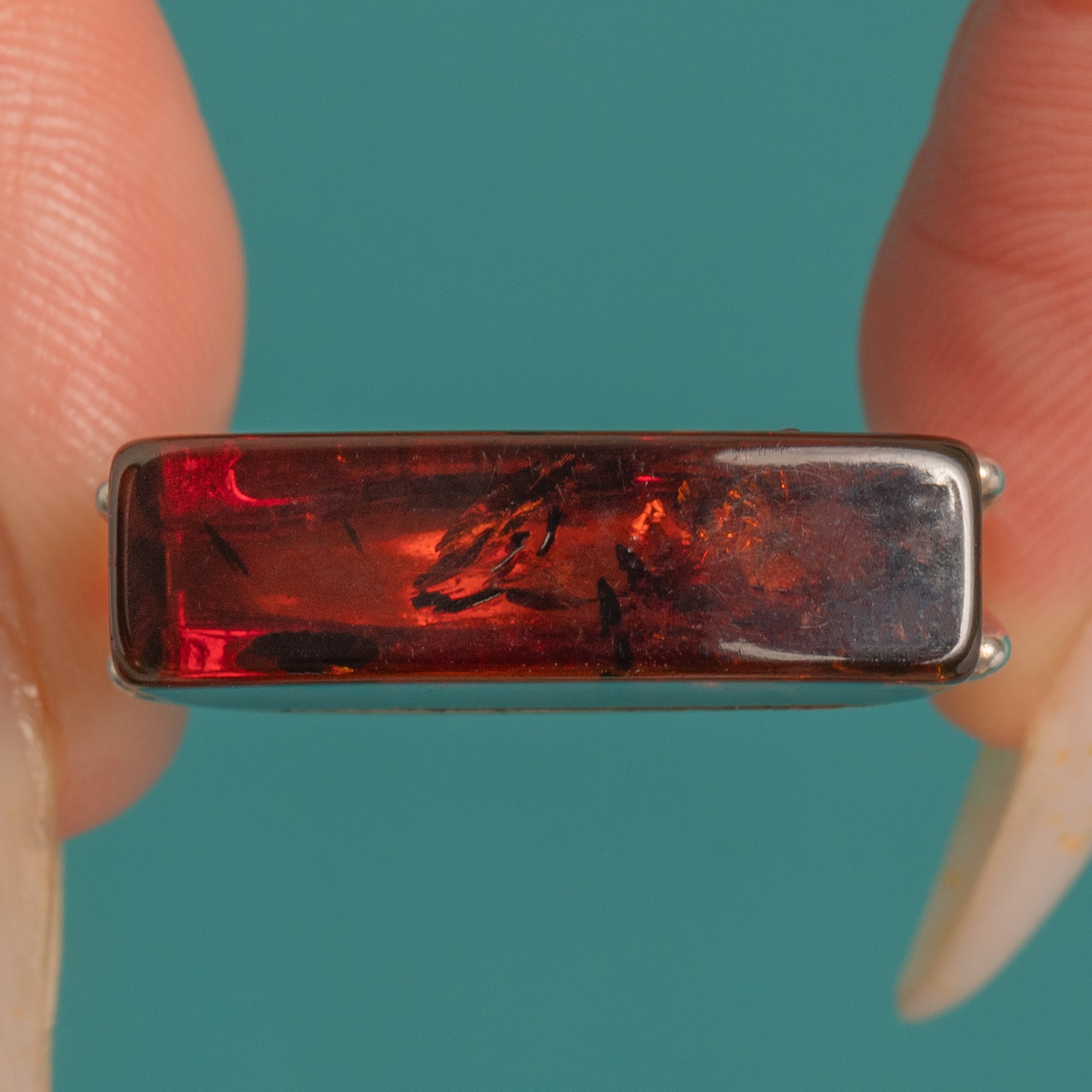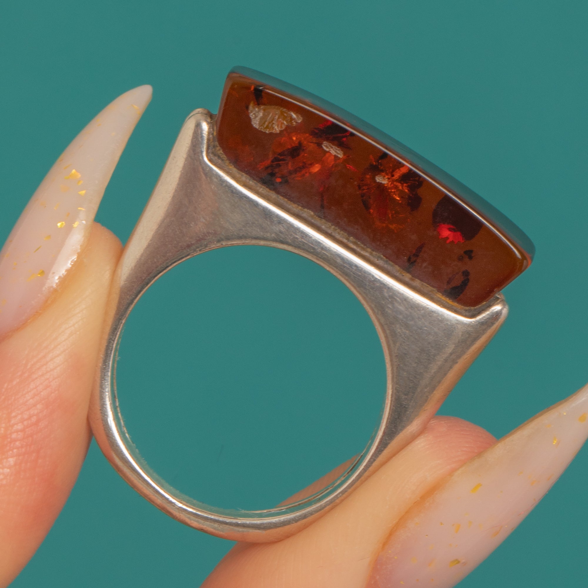 Sleek, sculptural and effortlessly bold, this Sterling Silver statement ring captures a distinctly Modernist mood. An elongated rectangular Amber cabochon sits in a smooth, substantial bezel, creating clean architectural lines that span the finger with confident presence.