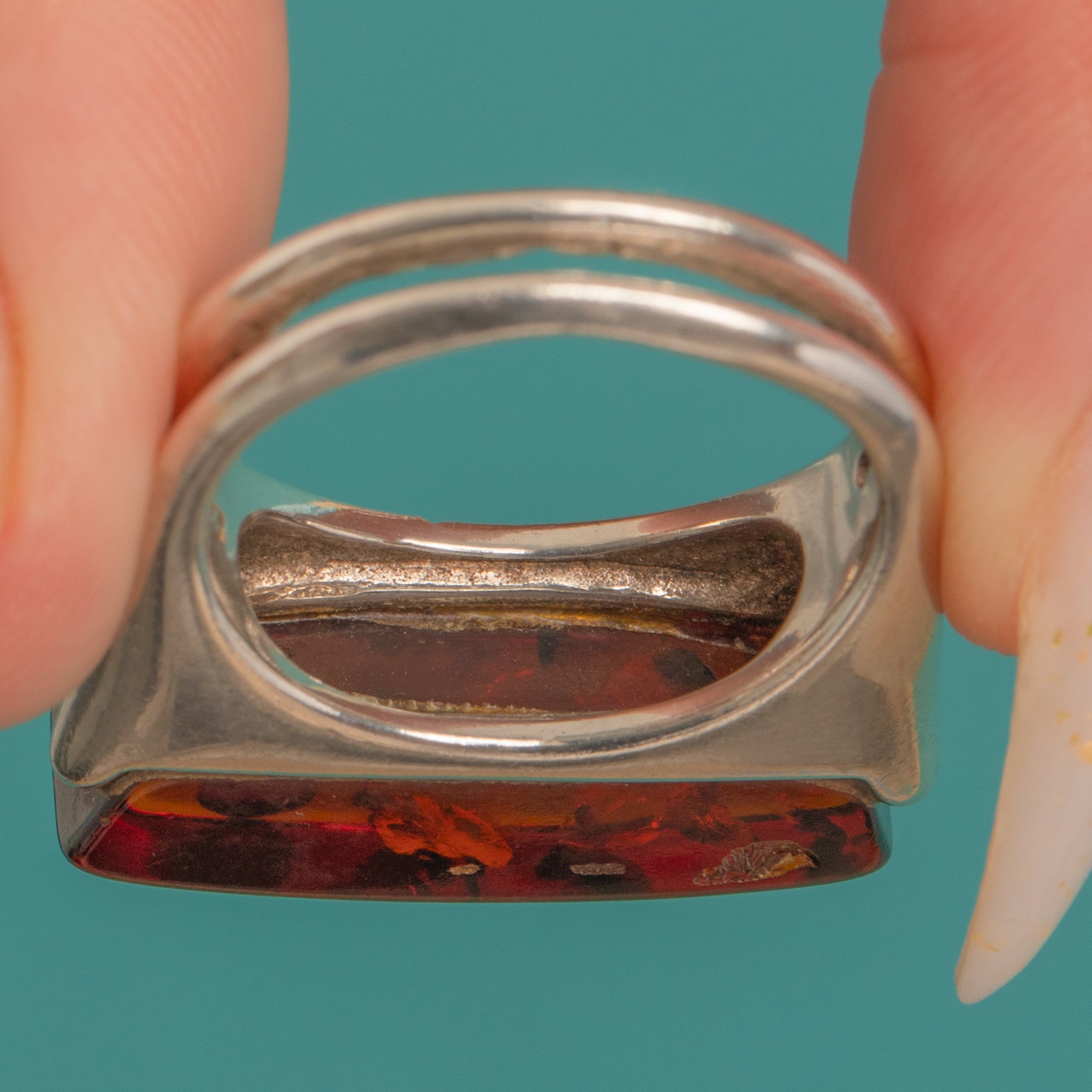 VERY GOOD: The Amber is free of chips and cracks, displaying attractive natural flecks. The Sterling Silver mount shows light, sympathetic surface wear and retains a pleasing patina. The band and setting are secure with no evidence of previous resizing.