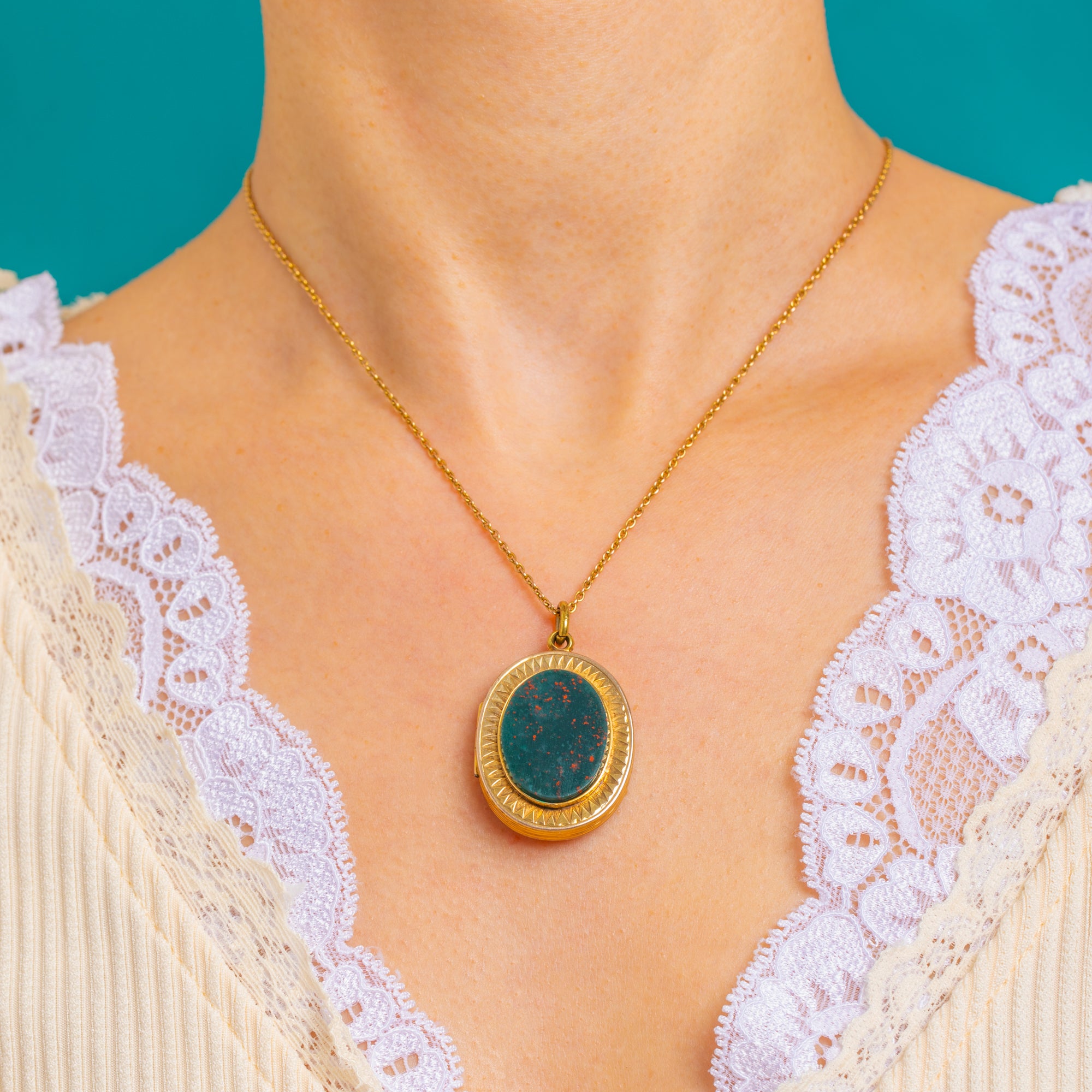 Ein eindrucksvolles Victorian-Medaillon aus sattem 9 Karat Gold, gekrönt von einem glänzenden Blutjaspis-Cabochon mit karmesinroten Sprenkeln. Der Cabochon wird von einem fein guillochierten Sonnenstrahlenrand und einer glatten Zarge eingefasst, was ein wunderbares Spiel zwischen Struktur und Glanz erzeugt.