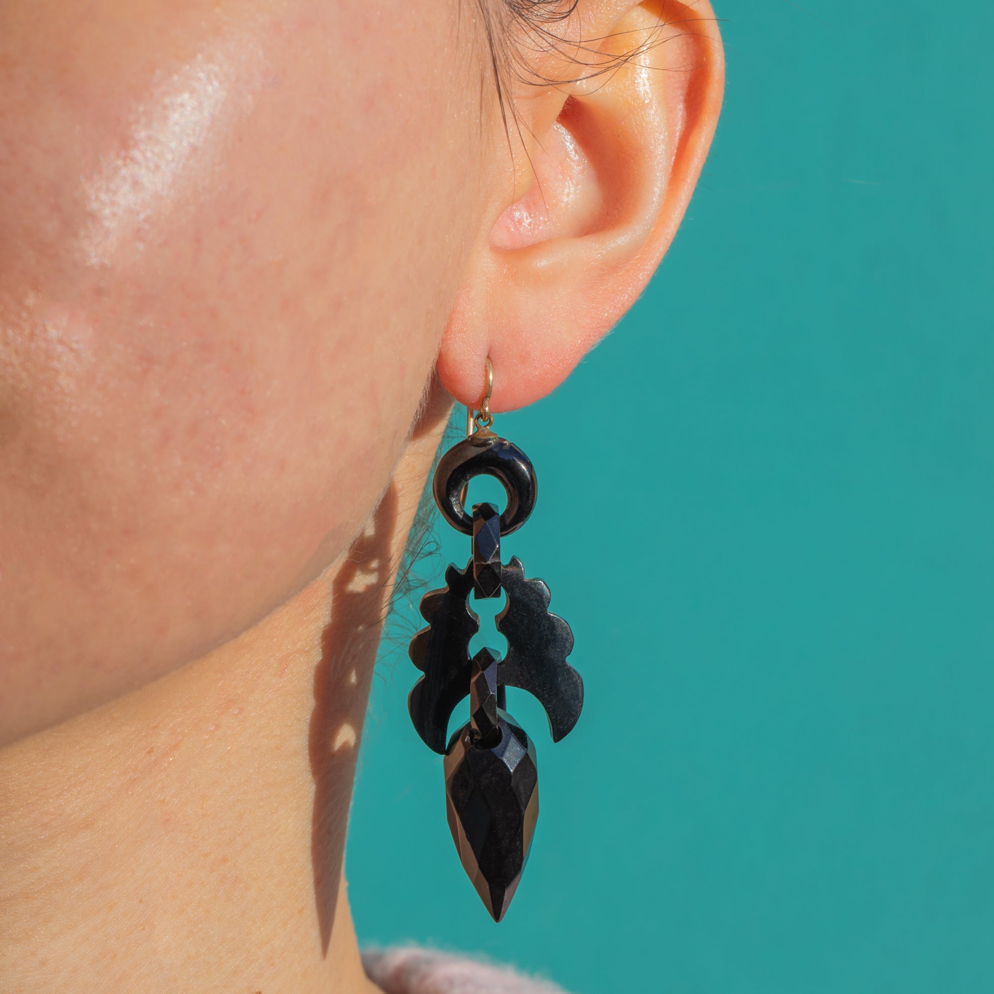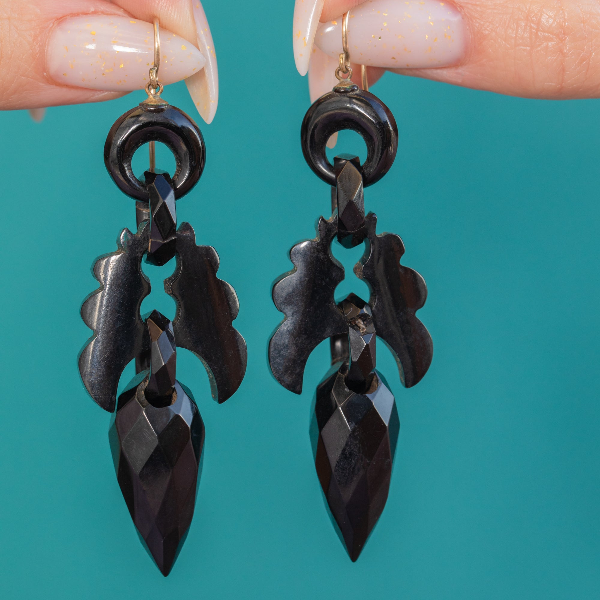 Dramatic and deliciously glossy, this Victorian pair of Whitby Jet drop earrings showcases the inky allure of finely carved Jet in a striking, fully articulated silhouette. A circular ring top leads to a faceted connector and an openwork foliate plaque, finishing with an elongated faceted teardrop that sways beautifully with every movement. The deep black polish and sculptural forms epitomise the refined, romantic elegance prized in 19th-century mourning jewellery.