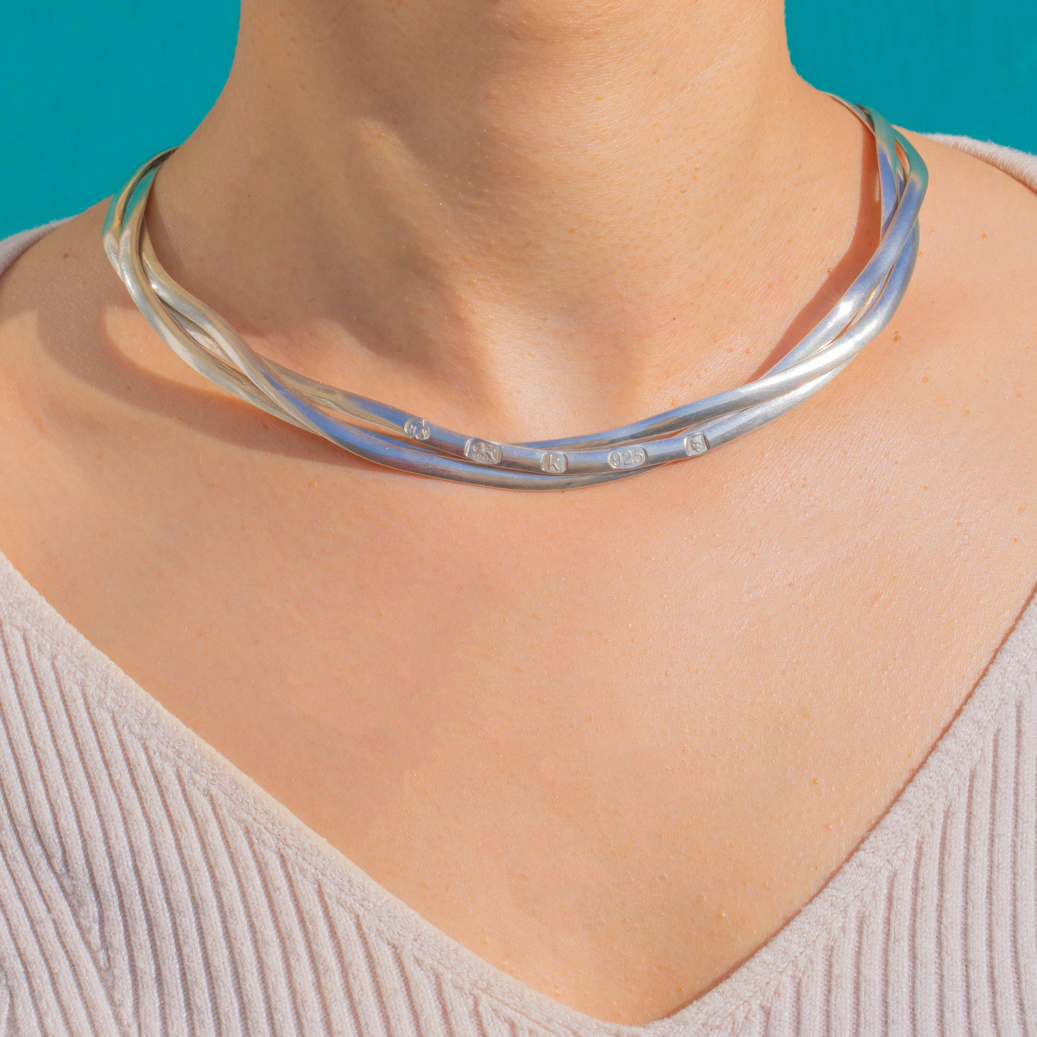 Elegant, skulptural und unverkennbar stilvoll präsentiert sich dieses Torque-Collier aus Sterling Silber, gefertigt aus drei abgerundeten, röhrenförmigen Strängen, die in einer klaren, von Flechtwerk inspirierten Anordnung gestaltet sind. Das strahlende, hochglanzpolierte Finish und die lineare Silhouette setzen ein markantes, minimalistisches Statement mit architektonischer Raffinesse.