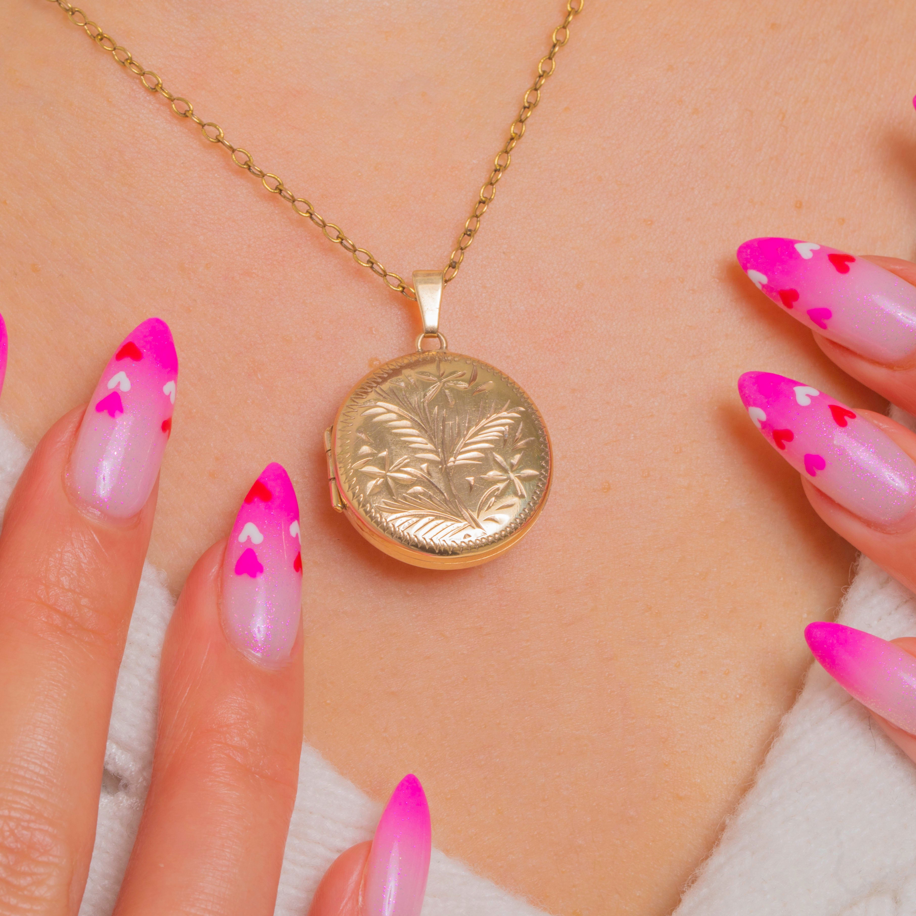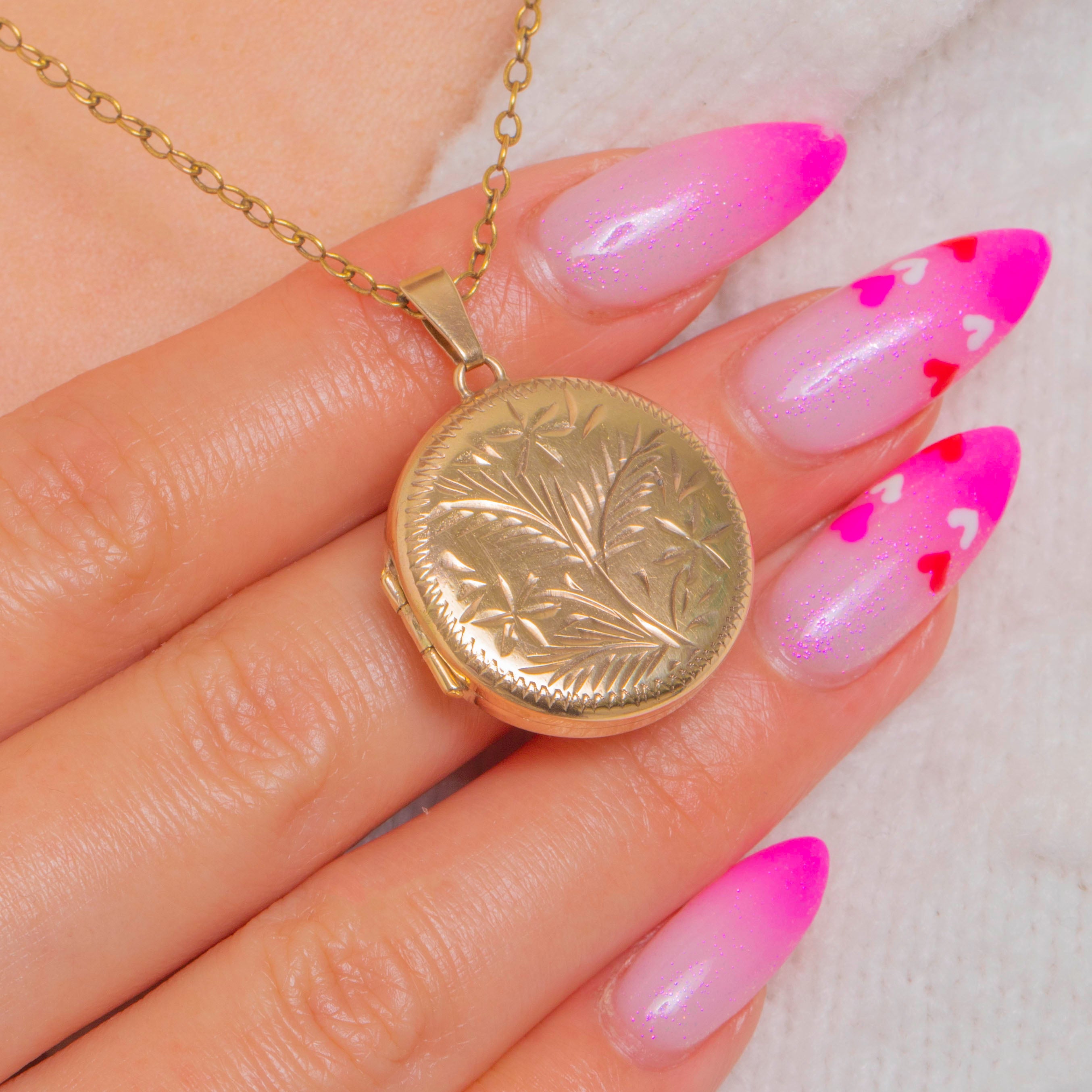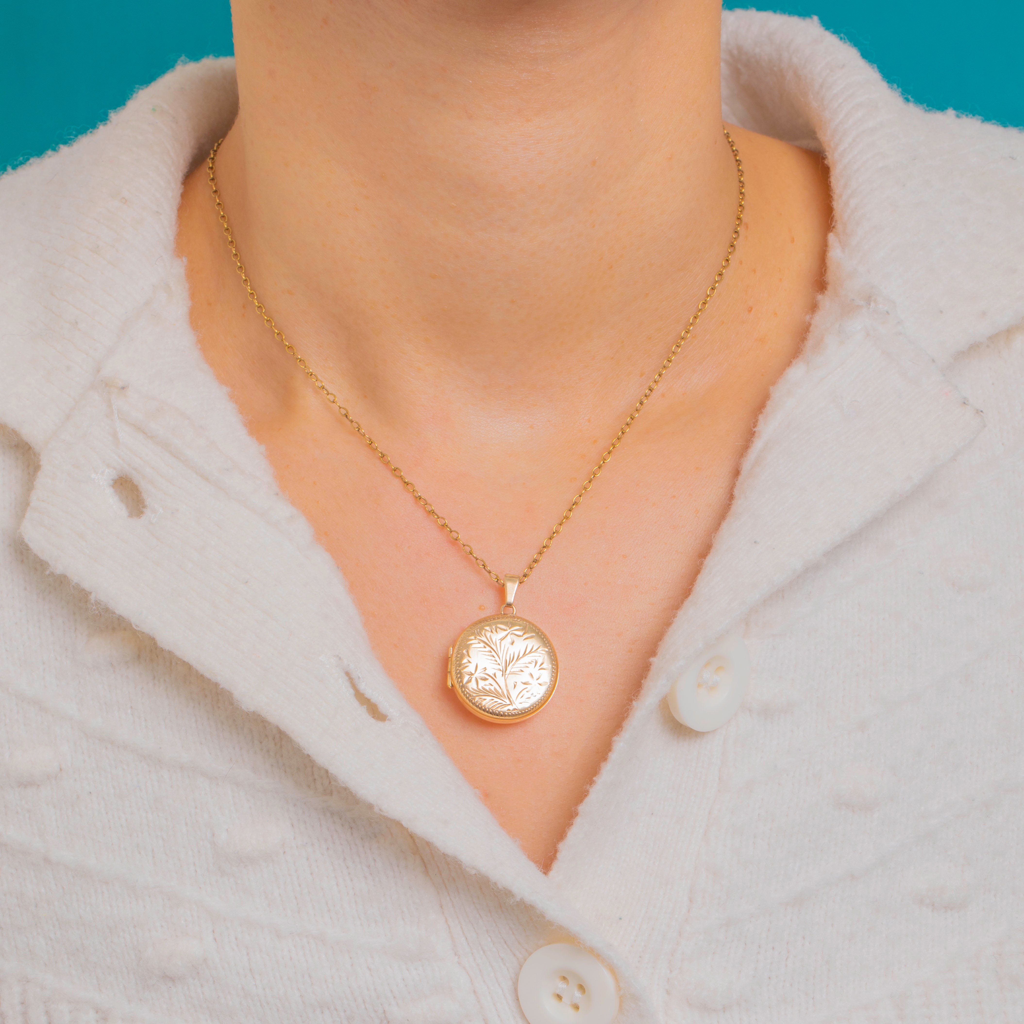 Herzlich und voller Gefühl: Dieser runde Vintage-Anhänger aus 9-karätigem Gold ist mit einem von Hand gravierten Blattdekor geschmückt, das von einem klaren Zickzackrand eingefasst wird. Die Vorderseite glänzt sanft mit ihren feinen Gravuren, während die Rückseite glatt und hochglanzpoliert ist und eine vollständige Punzenreihe aus dem Jahr 1978 trägt.