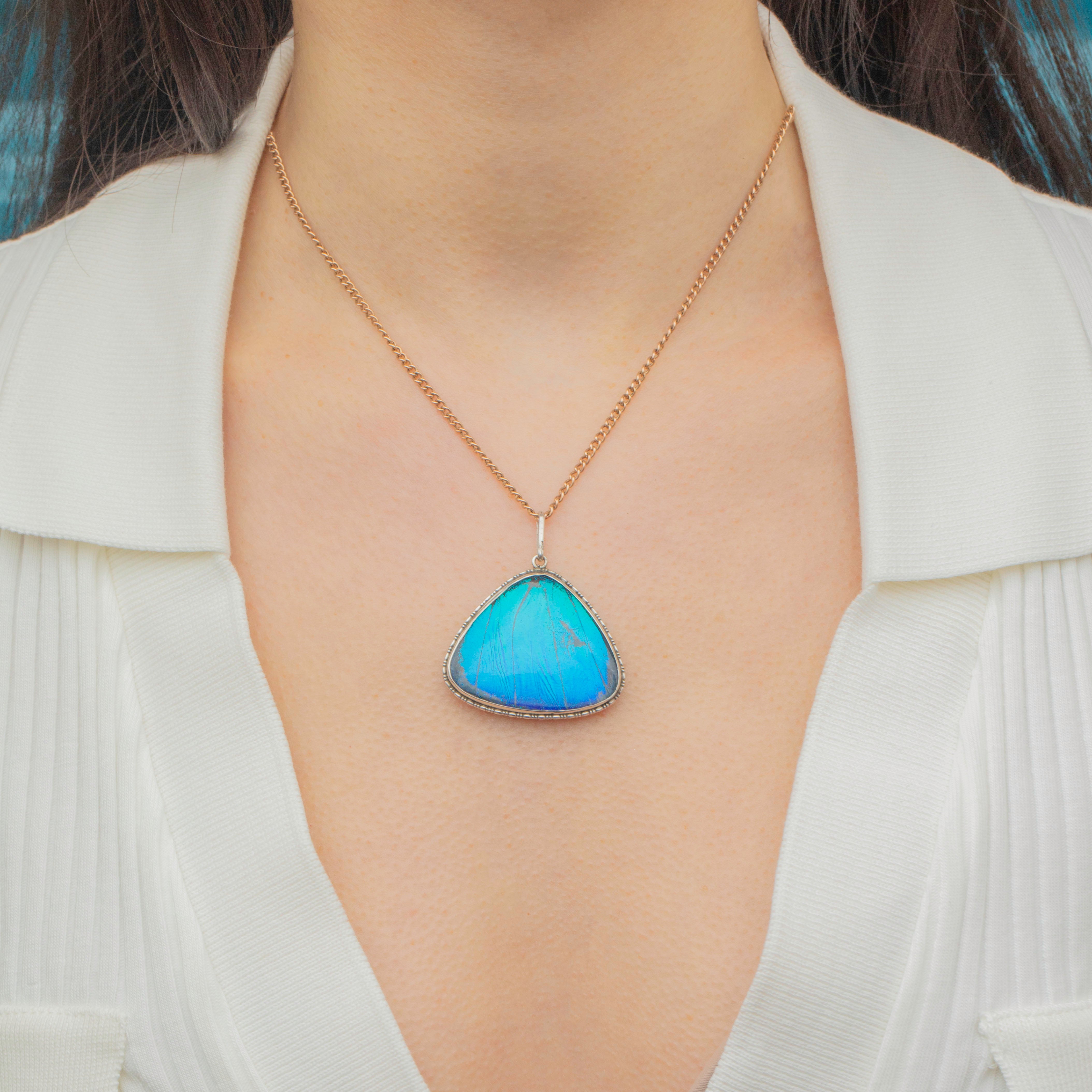 Radiating a vibrant cerulean hue, the Morpho butterfly wing catches the light wonderfully to reveal soft lilacs and flashes of green. She is set within glossy Silver settings and in quintessential Art Deco style, forms a triangular shape.