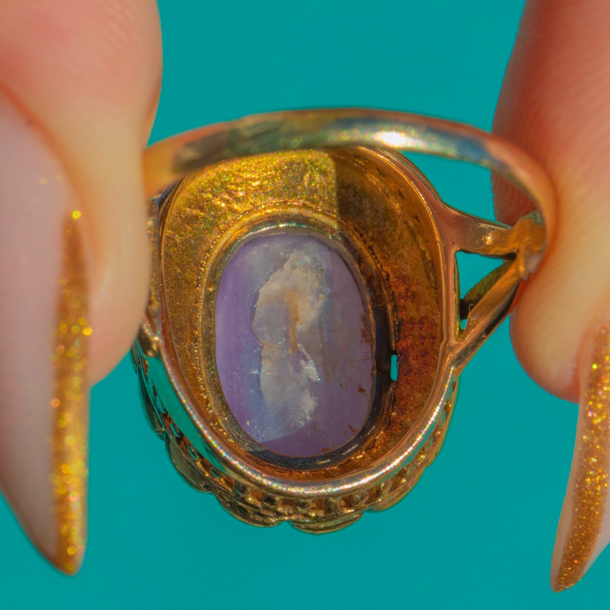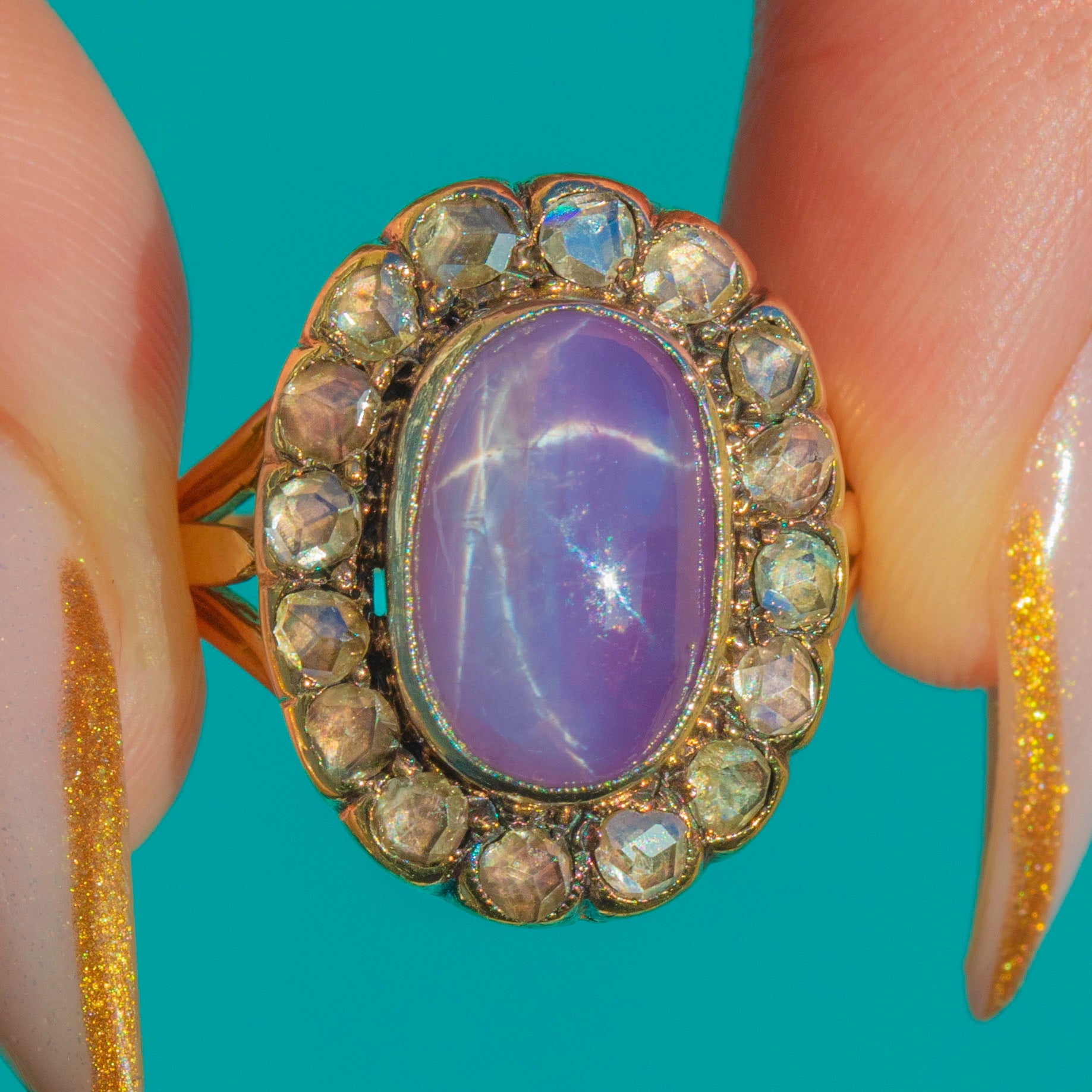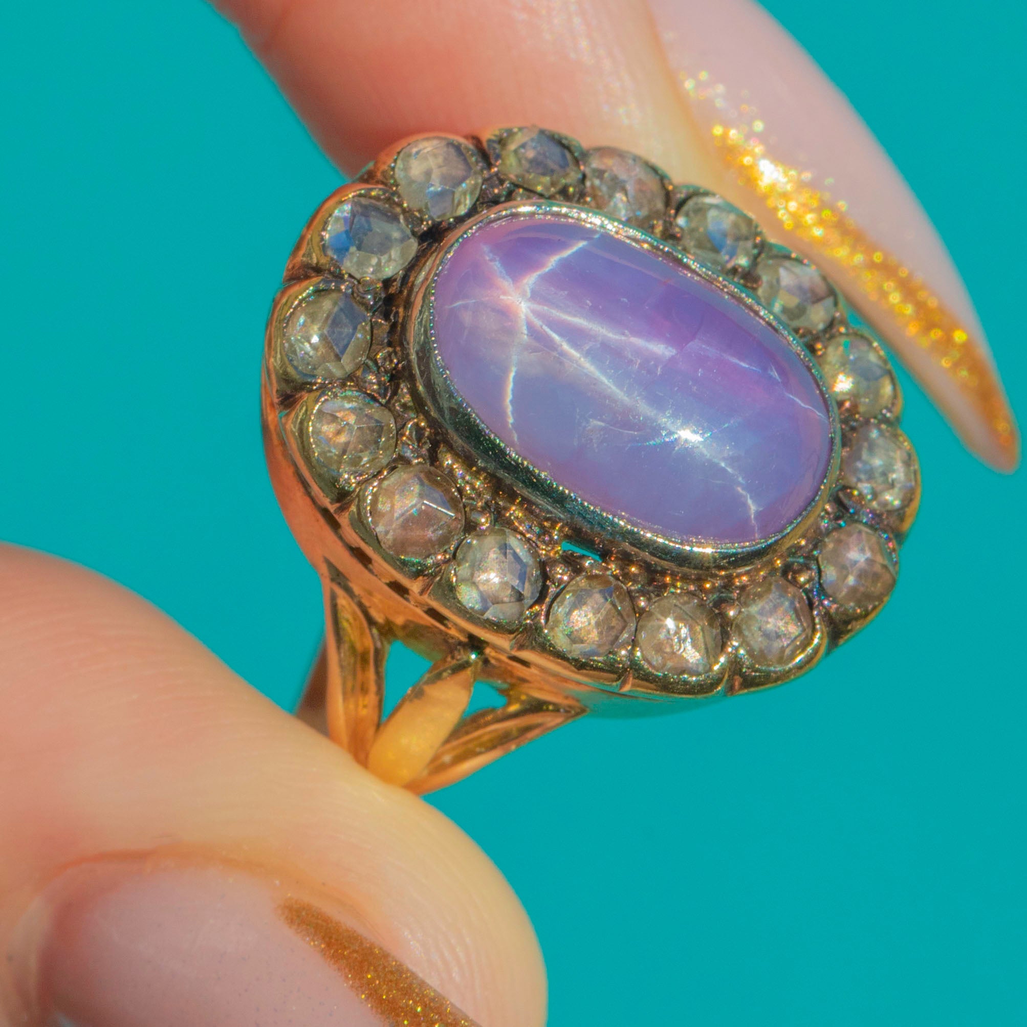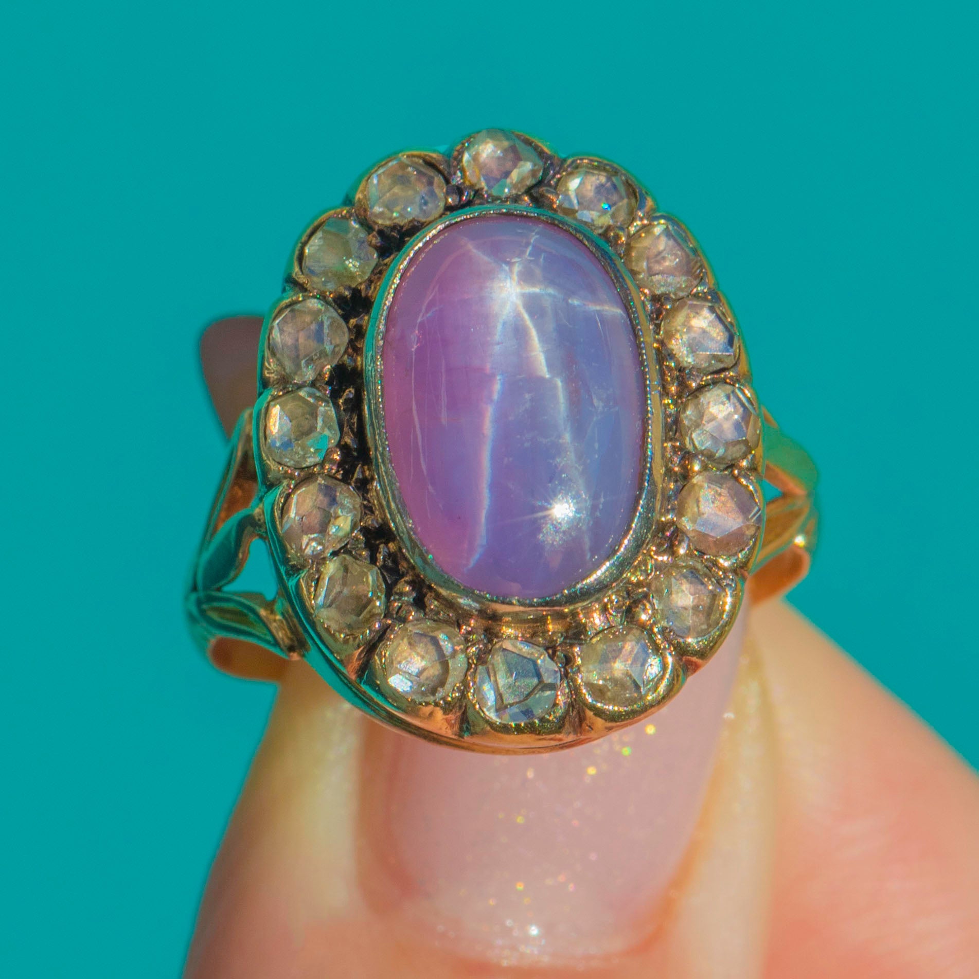 VERY GOOD TO EXCELLENT: The Star Ruby is beautifully preserved with a clear, visible star and smooth polish. The Rose-cut Diamonds are bright, secure in their settings, and show only light antique wear consistent with age. The Gold band and gallery are strong and well cared for, with no resizing marks and excellent structural integrity.