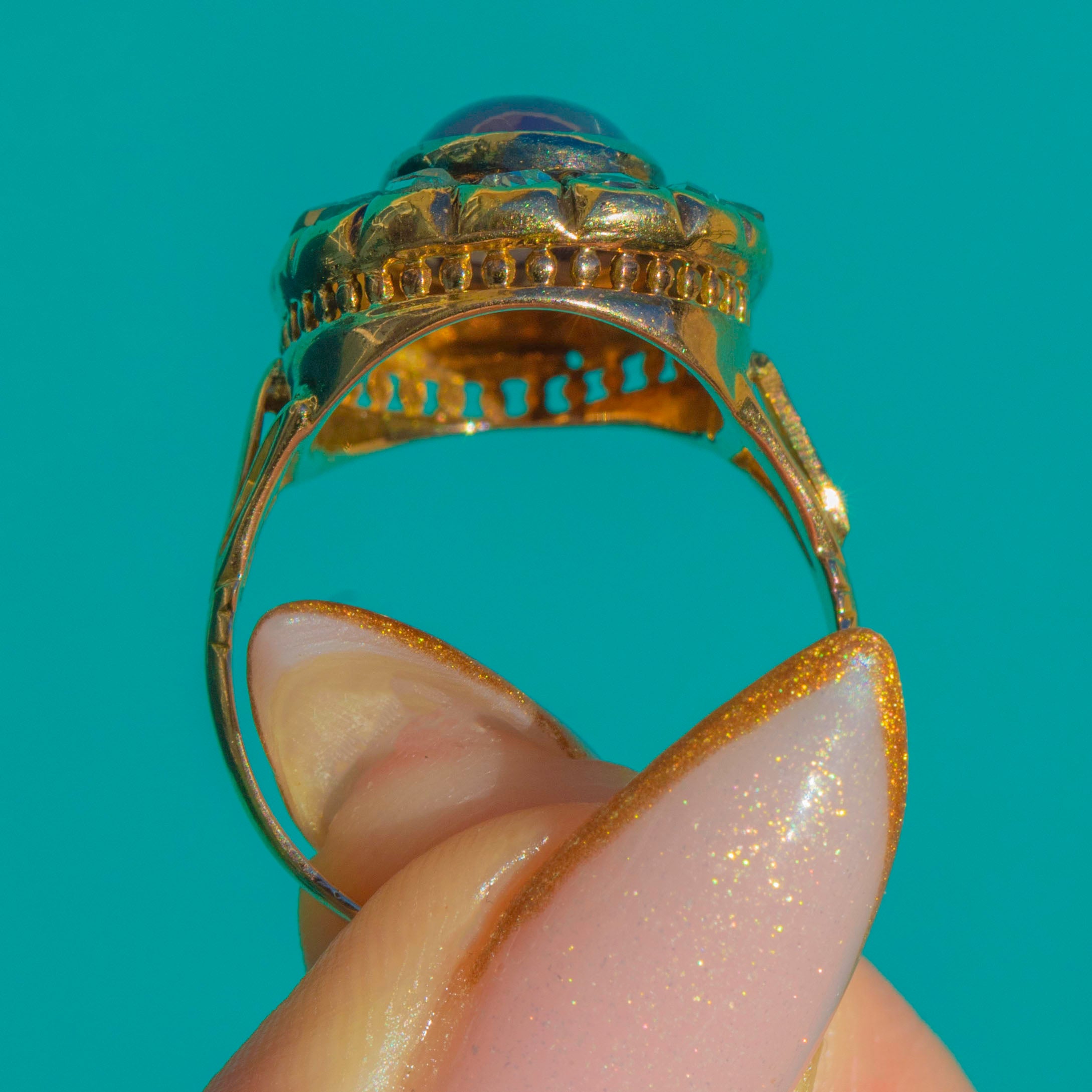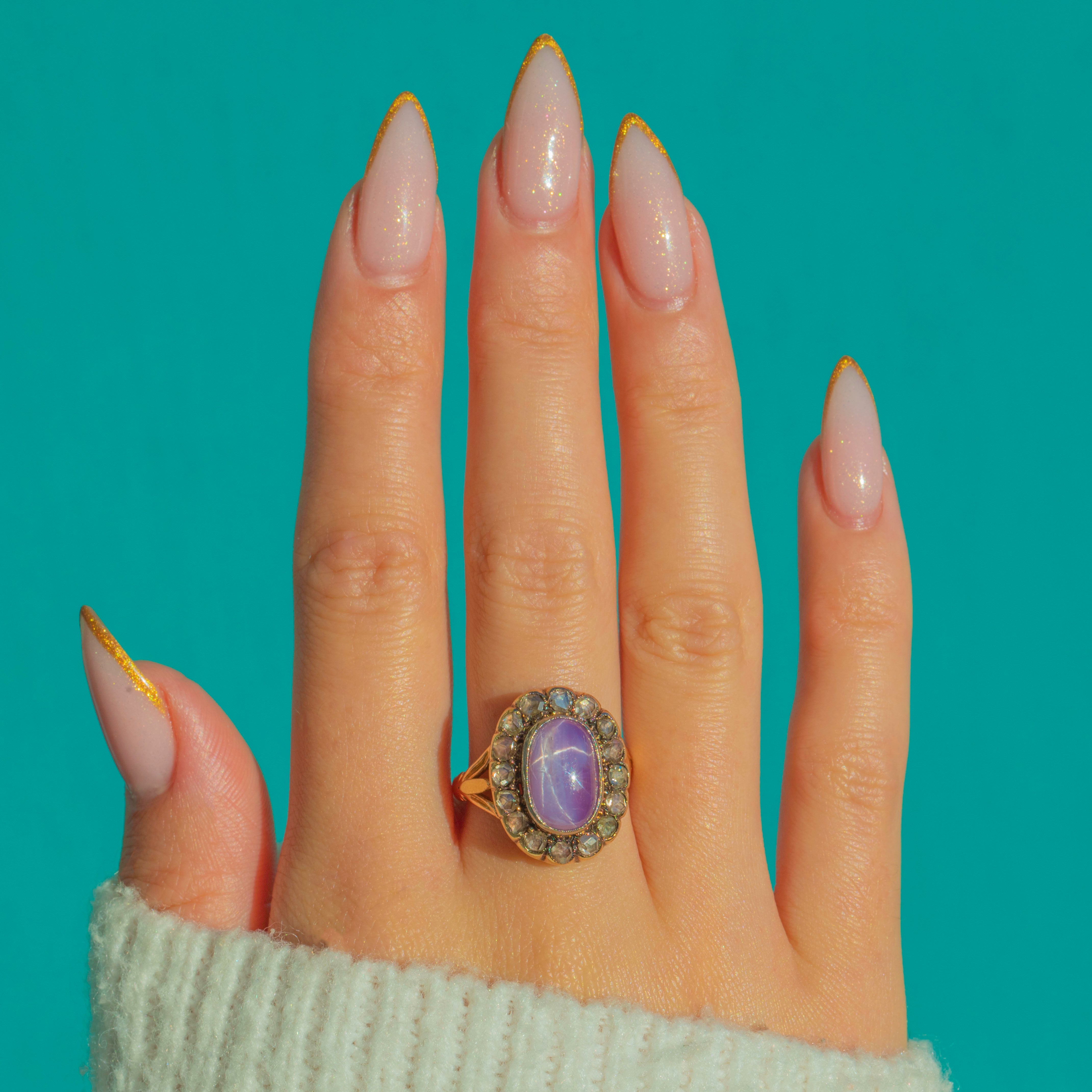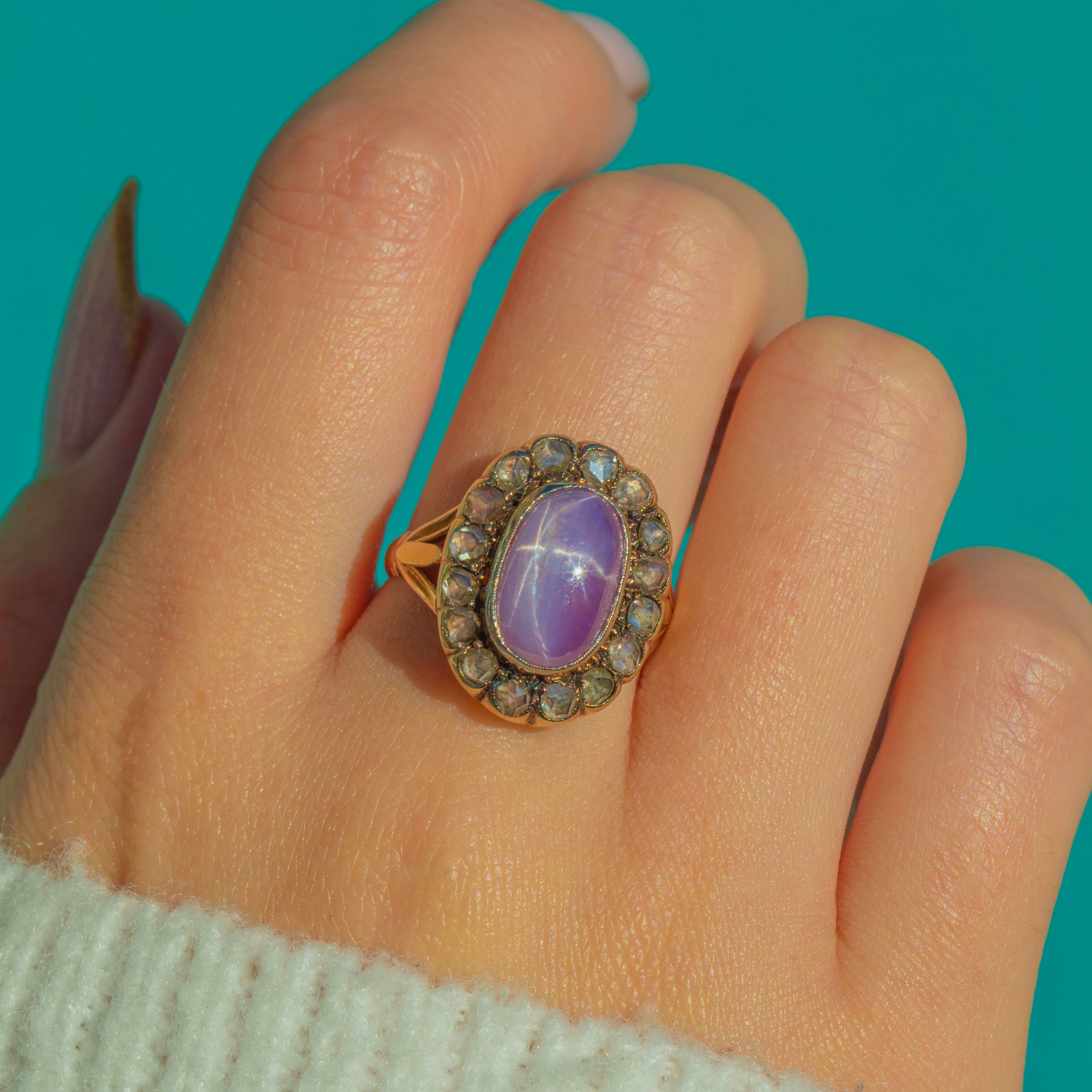 This Victorian cluster ring is a captivating display of celestial colour and antique craftsmanship. At its heart sits a luminous 1.60ct Star Ruby, revealing its distinctive asterism when it catches the light — a rare and magical natural phenomenon treasured by collectors. The Ruby’s rich hue is beautifully complemented by a halo of sparkling rose-cut Diamonds, each one individually hand-cut and full of antique charm.