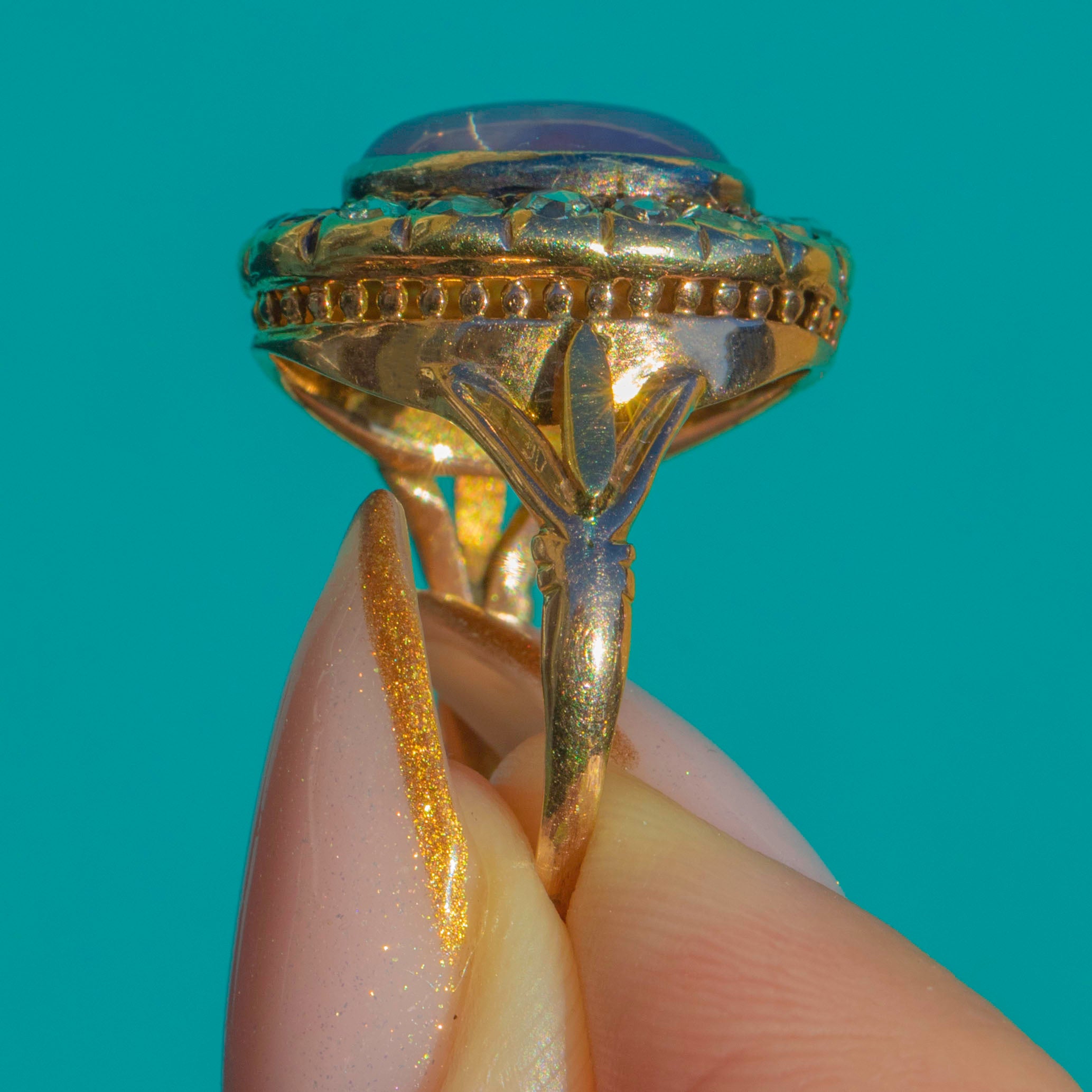 Crafted in tested 14ct Gold, the ring has a wonderfully decorative profile with a softly domed Ruby and an elegant raised gallery. The Diamonds encircle the central stone with gentle shimmer, creating a romantic and timeless halo silhouette. Regal, feminine, and full of Victorian character, it’s a standout jewel for any antique lover.
