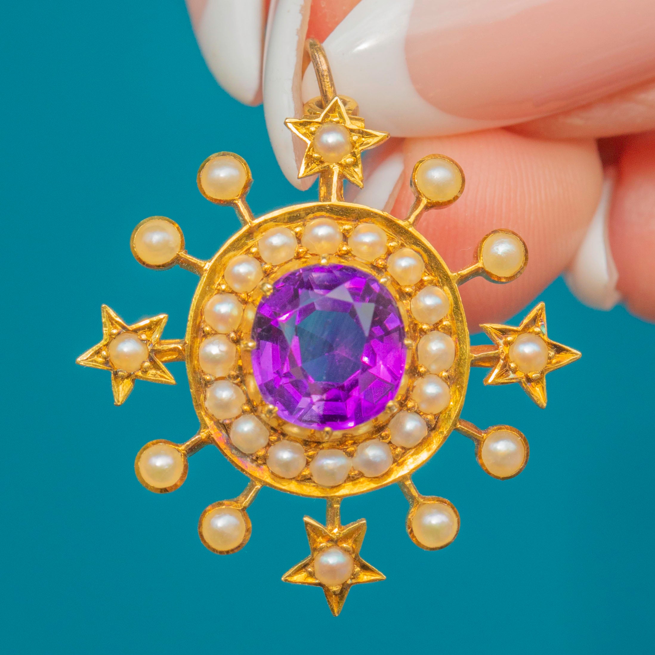 Victorian 15ct Gold Amethyst & Pearl Starburst Pendant, c.1880