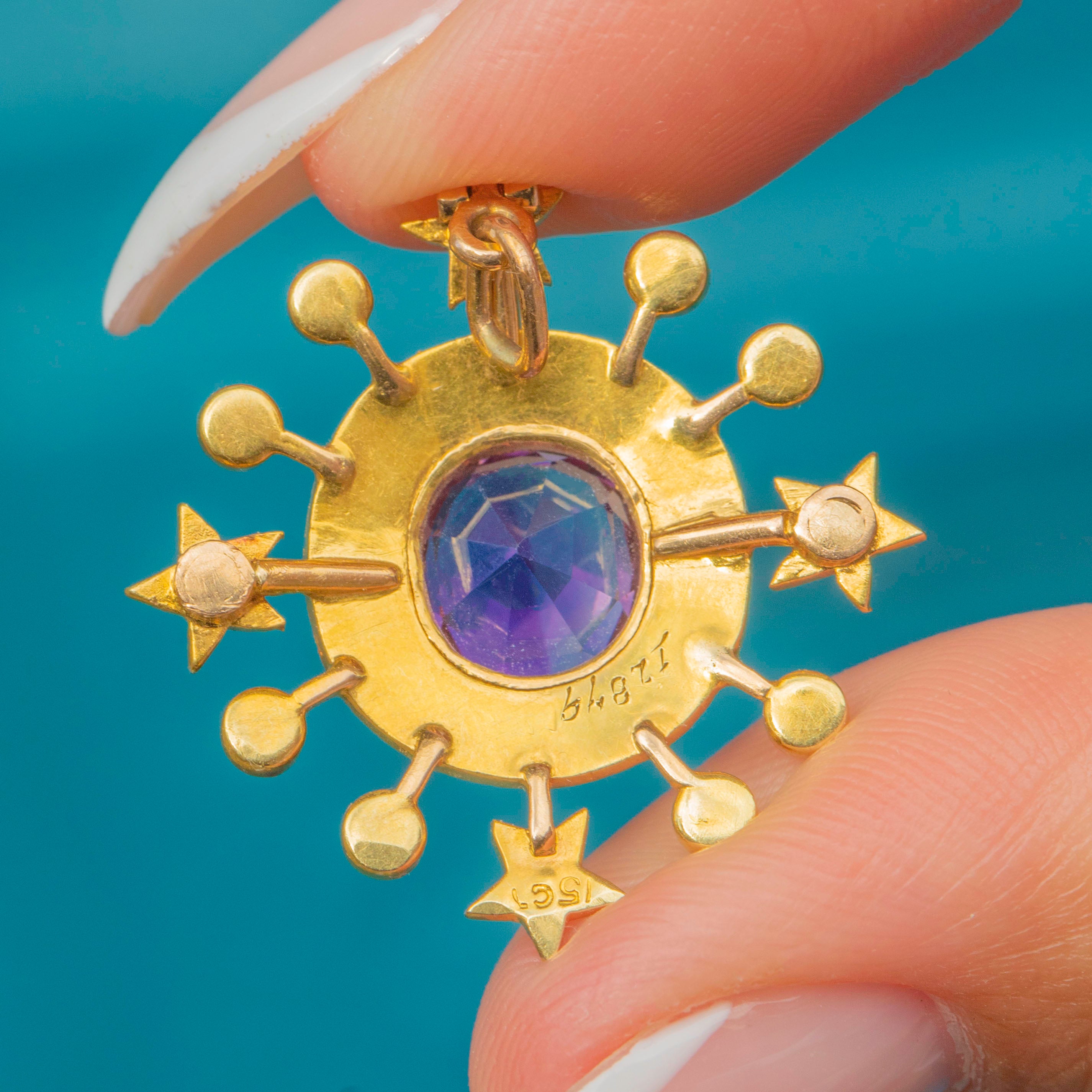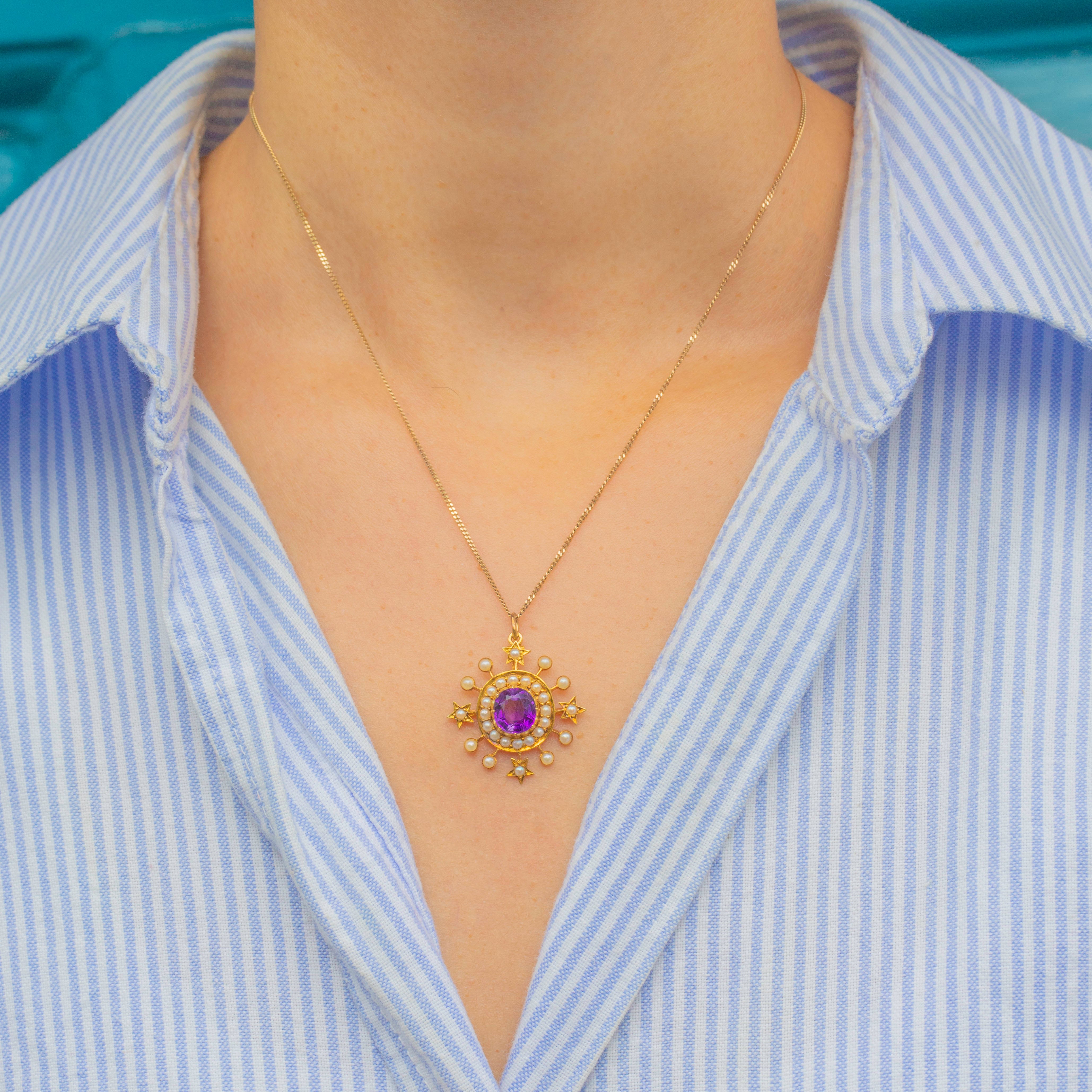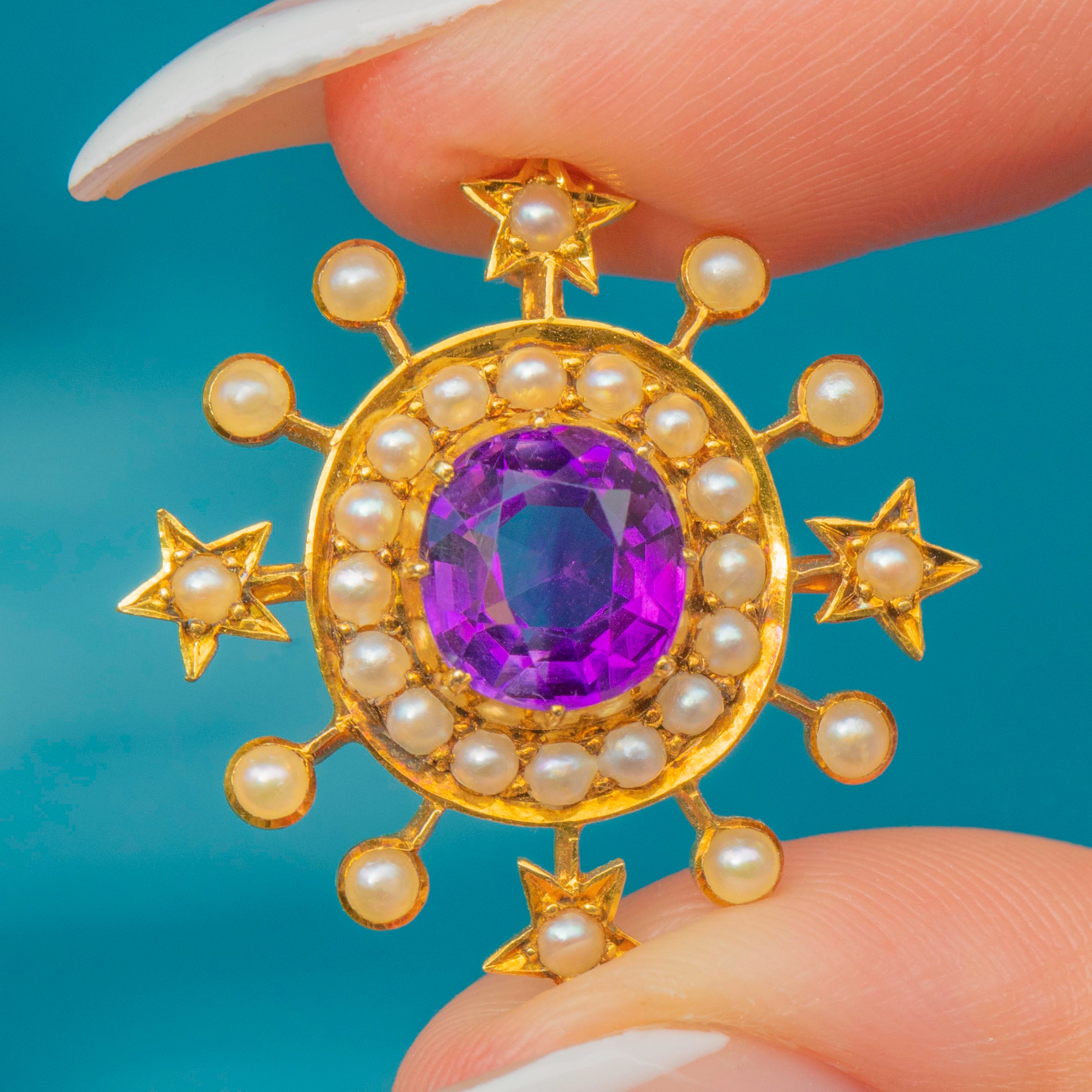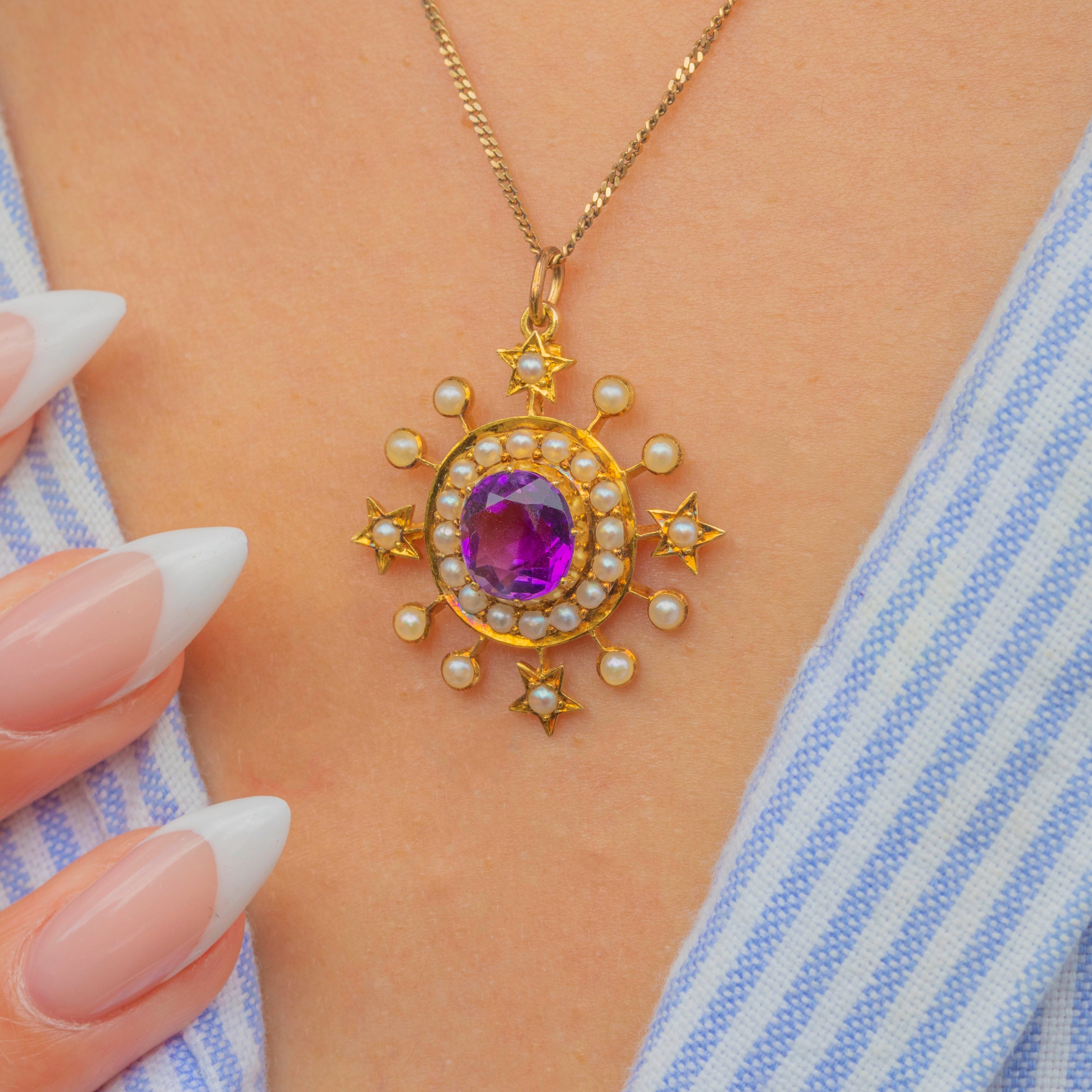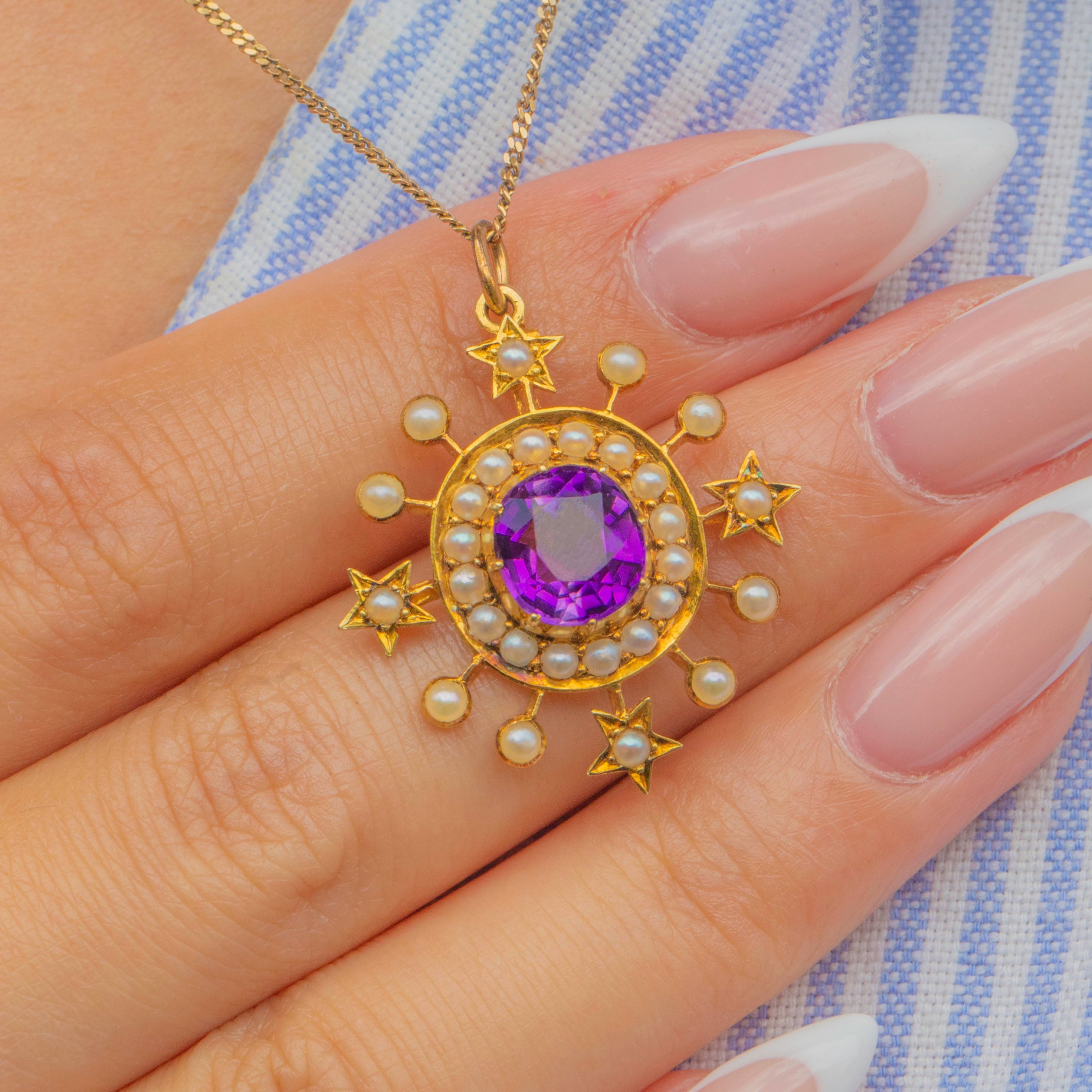 A vibrant late Victorian starburst pendant in 15ct Gold, centring on a richly coloured oval Amethyst framed by a halo of natural Pearls. Radiating outwards are alternating golden rays and star motifs, each tipped with lustrous Pearls, giving this jewel its celestial presence and unmistakable Victorian charm.