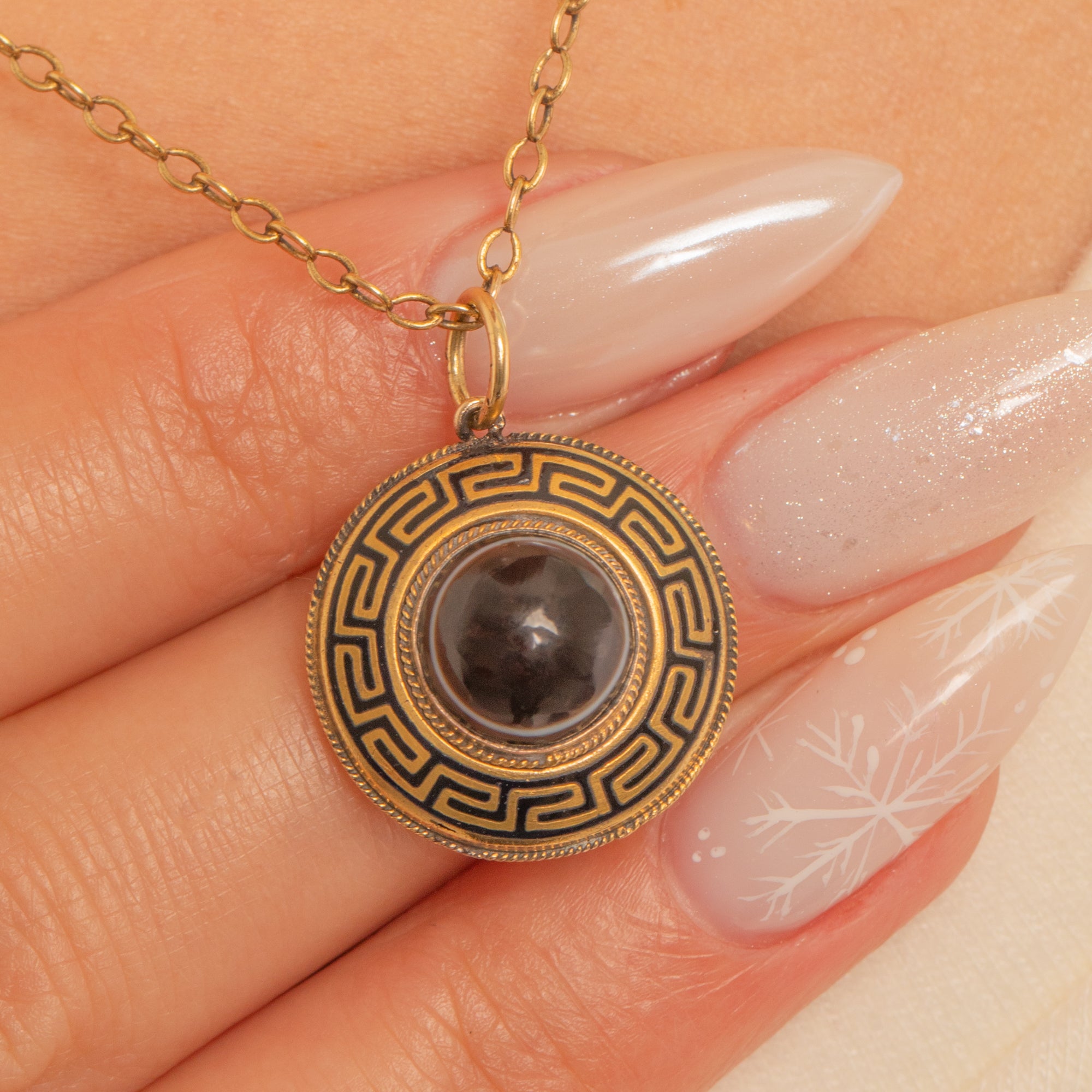 At the centre sits a glossy Banded Agate in a smooth bezel setting, its high domed profile giving wonderful depth and contrast against the inky Enamel. A timeless design with elegant presence, perfect to elevate your favourite chain.