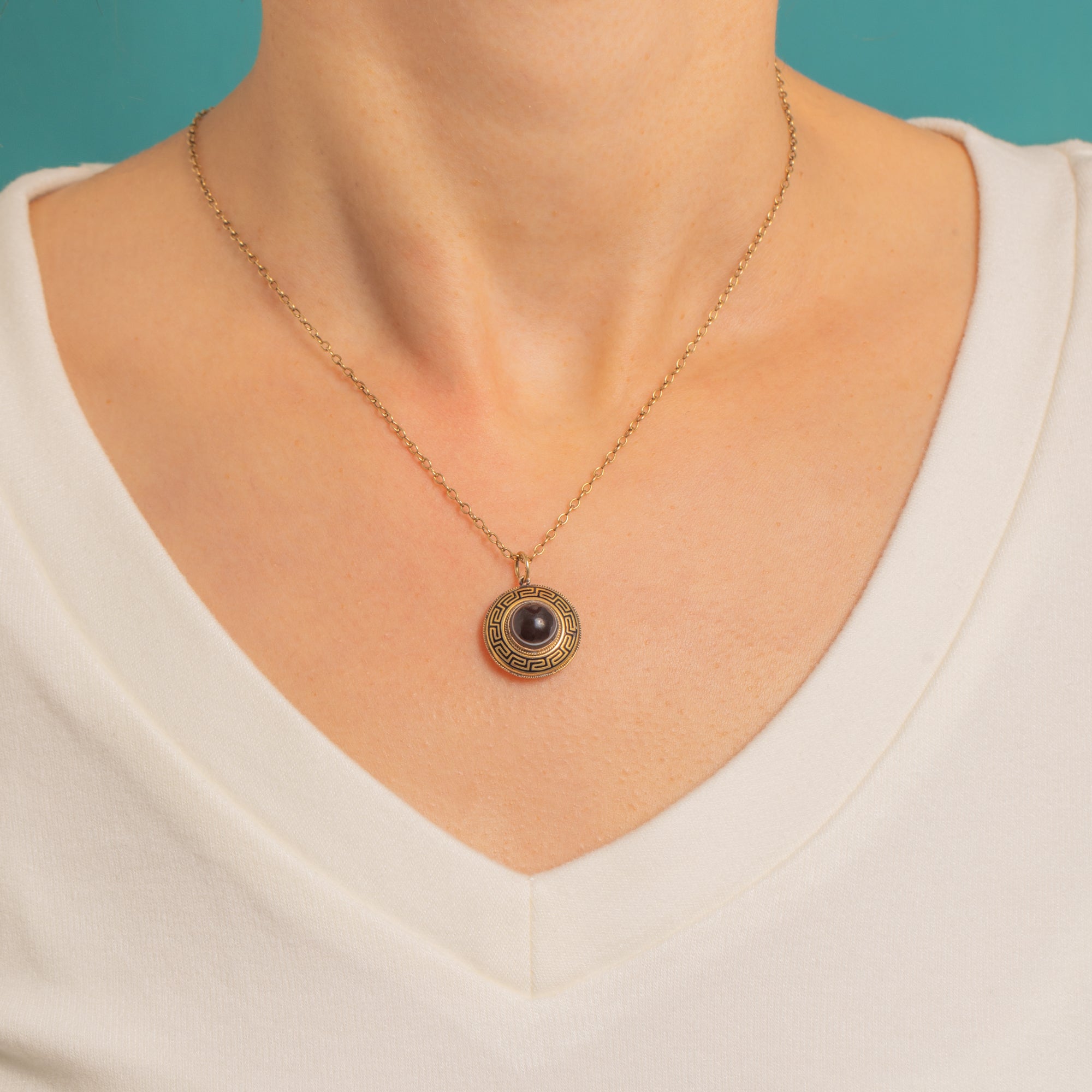 Bold and beautifully graphic, this Victorian charm pendant is crafted in rich 15ct Gold and framed by a crisp black Enamel Greek‑key meander. Fine rope‑twist borders add delicate texture, while the architectural motif brings a chic Neo‑Grec flair.