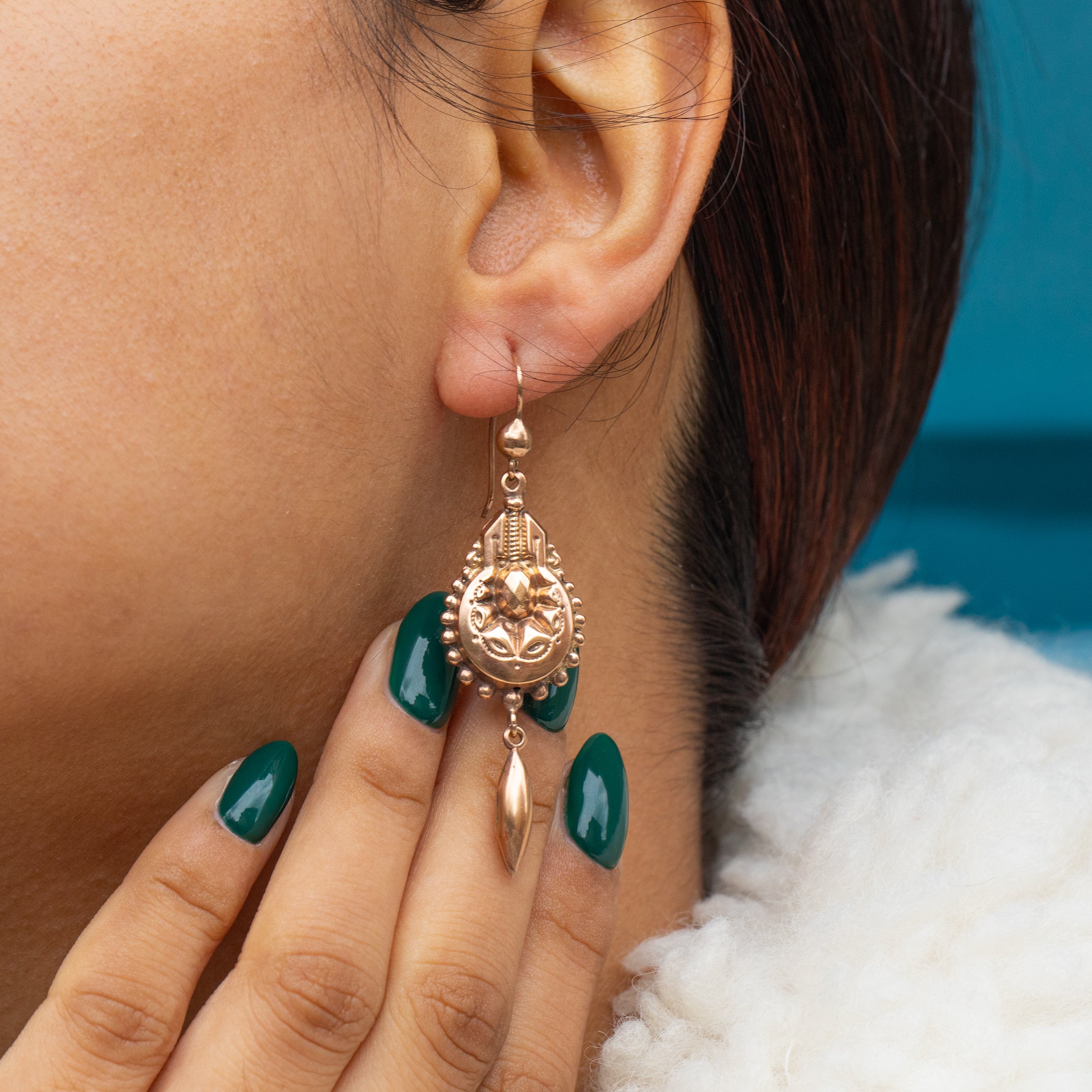 These exquisite Victorian 15ct Gold drop earrings exude timeless elegance and charm. Crafted with meticulous attention to detail, each earring features intricate details perfectly capturing the Victorian era's opulent design aesthetic.