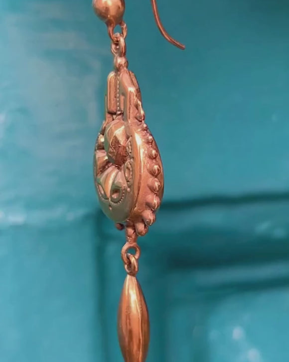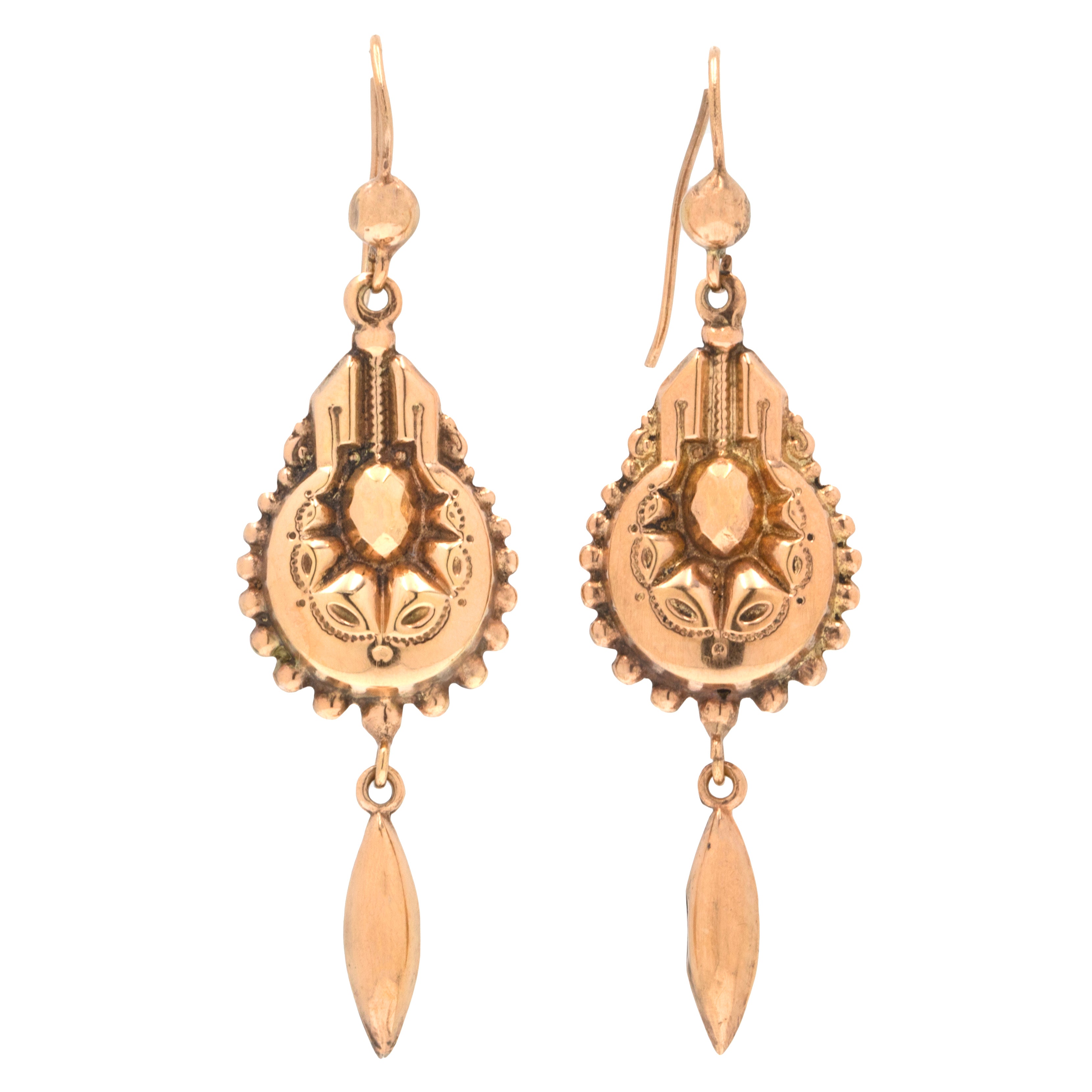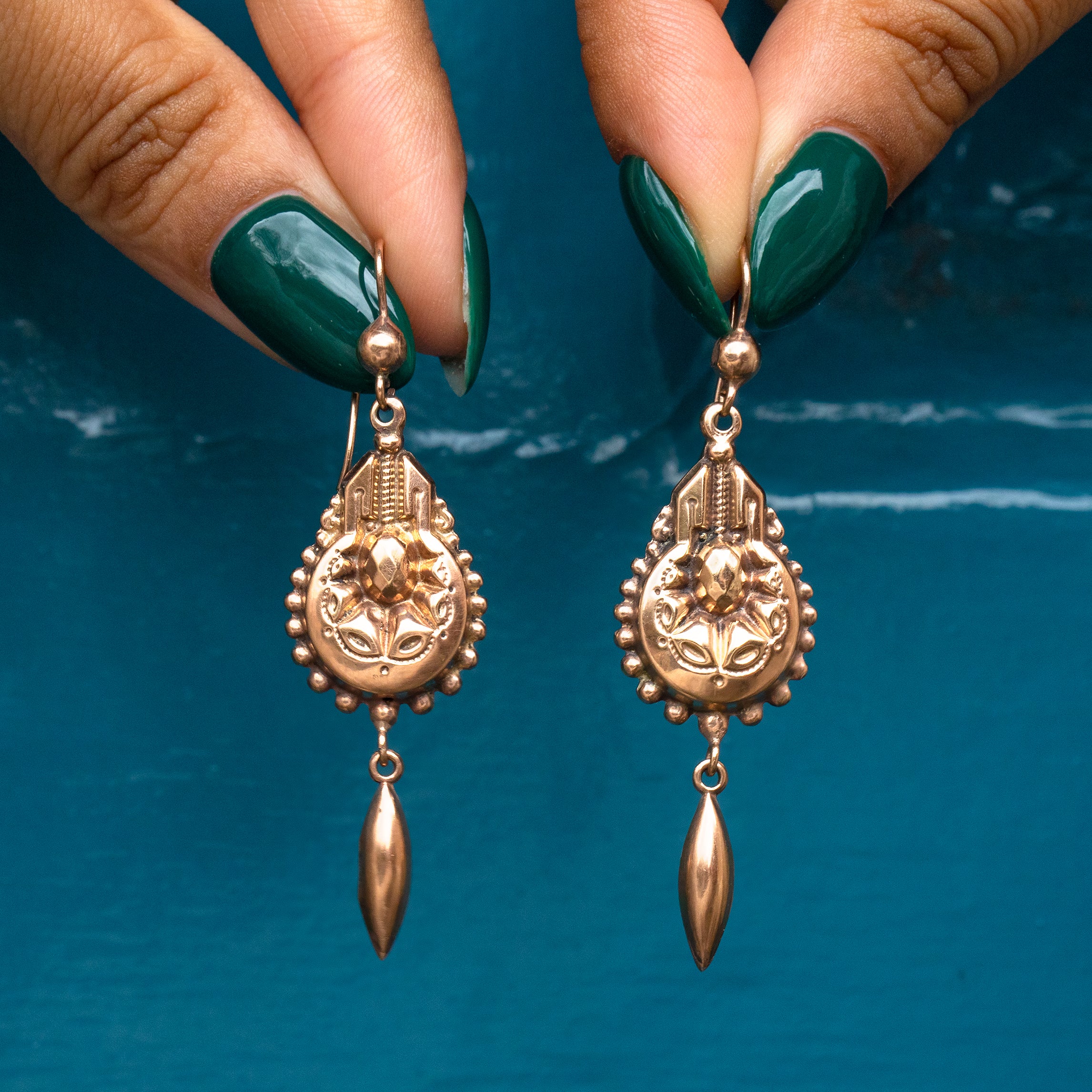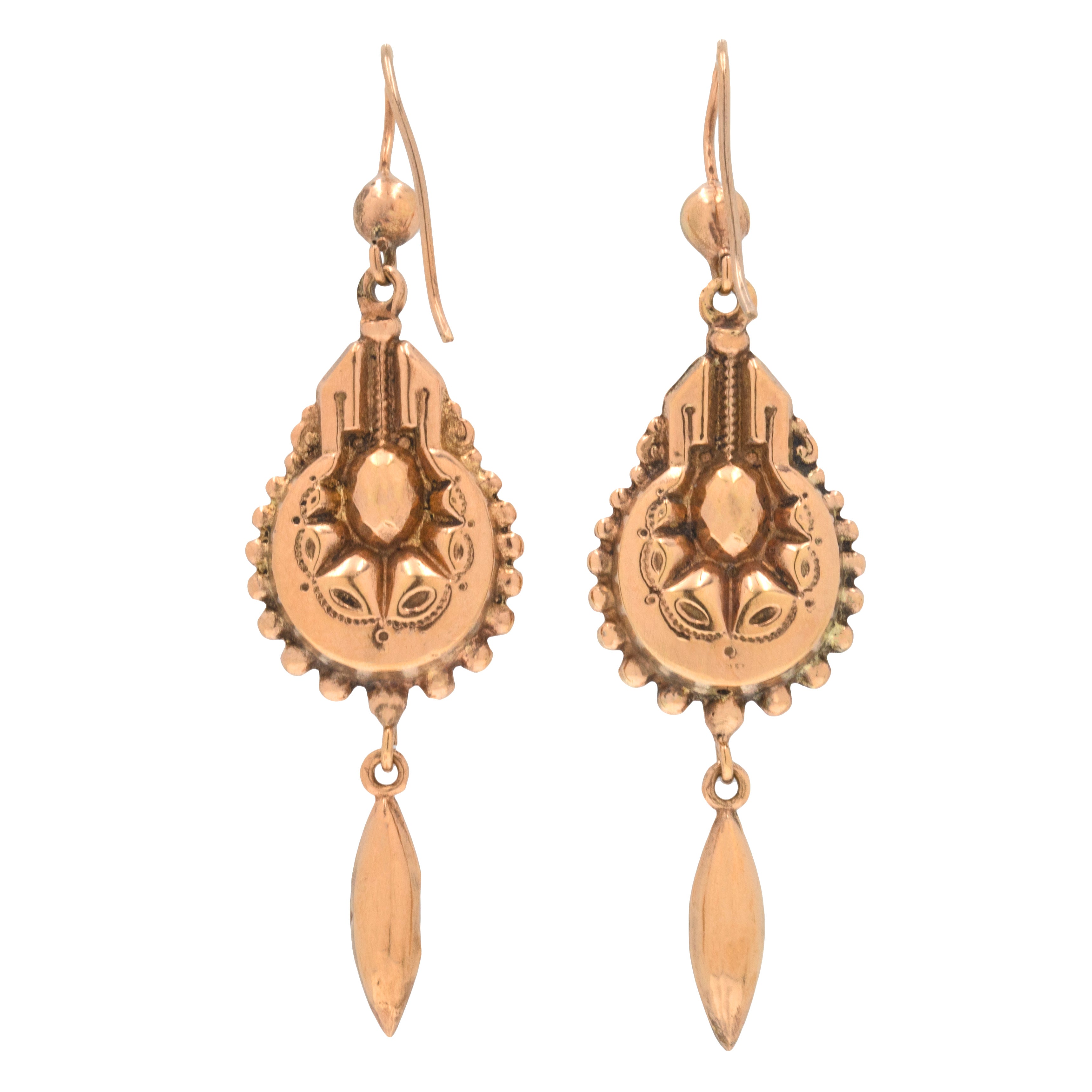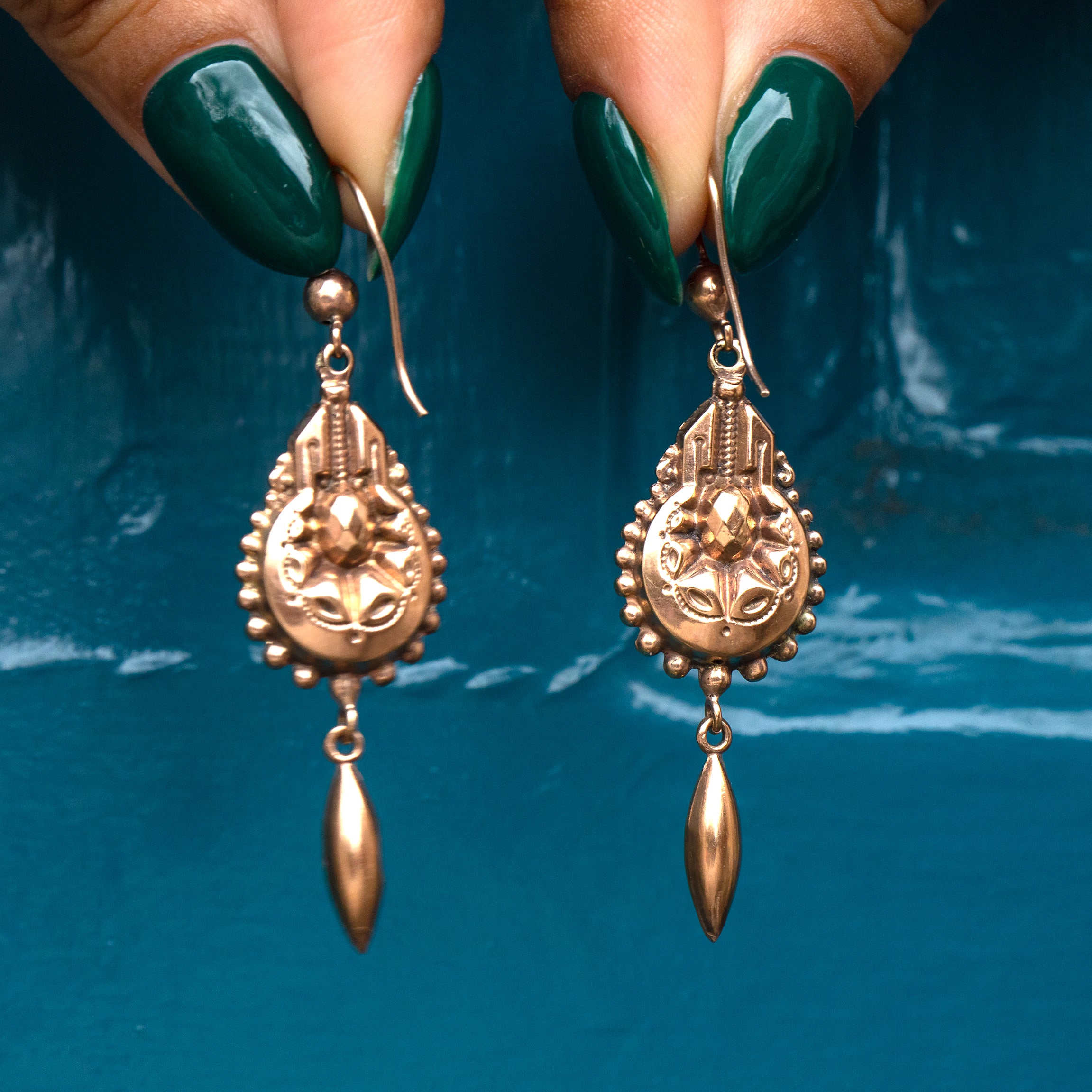 VERY GOOD. These Victorian 15ct Gold drop earrings are offered in very good condition. The Gold is bright and lustrous and all of the details have remained crisp. There are a few minor dings on the base of the earrings, commensurate with age, but this is only noticeable under close inspection and cannot be seen when worn. Each component is securely affixed and the generous hooks allow for easy and comfortable wear. These spectacular antique Gold earrings will make a welcome addition to your collection!