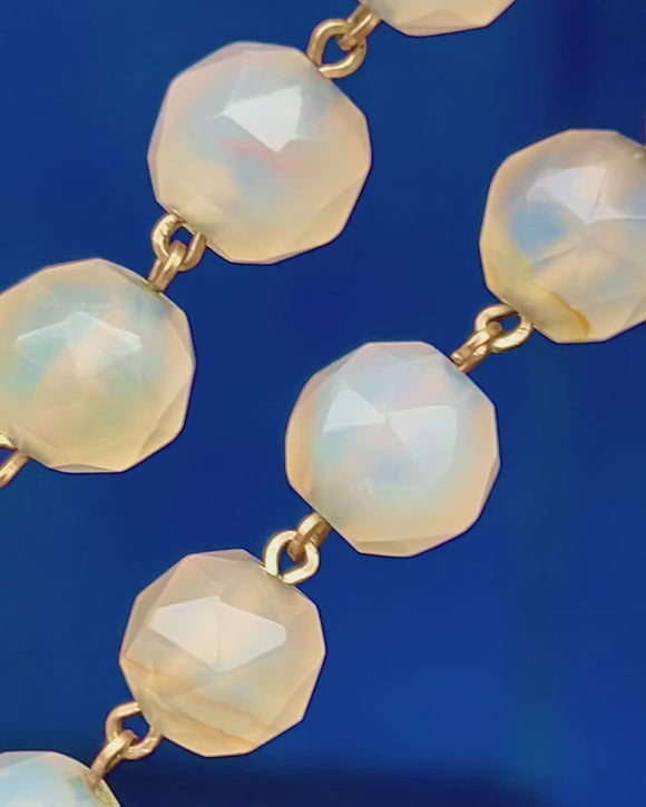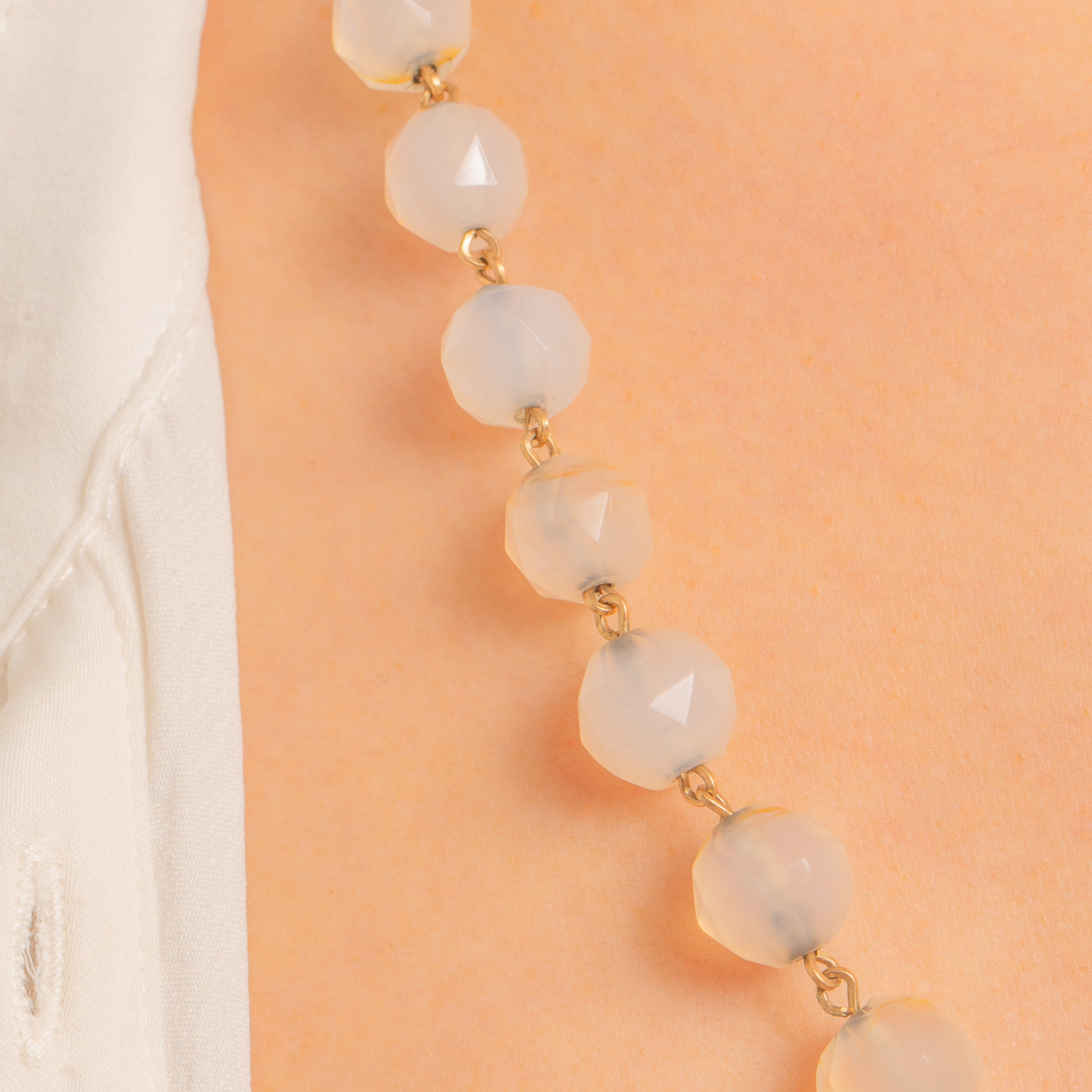 Diese romantische Victorian-Kette besteht aus sanft schimmernden weißen Chalcedon-Perlen, die jeweils facettiert sind, um das Licht mit einem zarten, nebligen Glanz einzufangen. Die Perlen verlaufen harmonisch in der Größe und verleihen dem Schmuckstück einen anmutigen Rhythmus sowie eine elegante Bewegung beim Tragen.
